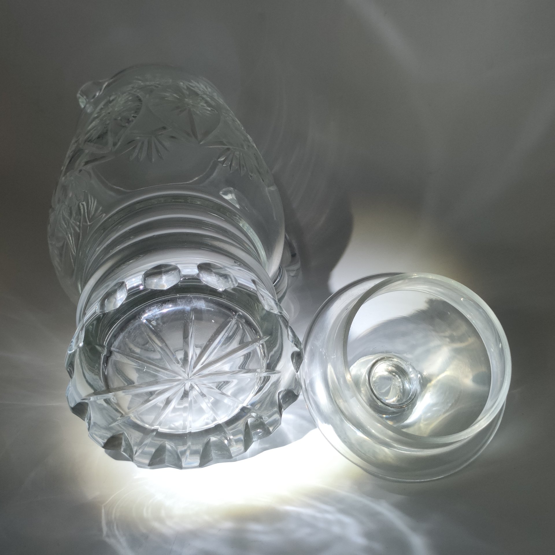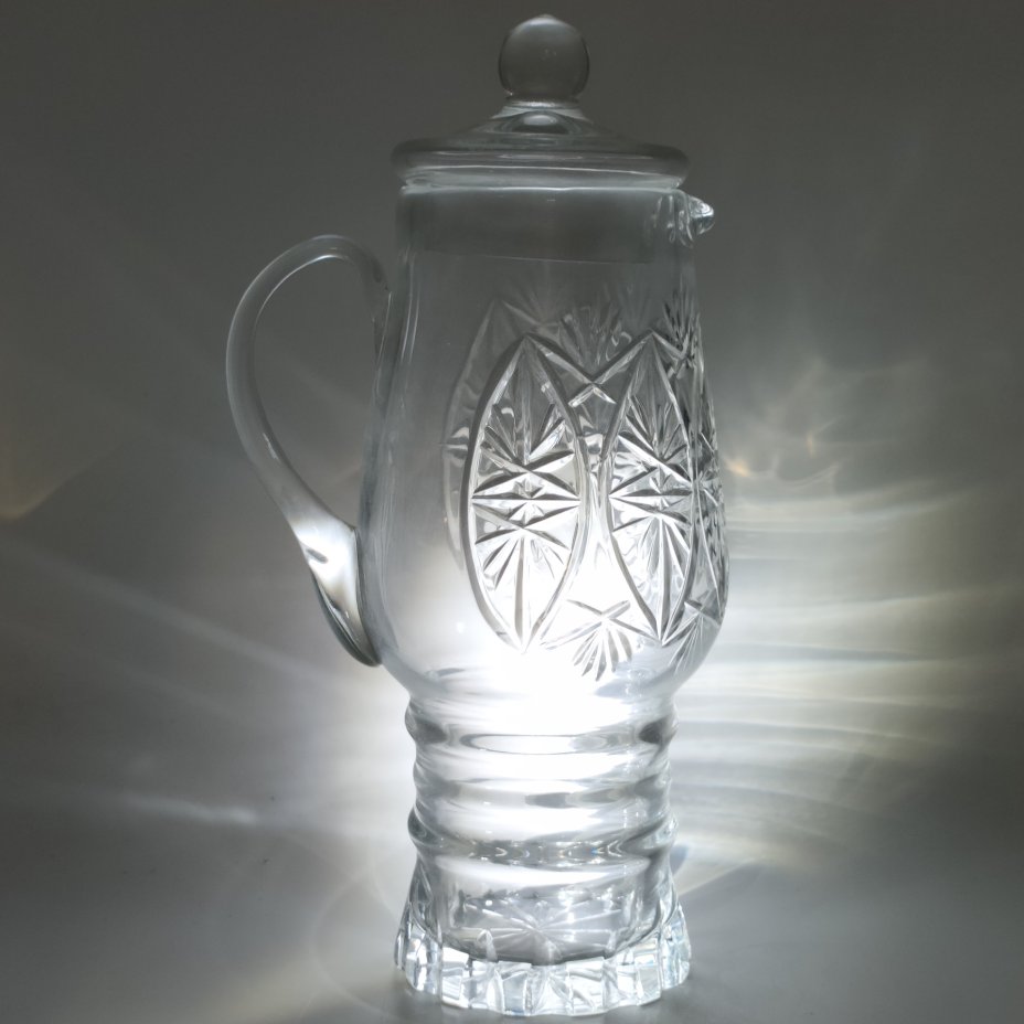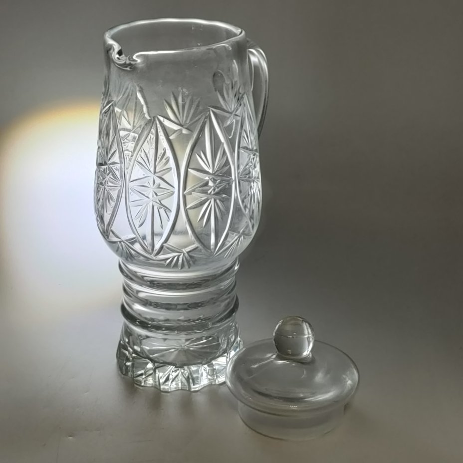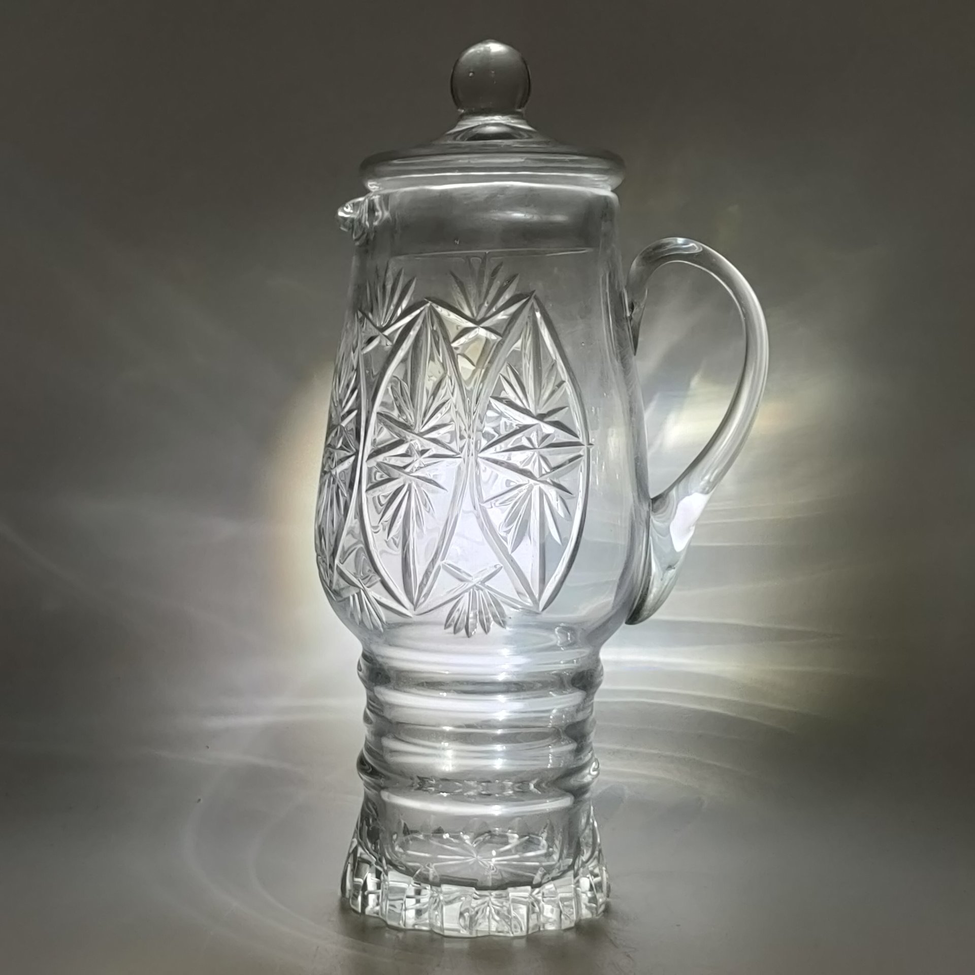Кувшин для напитков с крышкой, украшенный рельефным декором, стекло, алмазная грань, СССР, 1960-1990 гг.