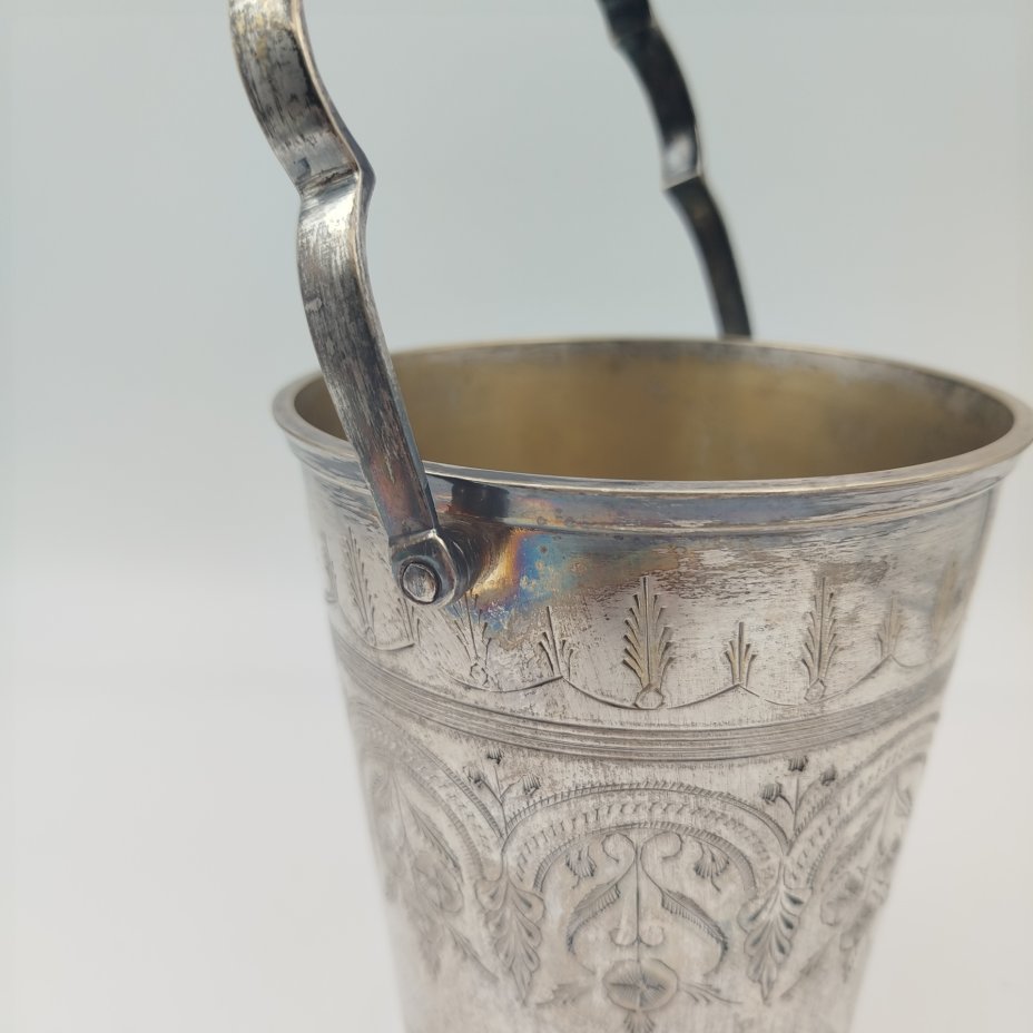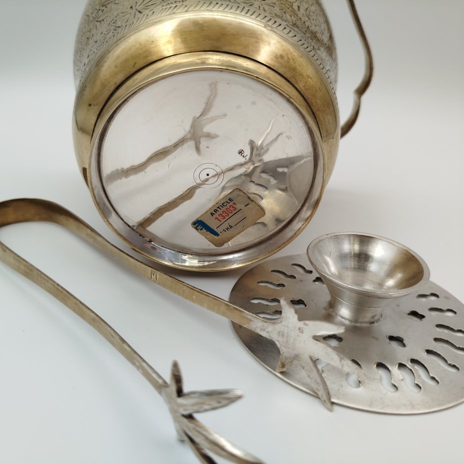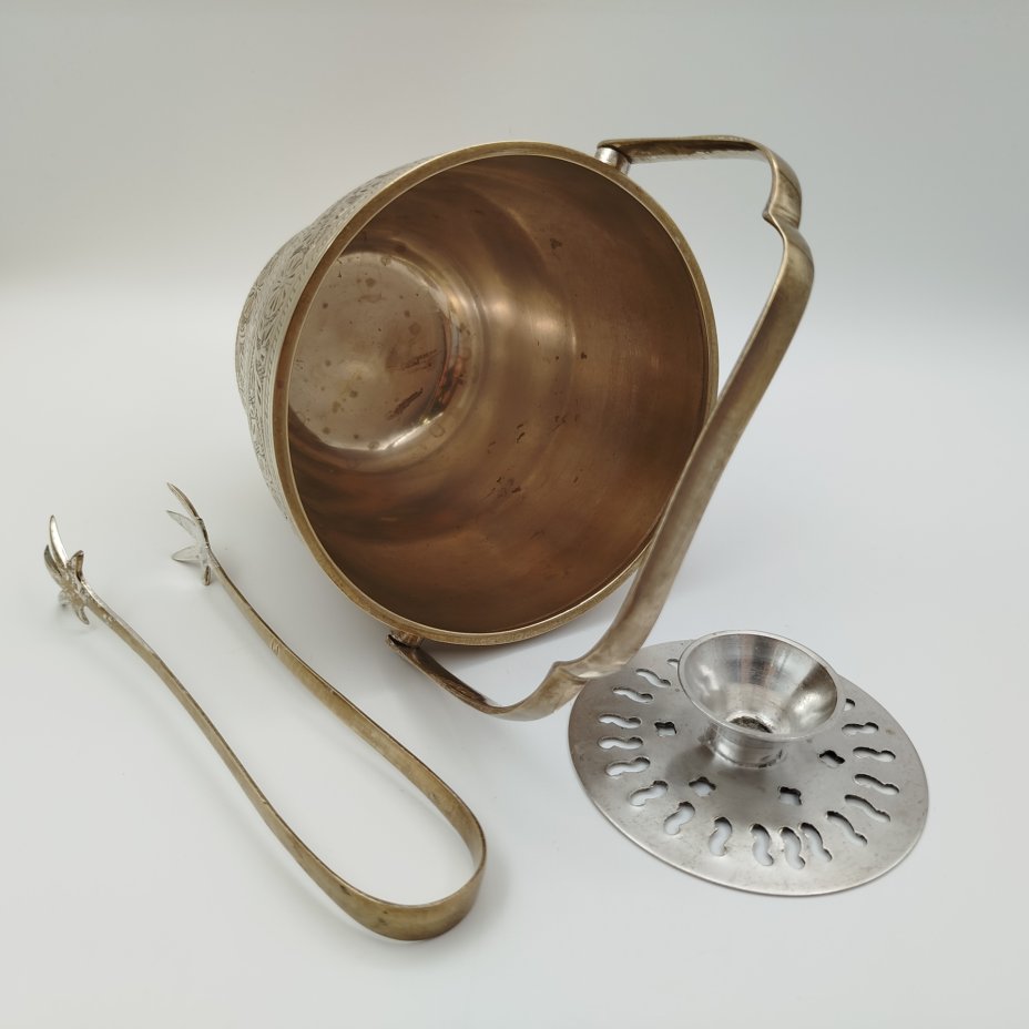 Ведерко для льда с орнаментальным декором в восточном стиле, щипцы в комплекте, латунь, серебрение, гравировка, Индия, 1970-1990 гг.