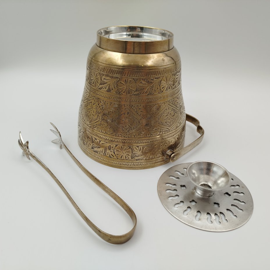 Ведерко для льда с орнаментальным декором в восточном стиле, щипцы в комплекте, латунь, гравировка, Индия, 1970-1990 гг.