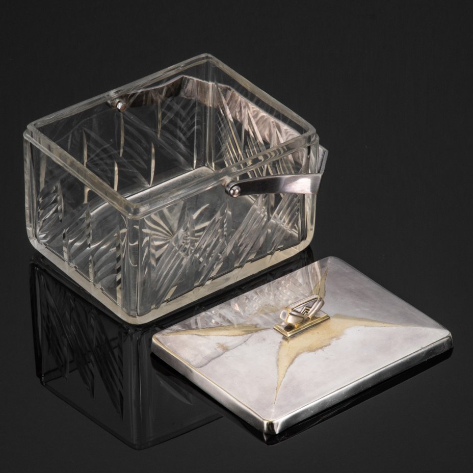 Бисквитница/конфетница с крышкой и резным туловом, Ercuis, стекло, резьба, сплав металлов, Франция, 1900-1920 гг.