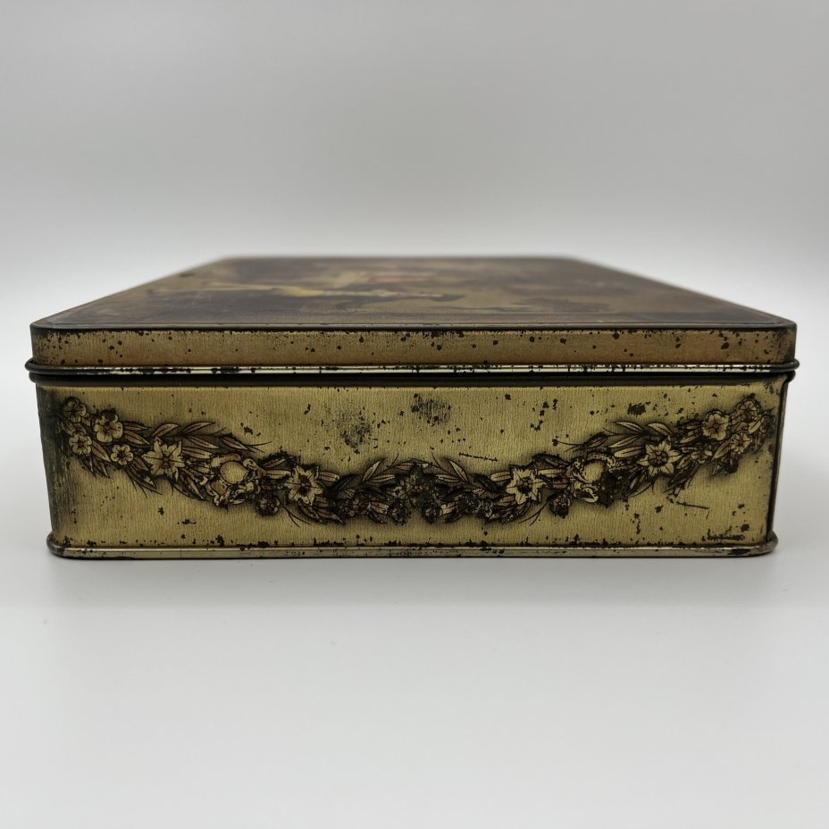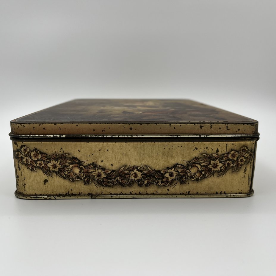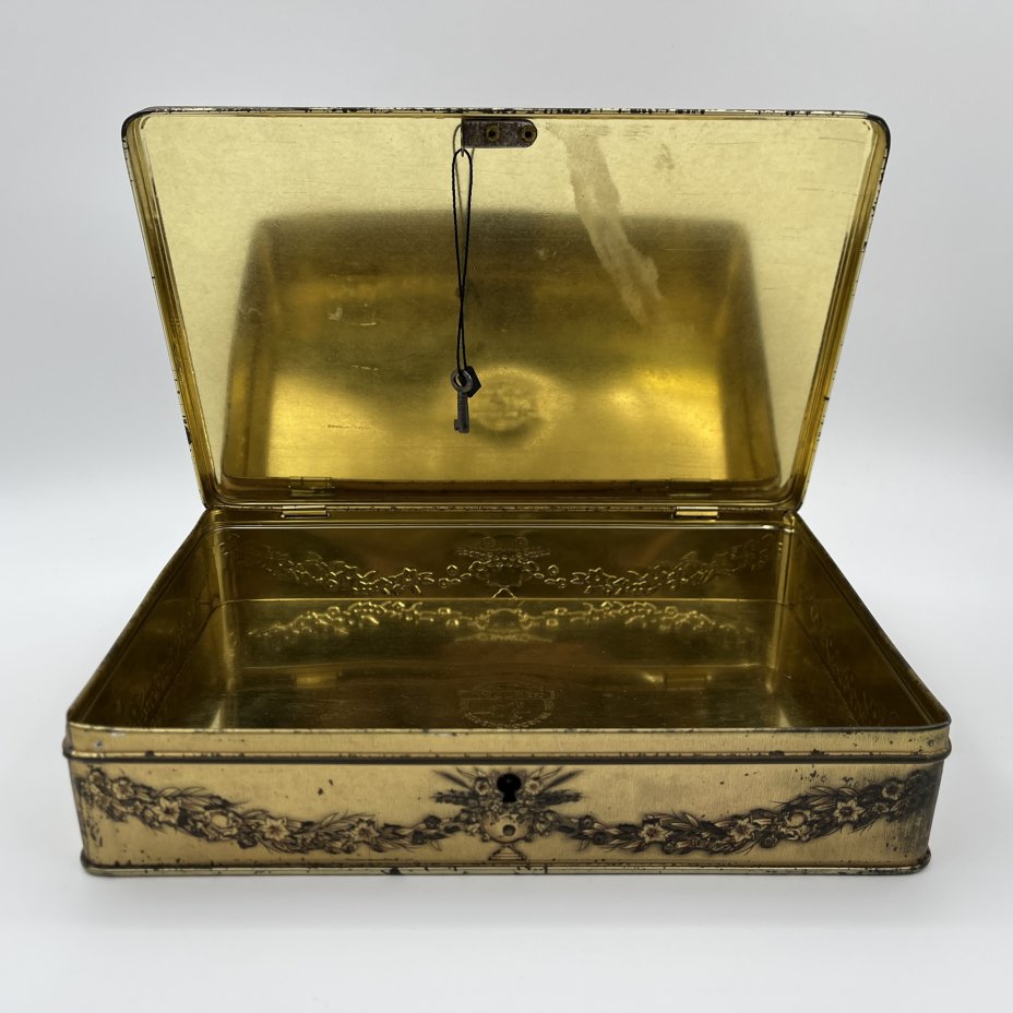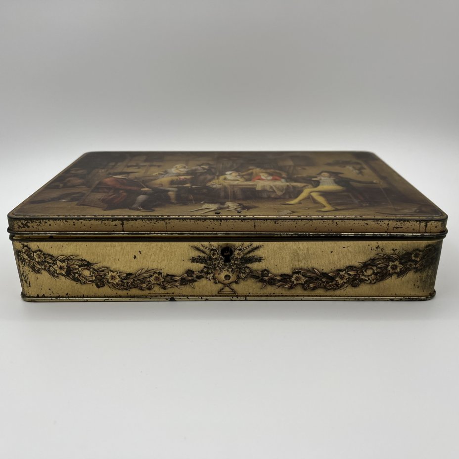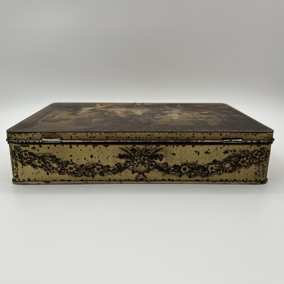Коробка подарочная (с ключом) Jacoues SuperChocolat, украшенная хромолитографией картины Жана-Батиста Маду "Вопрос судьбы", металл, Бельгия, 1920-1950 гг.