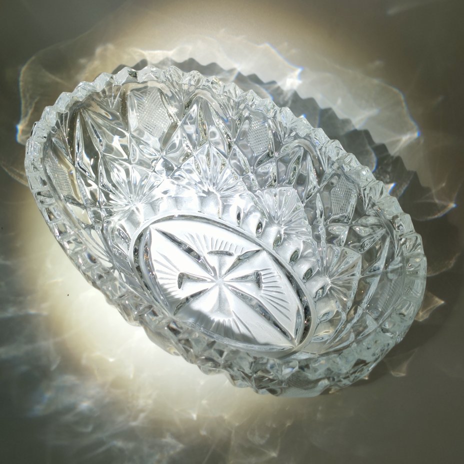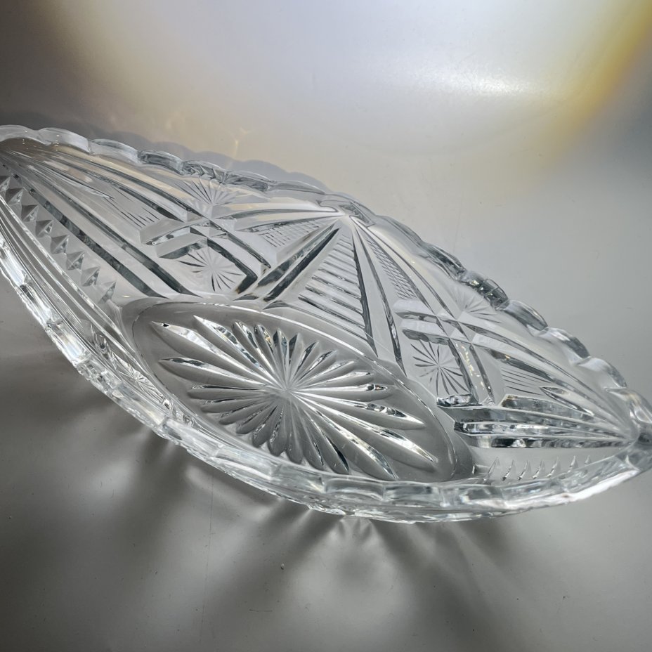 Конфетница (салатник) овальной формы с резным декором, хрусталь, алмазная грань, СССР, 1970-1990 гг.