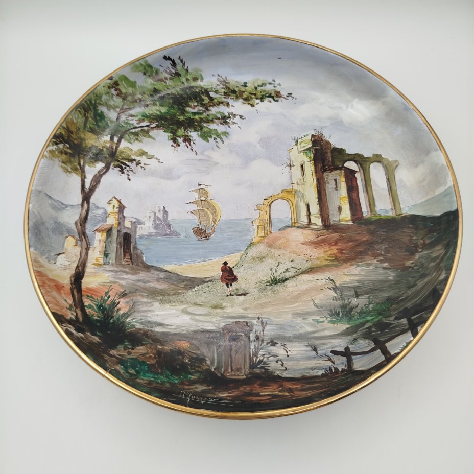 купить Тарелка настенная "Пейзаж с парусником", Richard Ginori, керамика, роспись, золочение, Италия, 1970-1990 гг.
