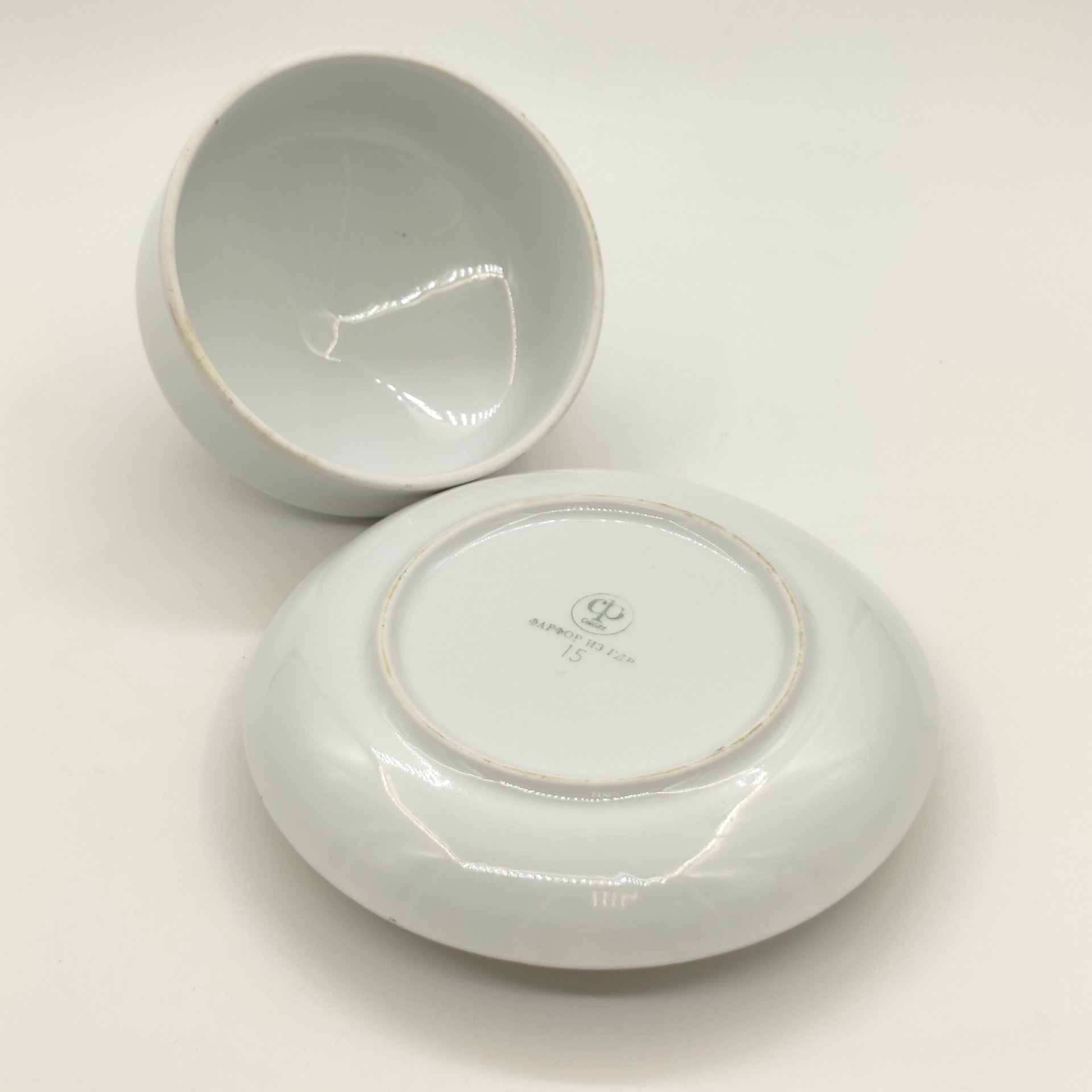 Масленка округлой формы с геометрическим декором, фарфор, деколь, золочение, крытье, Довбышский фарфоровый завод (Довбыш), СССР, 1957-1970 гг.
