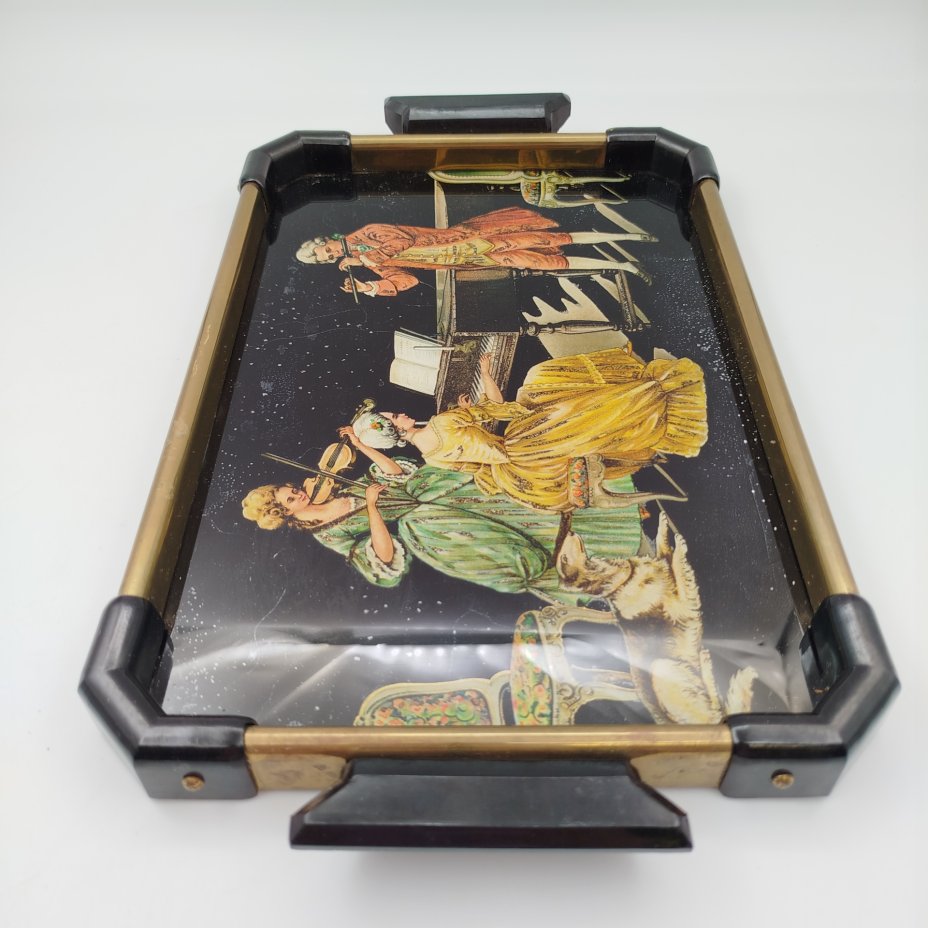 Купить Поднос прямоугольной формы с витыми ручками "Райская птица", дерево, оргстекло, роспись, золочение, сплав металлов, Европа, 1950-1970 гг.