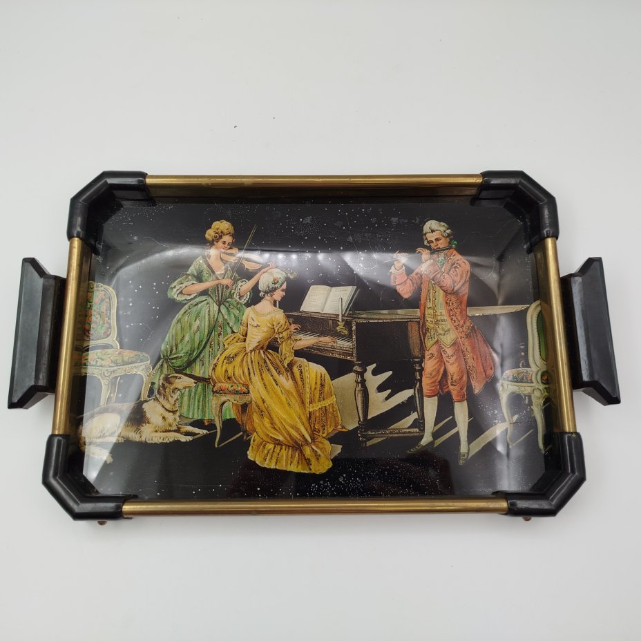 Небольшой поднос/подставка в металлической оправе, украшенный изображениями всадников, керамика, Металл, дерево, Европа, 1920-1950 гг.