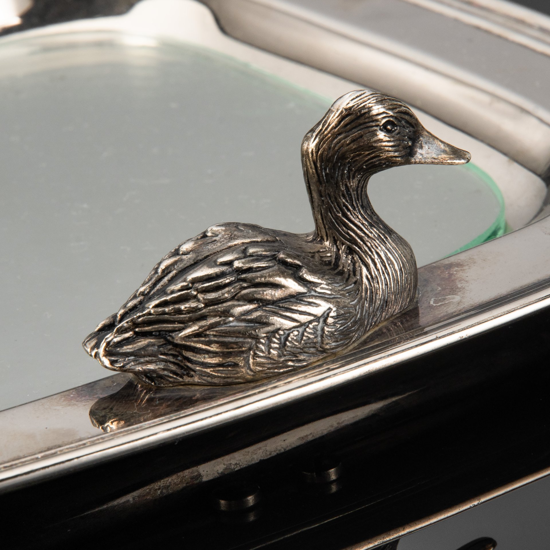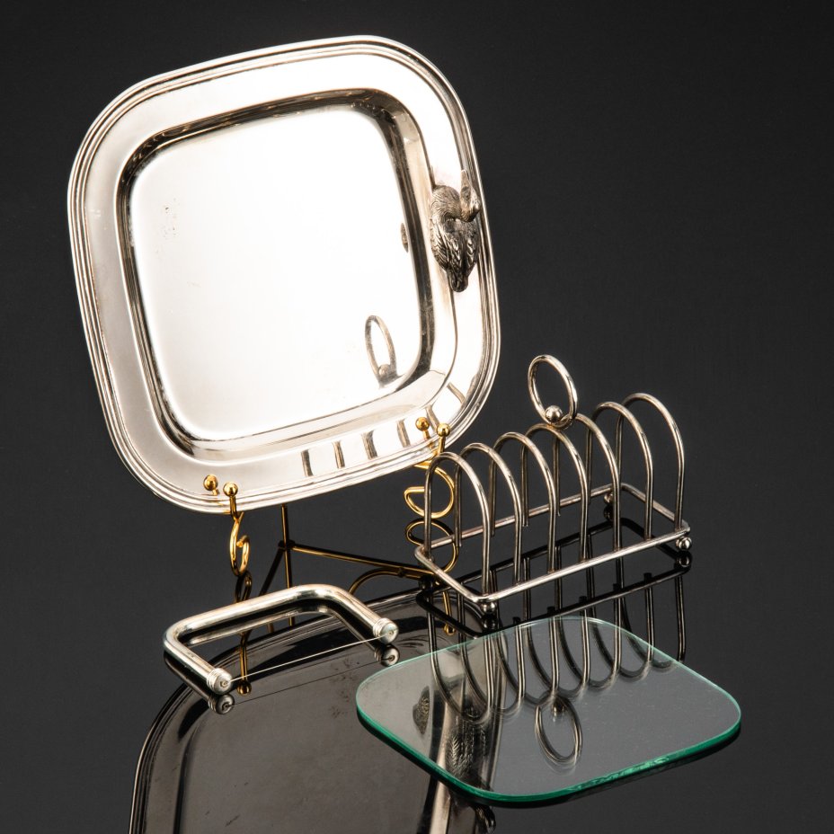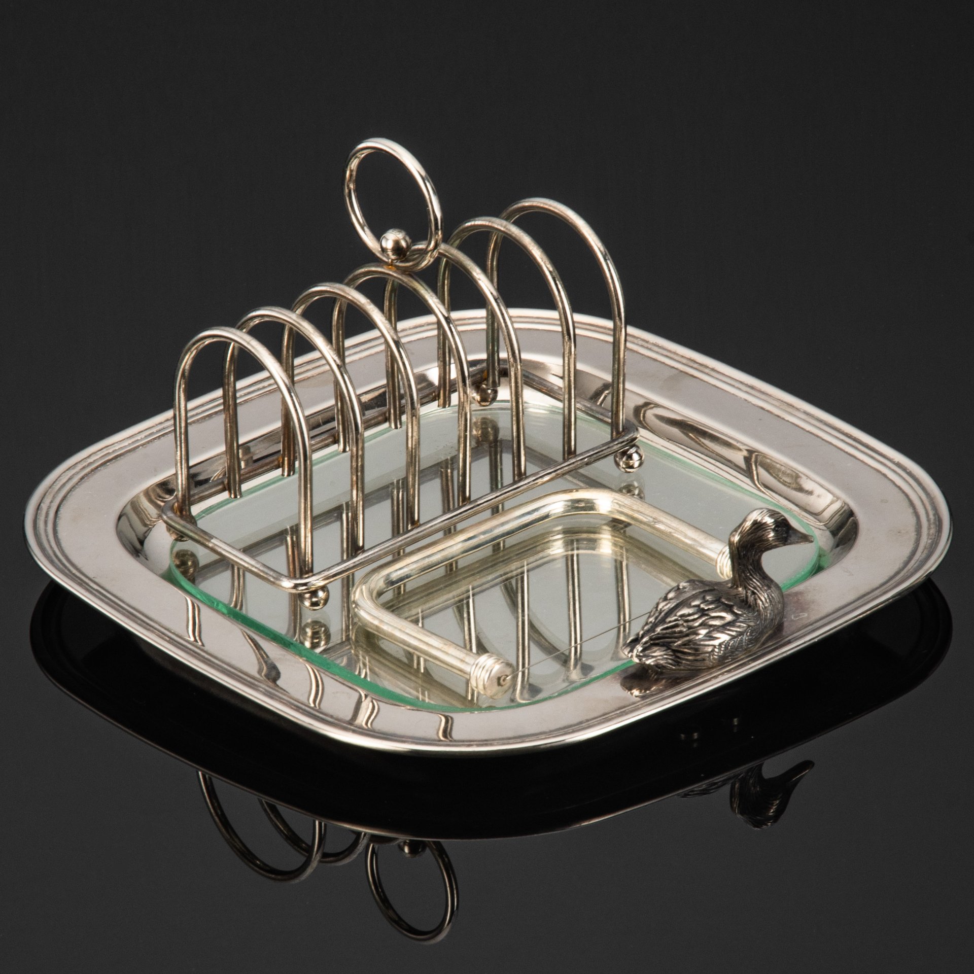 Квадратный поднос украшенный уточкой, стеклянная вставка, нож для нарезания паштета и подставка для тостов.