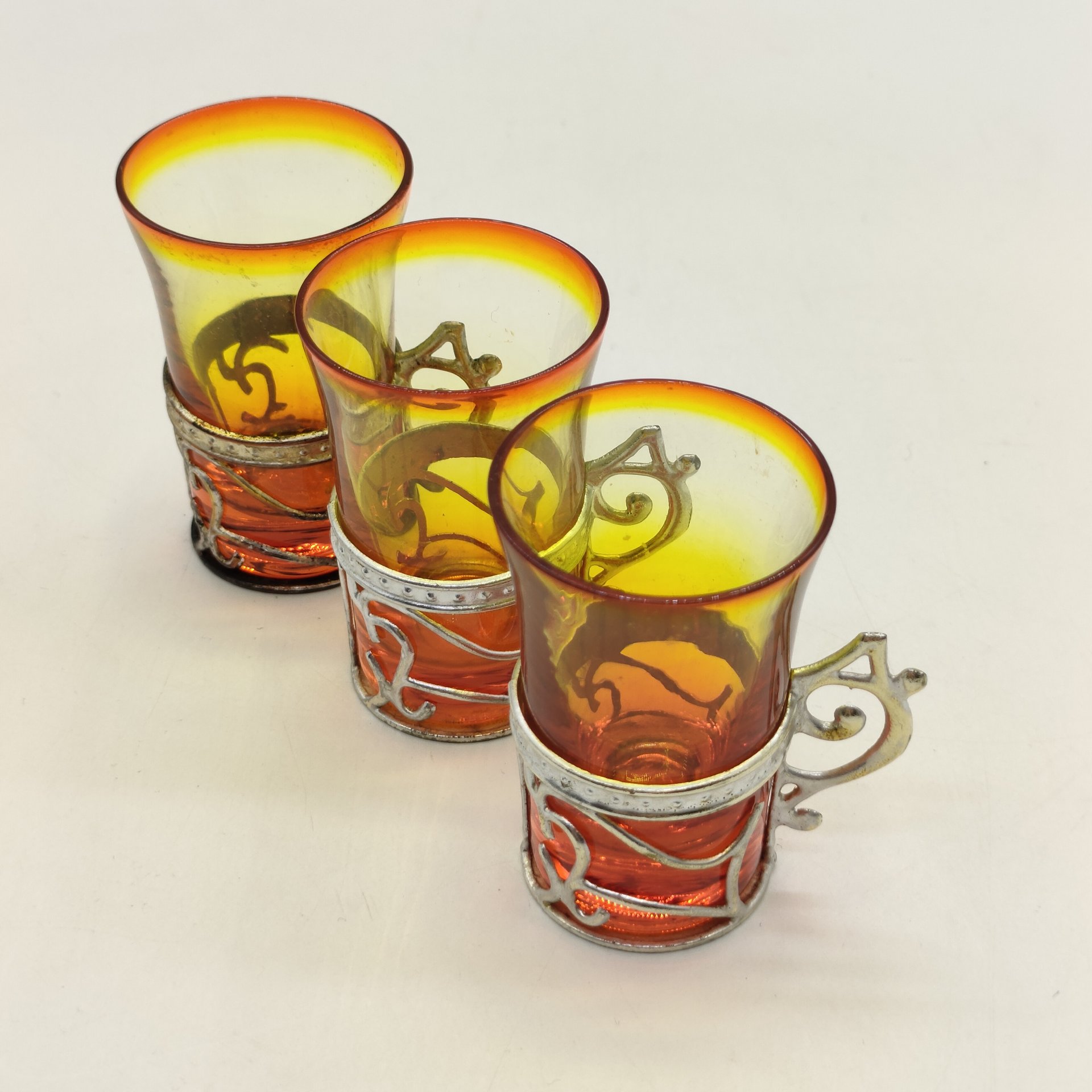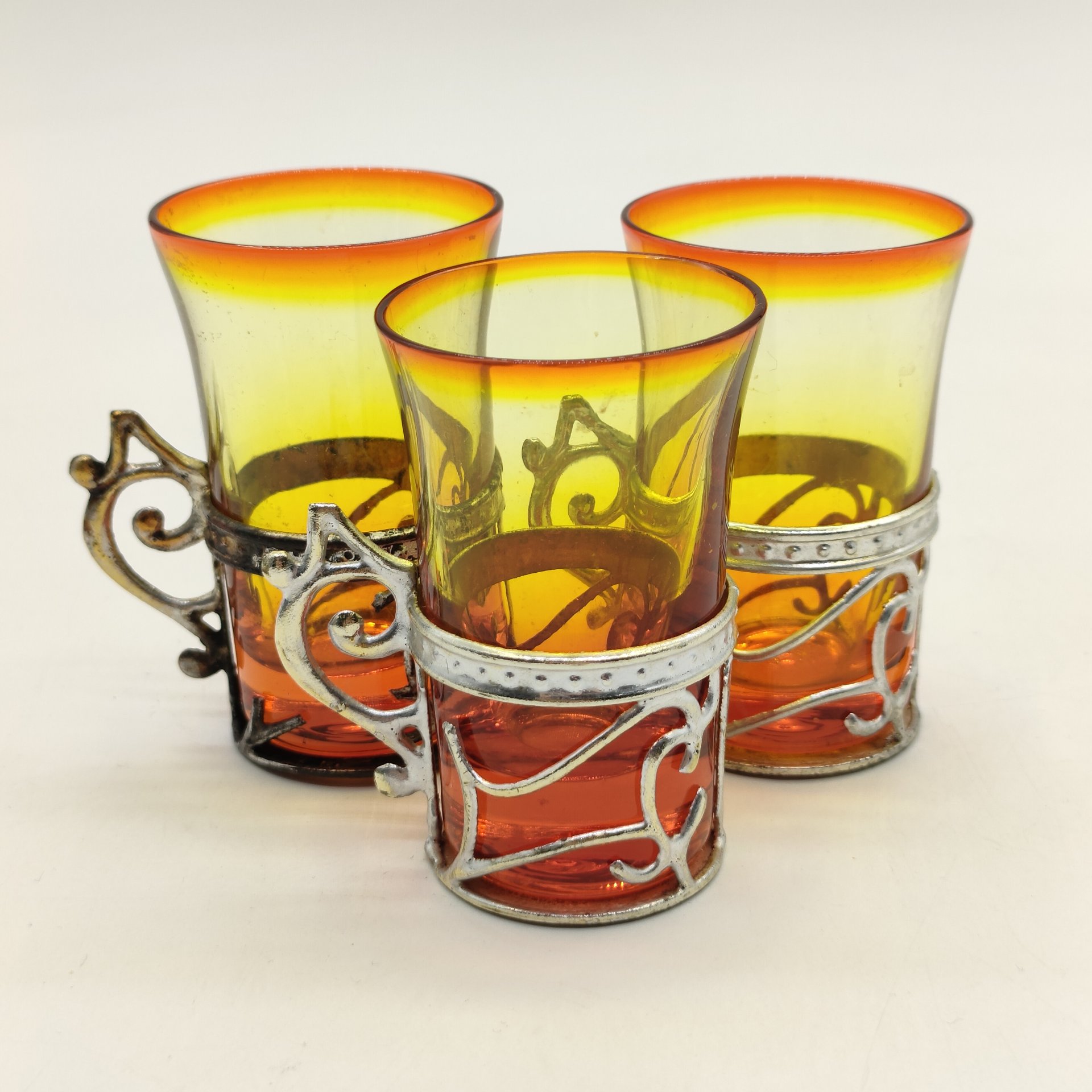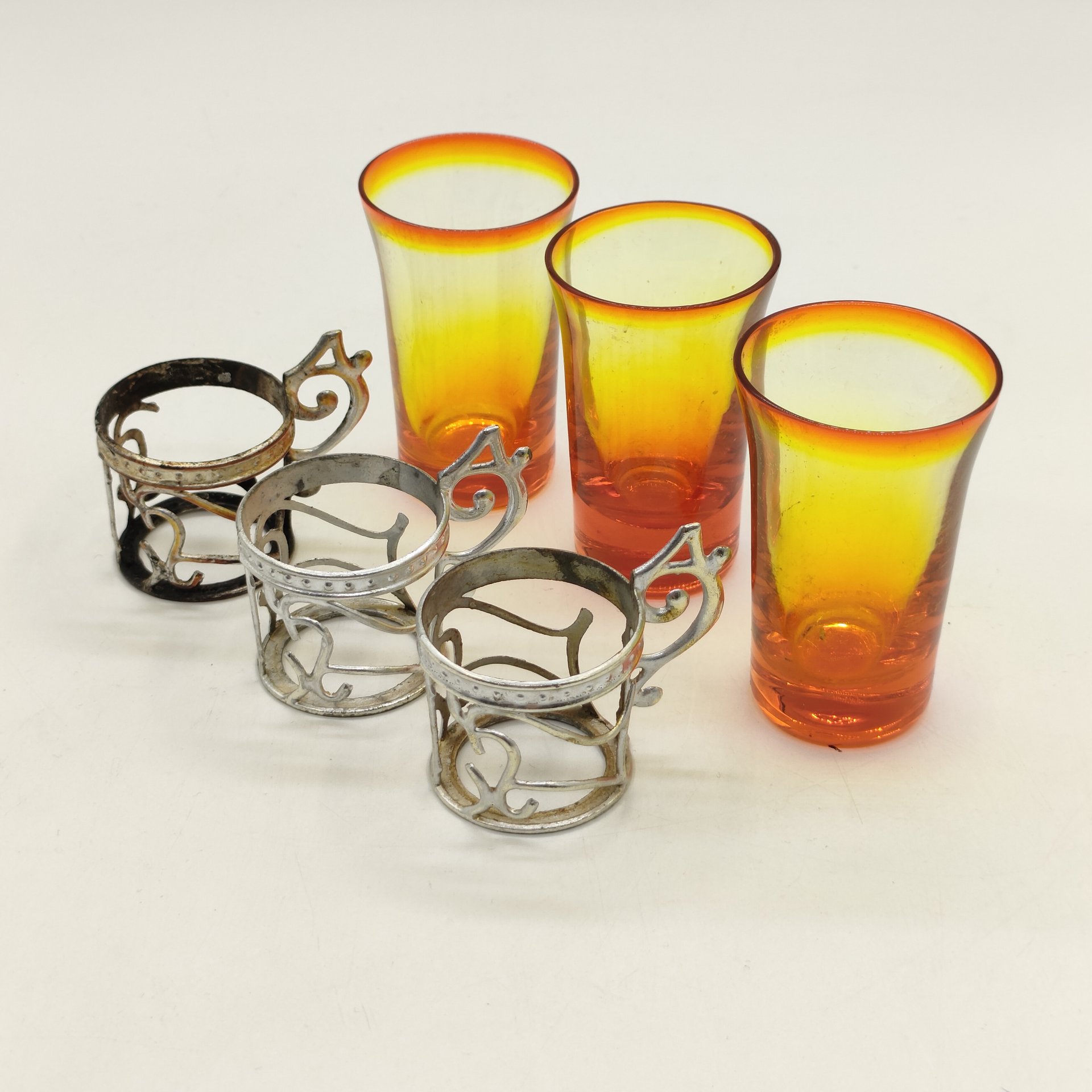 Купить Набор из 3-х стопок в подстаканниках, цветное стекло, сплав металлов, СССР, 1970-1990 гг.