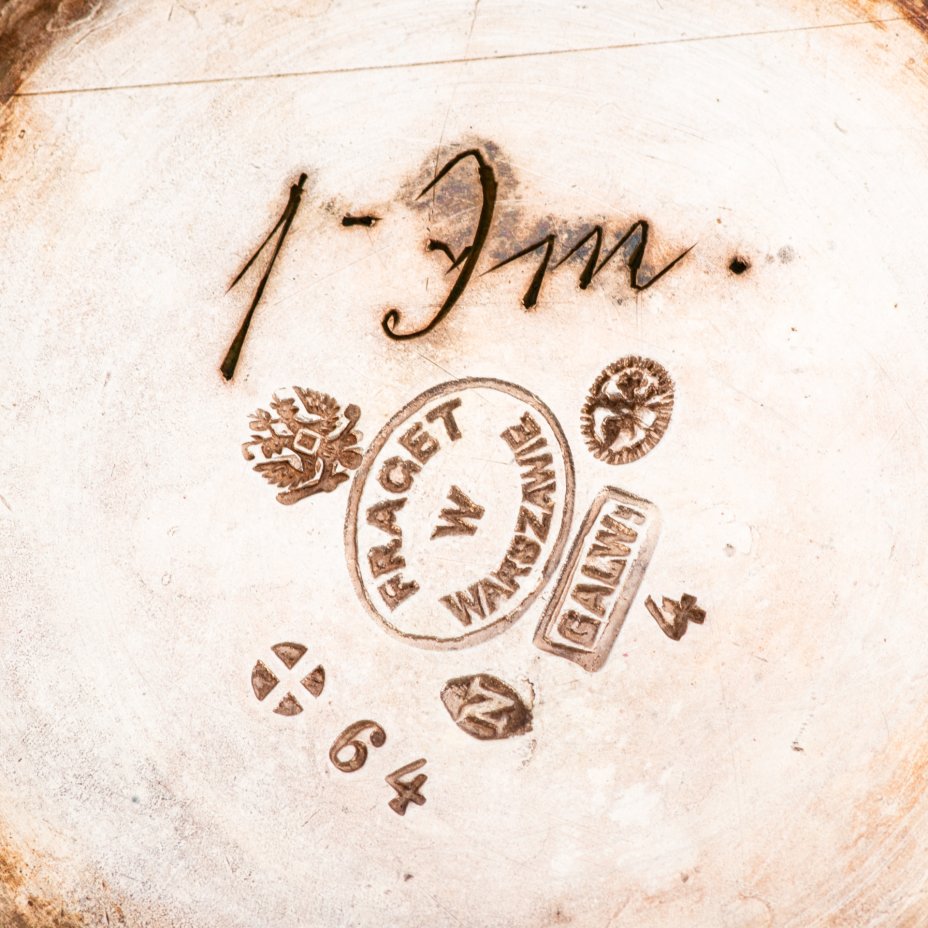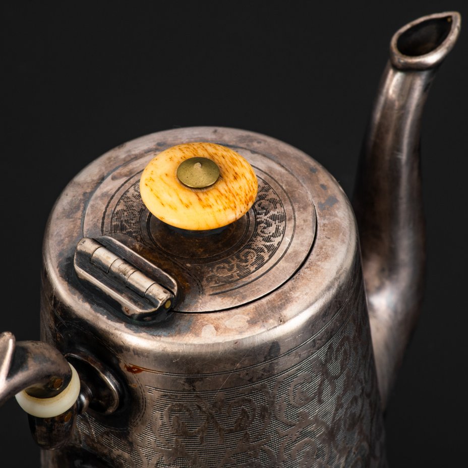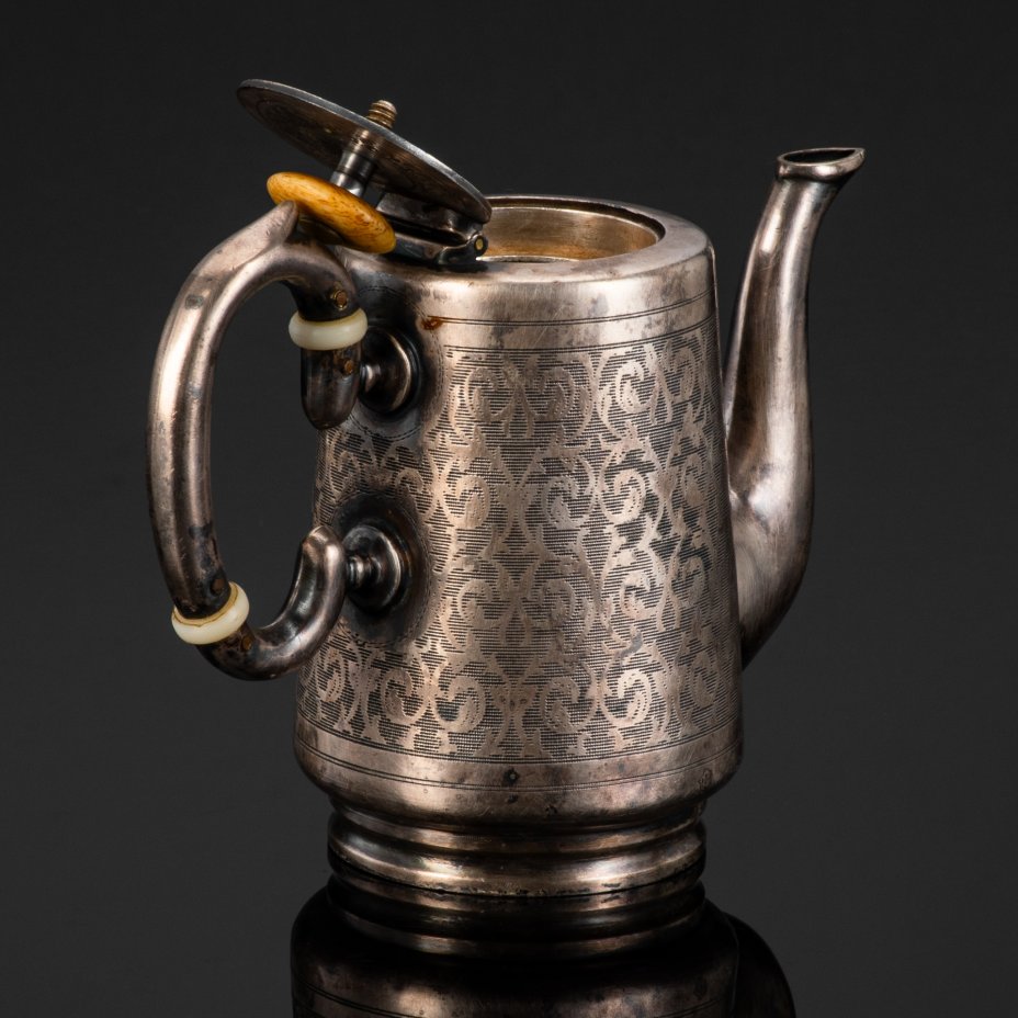 Кофейник с орнаментальным декором и картушем на тулове, металл, серебрение, полимерный материал, Fraget (Фабрика серебряных и плакированных изделий Иосифа Фраже), Царство Польское, 1860-1915 гг.