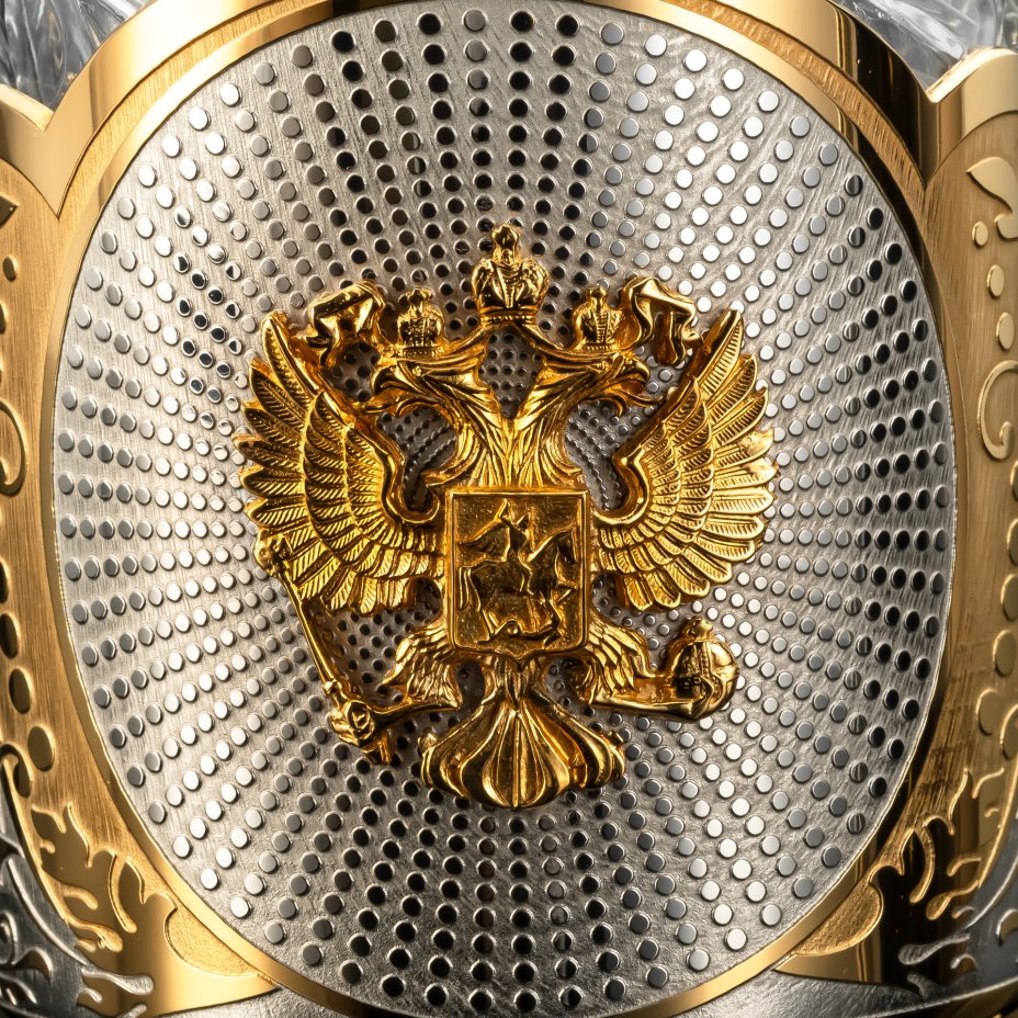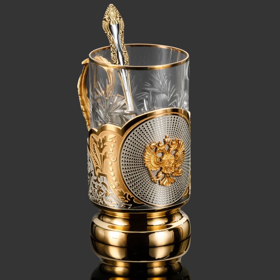 Подстаканник "Герб Российской Федерации" с ложкой и стаканом в подарочной коробке, латунь, стекло, золочение, Златоуст, Российская Федерация, 2025 г.