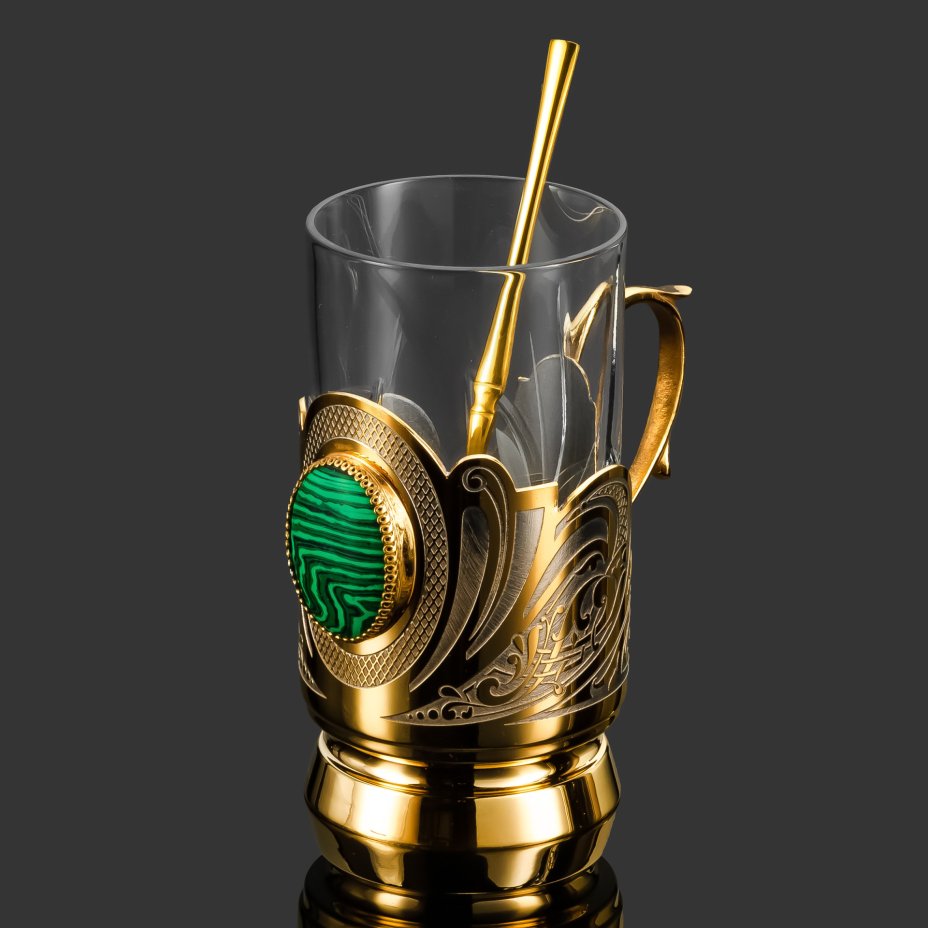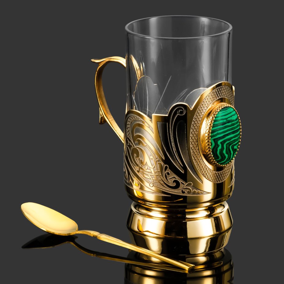 Подстаканник, украшенный вставкой из малахита с ложкой и стаканом в подарочной коробке, латунь, малахит, стекло, золочение, Златоуст, Российская Федерация, 2025 г.