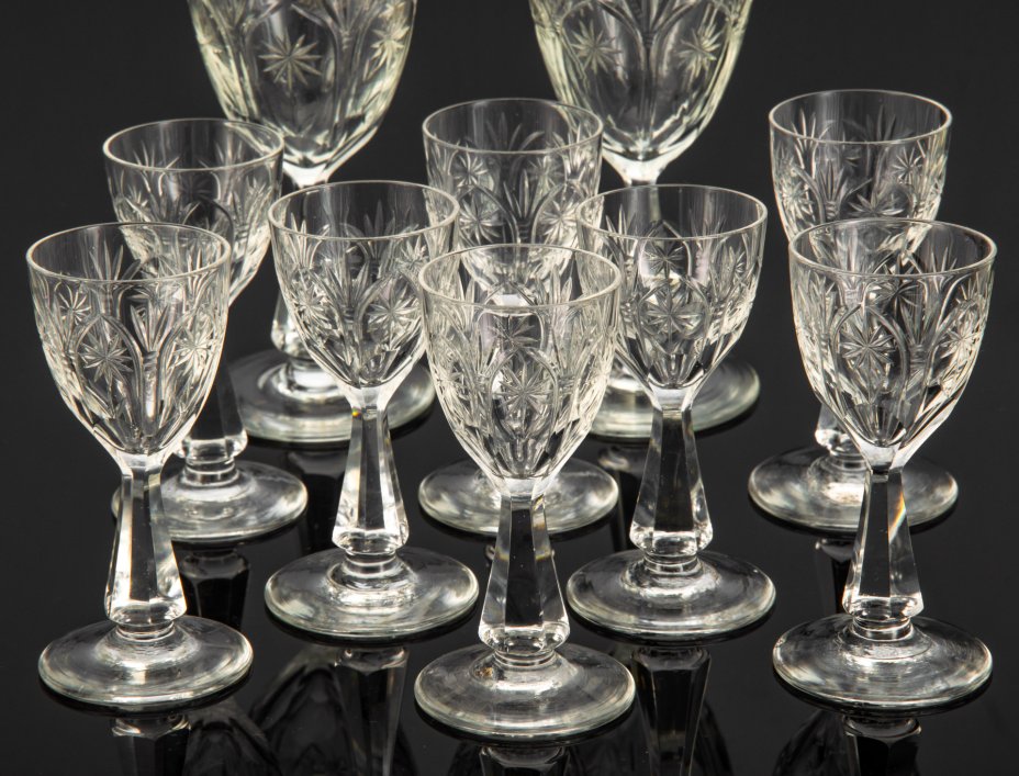Набор из штофа, восьми маленьких и двух больших рюмок с цветочным декором и арочными элементами в готической стилистике, стекло, алмазная грань, Западная Европа, 1880-1920 гг.