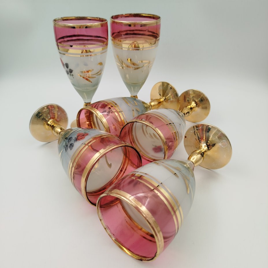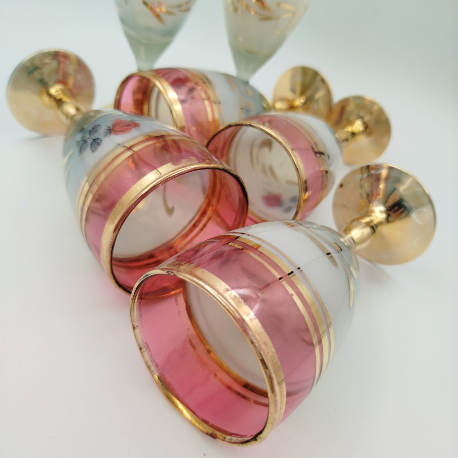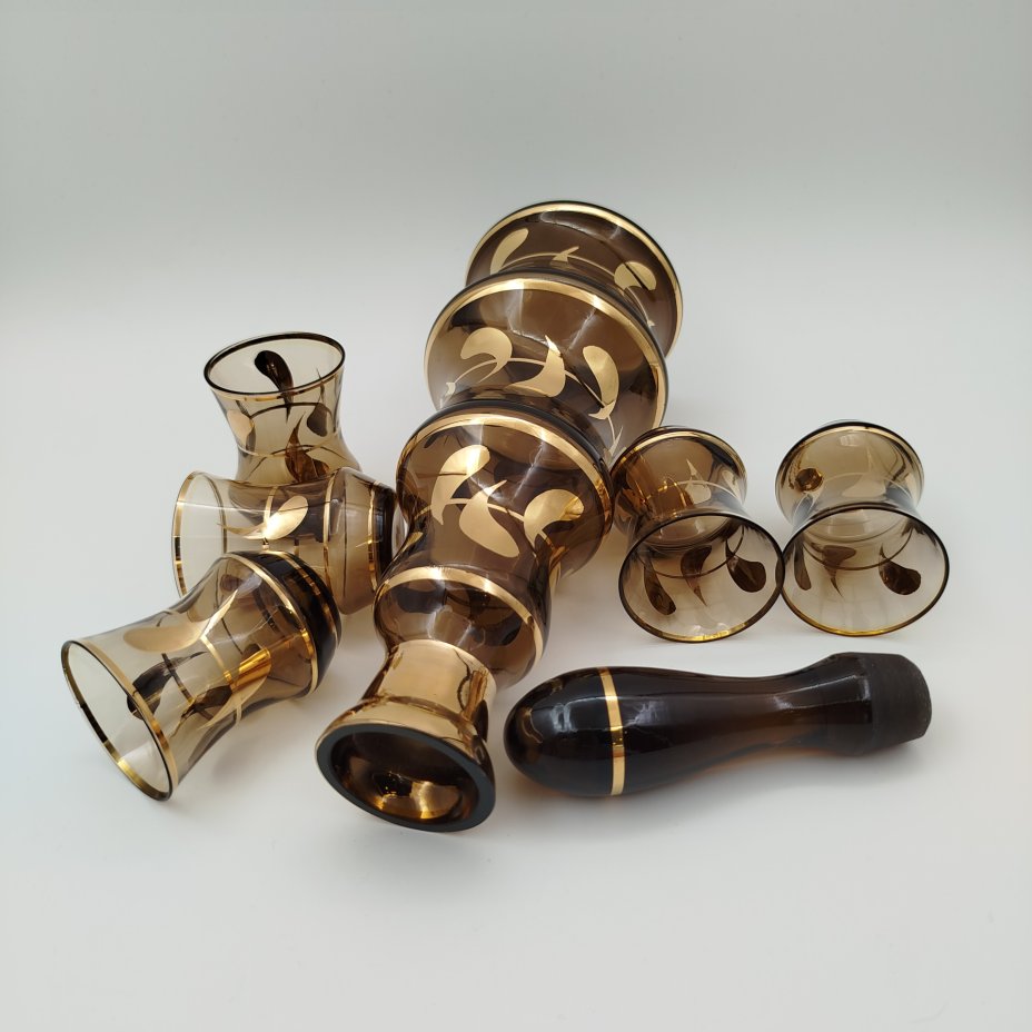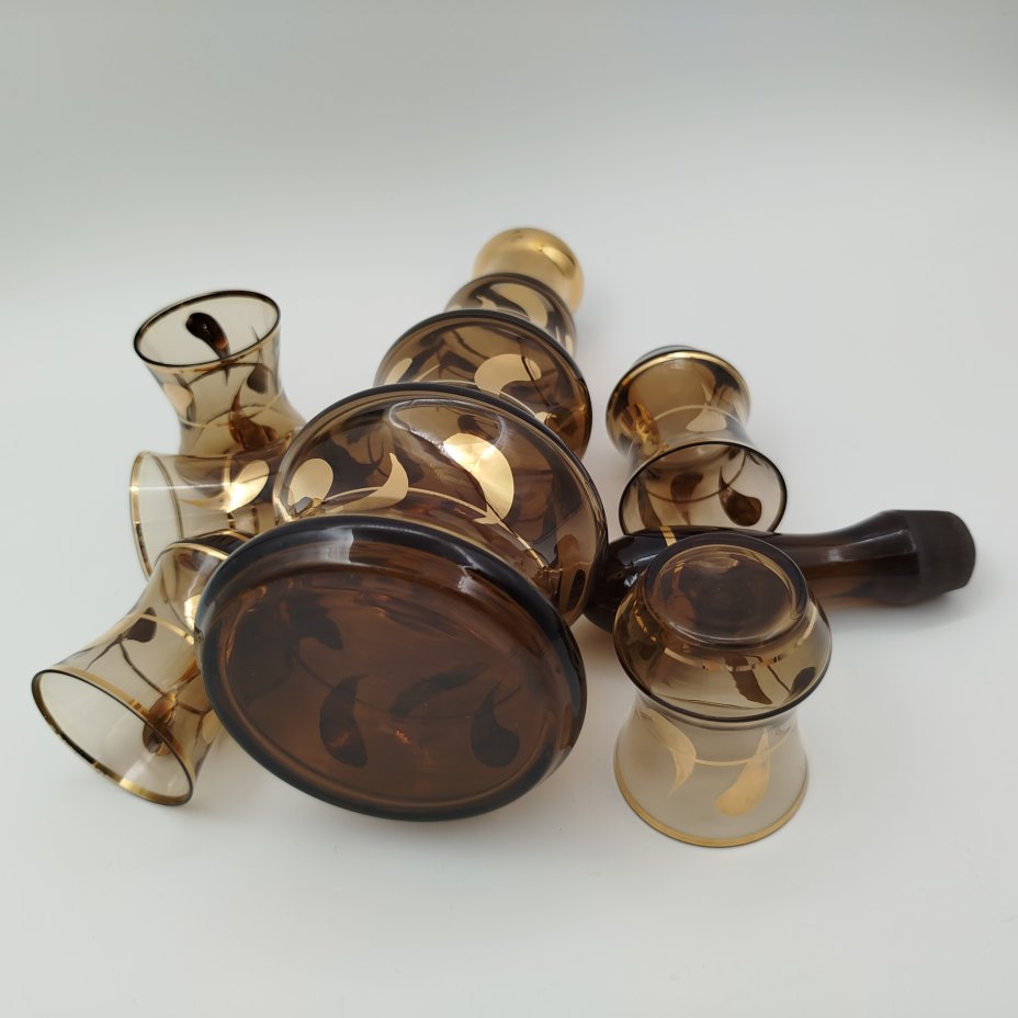 Набор для подачи крепких напитков на 4 персоны, украшенный золотым растительным декором, цветное стекло, золочение, Европа, 1970-1990 гг.