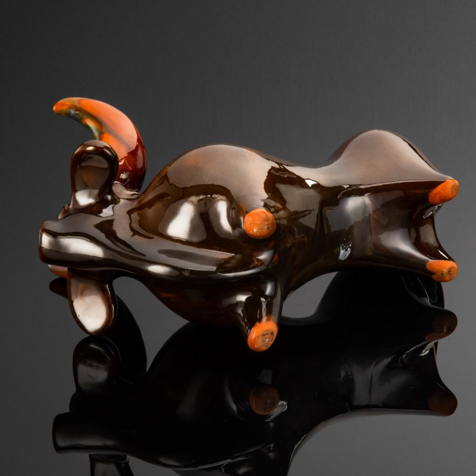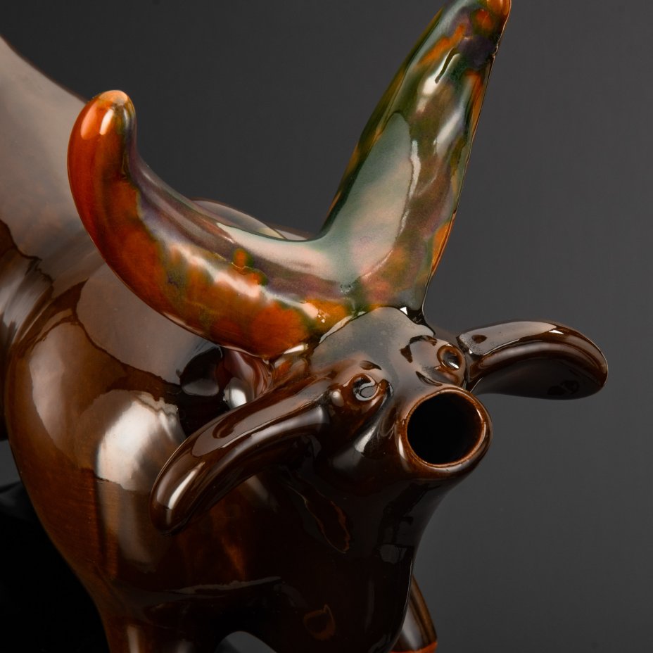 Сосуд зооморфный "Буйвол" ("Бык"), авторы Надежда Ефимовна и Валерий Семенович Проторьевы, керамика, поливы, Васильковский майоликовый завод, СССР, 1960-1980 гг.