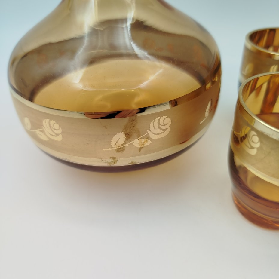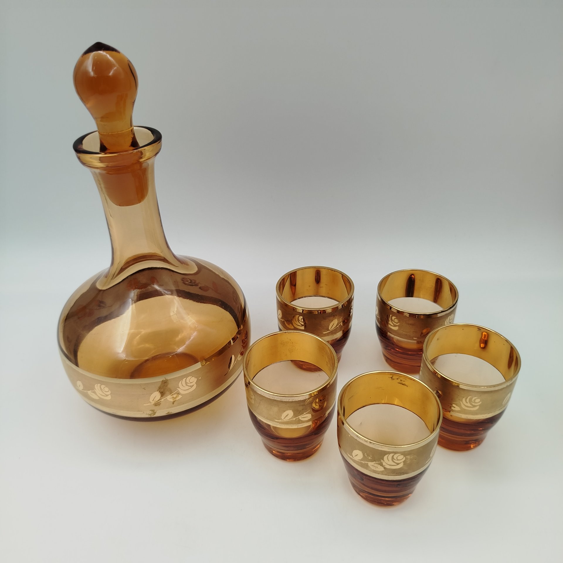 Набор ликерный зеленого цвета с золотистым декором, состоящий из штофа и 4-х рюмок, стекло, гутная техника, золочение, Западная Европа, 1960-1980 гг.