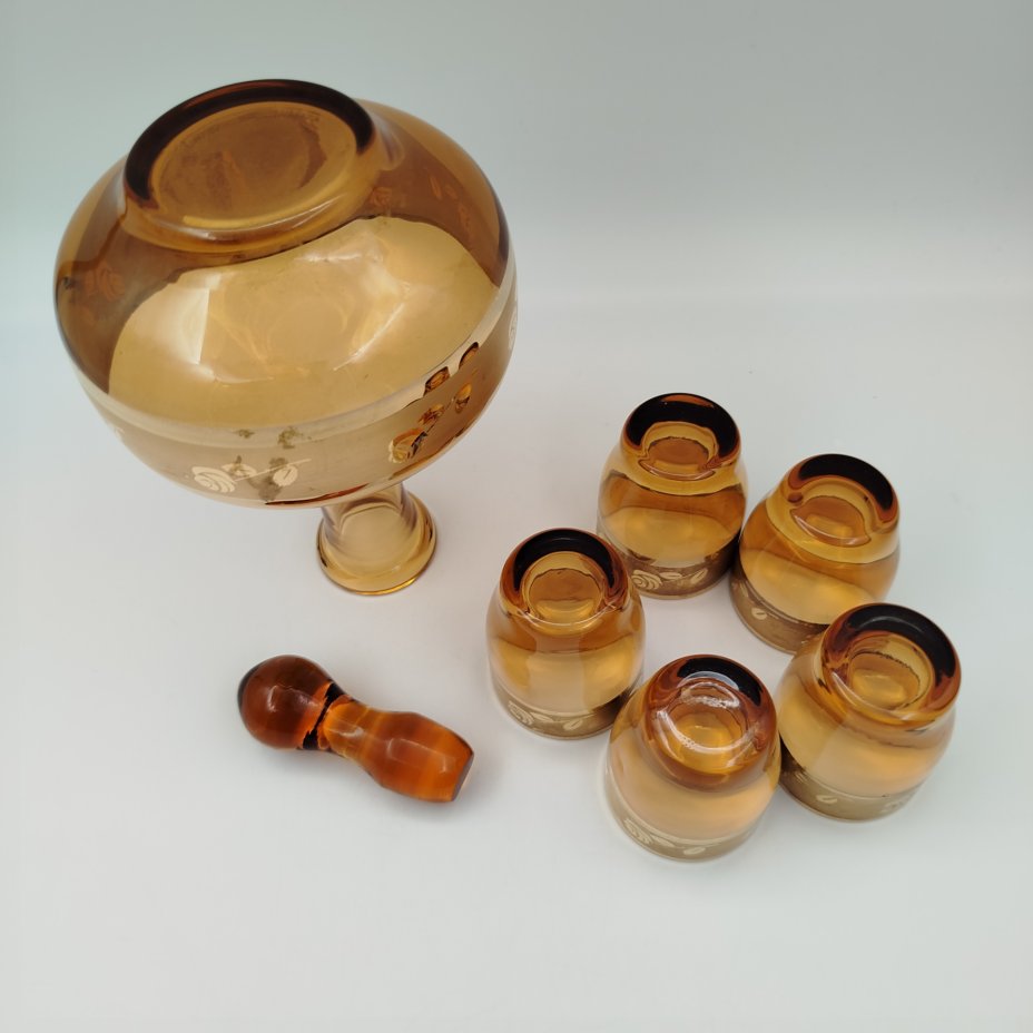 Самовар (штоф) с краником в виде мыши и 6 стопками, стекло, люстр, гутная техника, СССР, 1960-1980 гг.