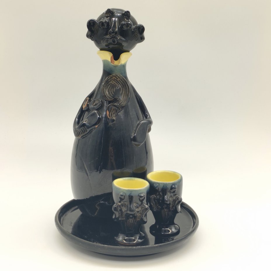 Набор для подачи крепких напитков на 6 персон (штоф и 6 стопок), украшенный объемным цветочным декором, стекло, золочение, налепы, Чехословакия, 1970-1990 гг.