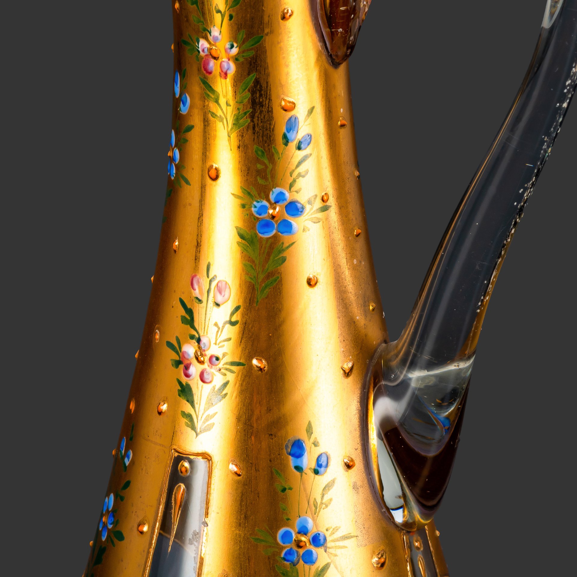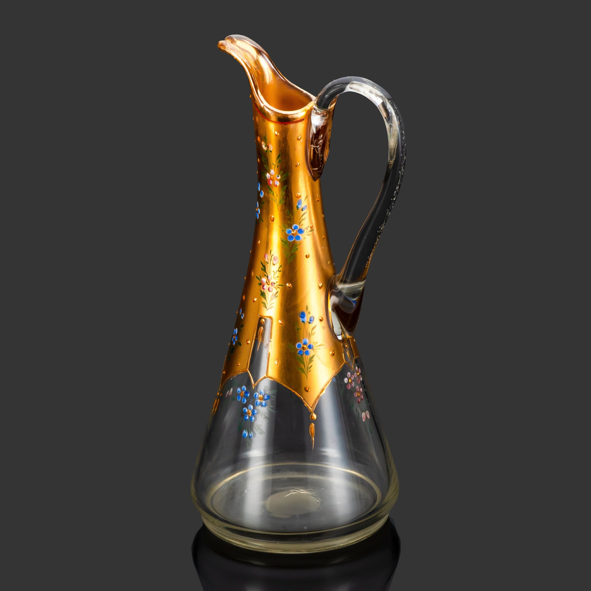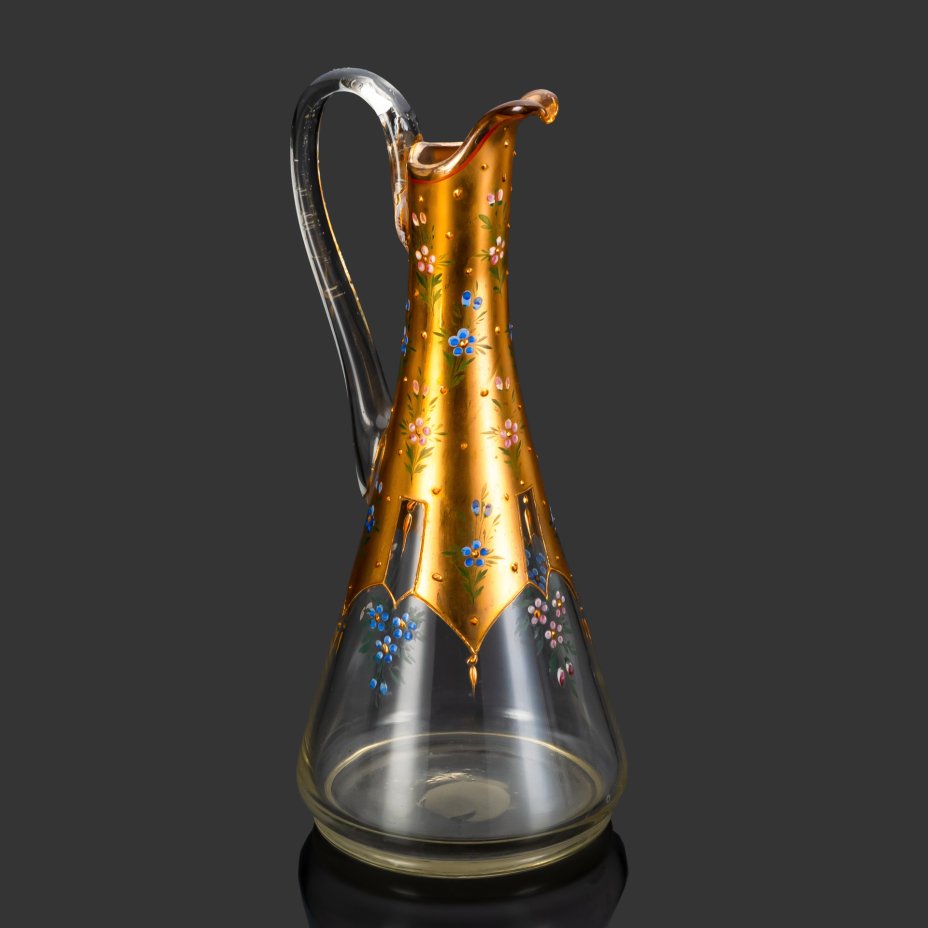Кувшин с цветочным декором и фигурной ручкой, фаянс, золочение, деколь, люстр, СССР, 1970-1990 гг.