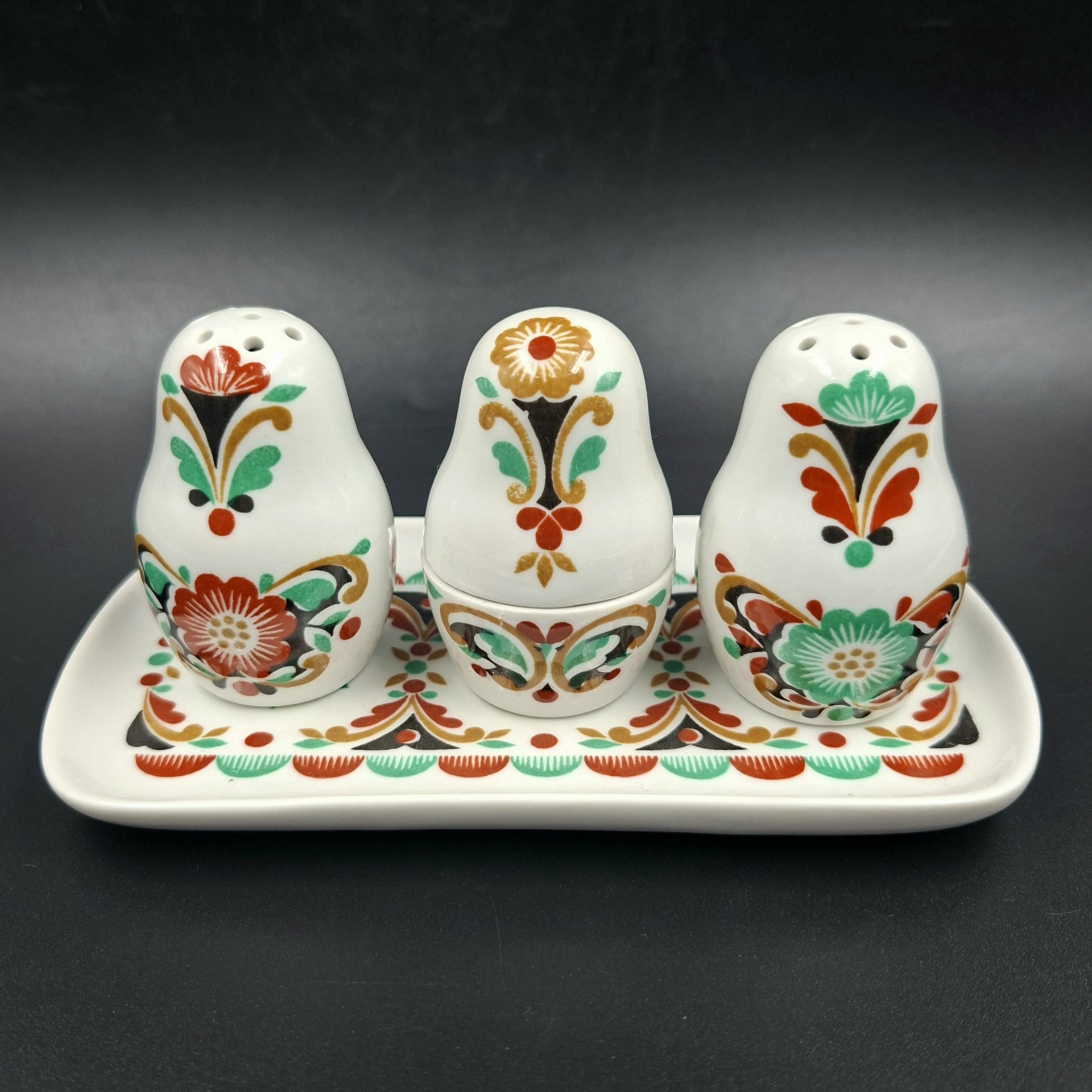 Набор для специй из четырех предметов с цветочным декором в розово-зеленой гамме, фарфор, печать, Epiag Royal Czechoslovakia, Чехословакия, 1970-1990 гг.