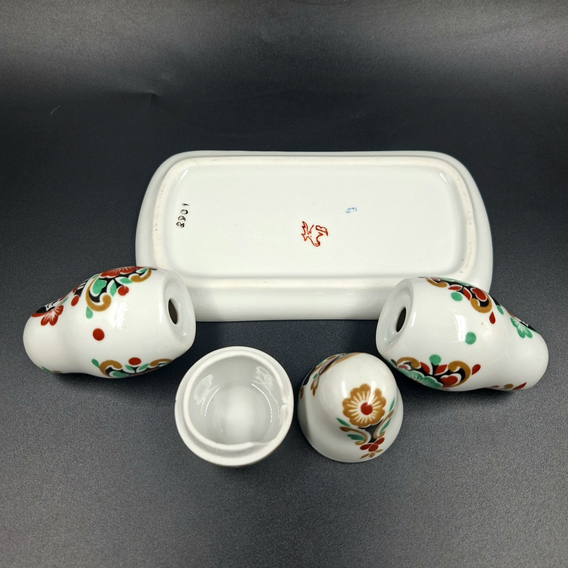 Купить Набор для специй из четырех предметов с цветочным декором в розово-зеленой гамме, фарфор, печать, Epiag Royal Czechoslovakia, Чехословакия, 1970-1990 гг.