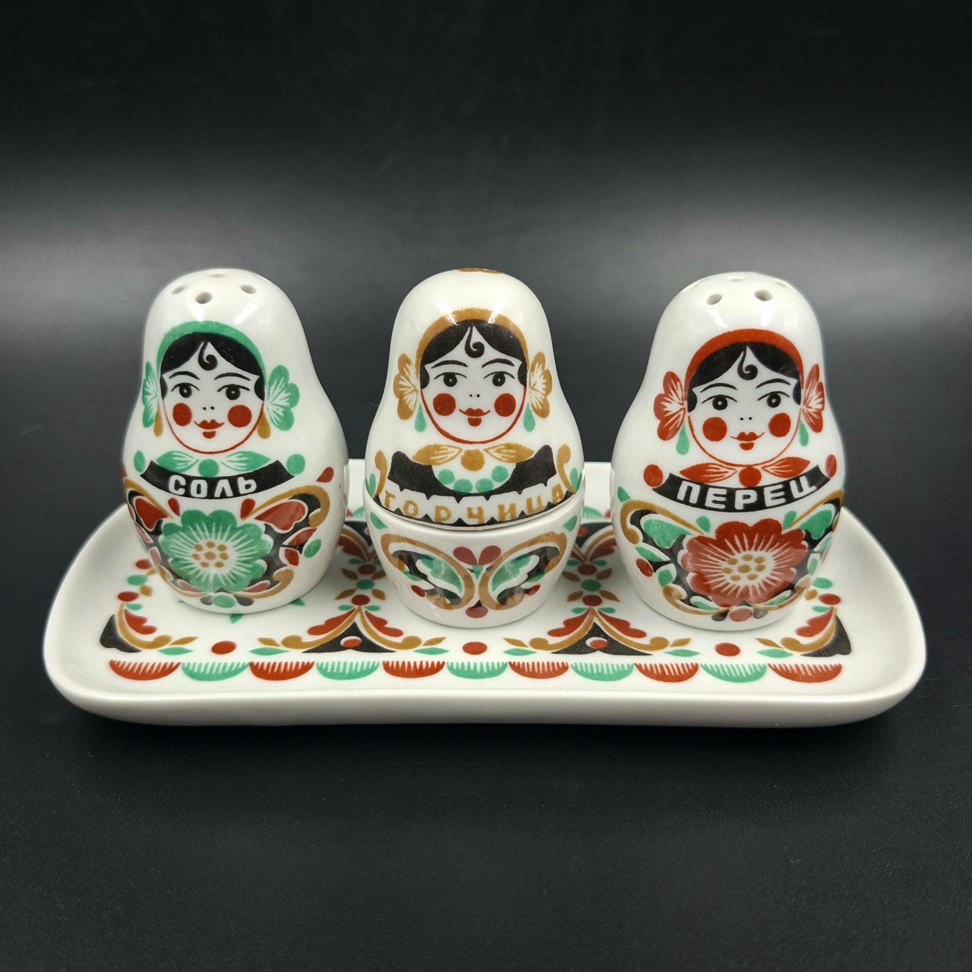 Набор для специй "Девушка с муфтой", фарфор, роспись, люстр, Западная Европа, 1950-1970 гг.