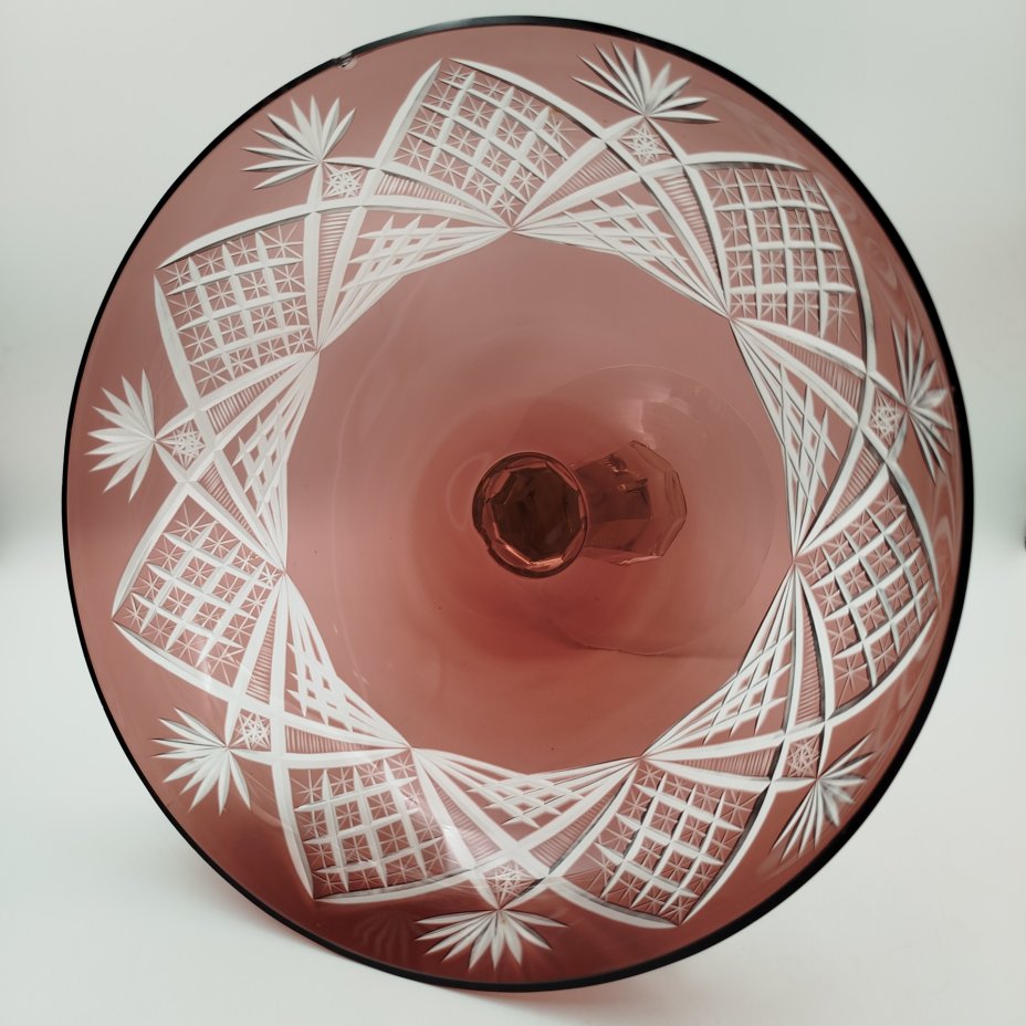 Фруктовница на высокой ножке с марганцевым подтоном на чаше, украшенной резным декором, стекло, гранение, алмазная грань, СССР, 1930-1950 гг.