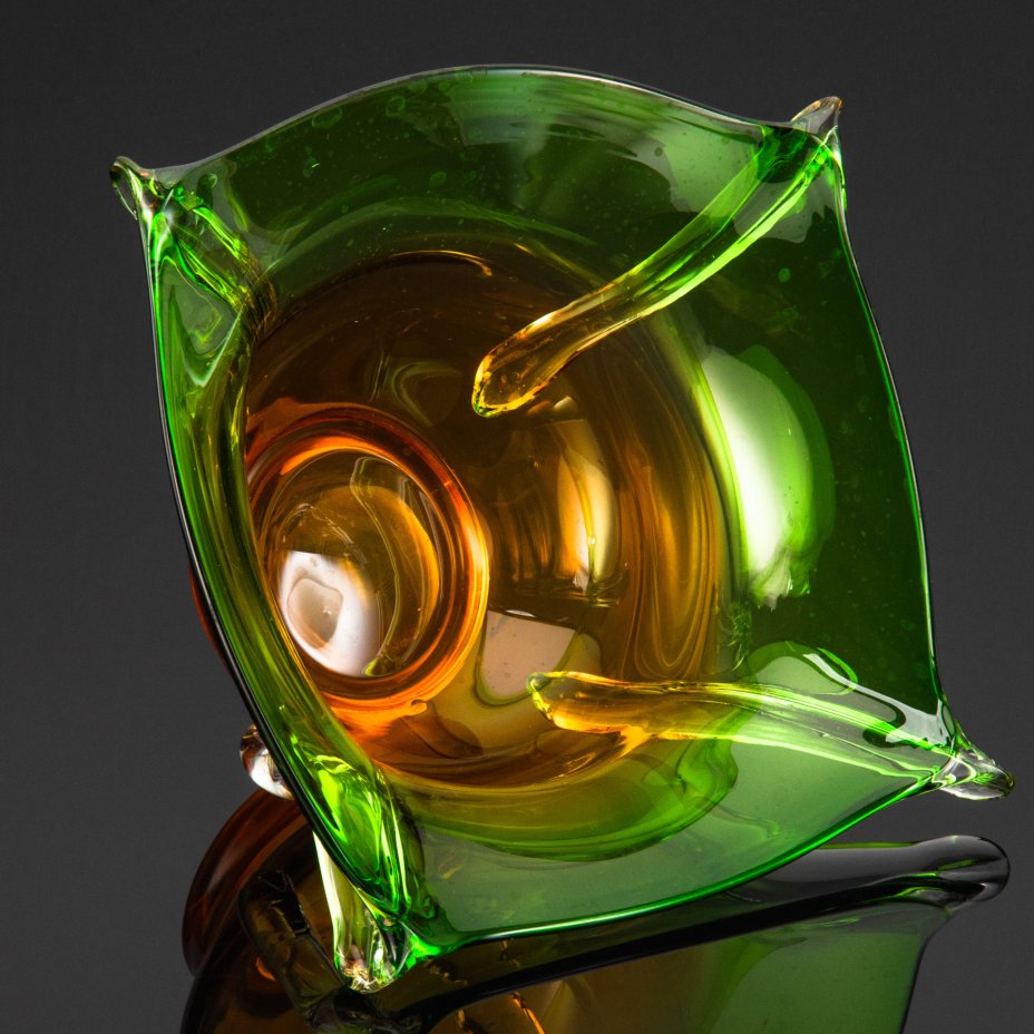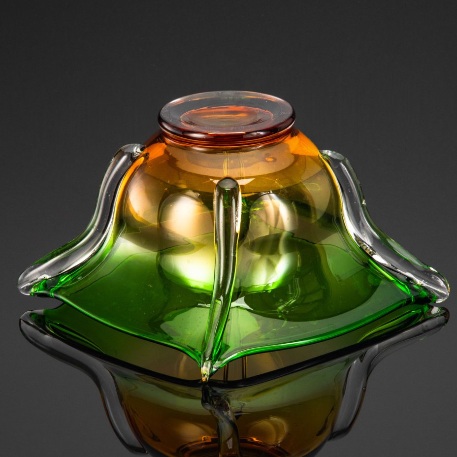Фруктовница (конфетница) в янтарно-зеленых тонах, цветное стекло, гутная техника, Западная Европа, 1960-1980 гг.
