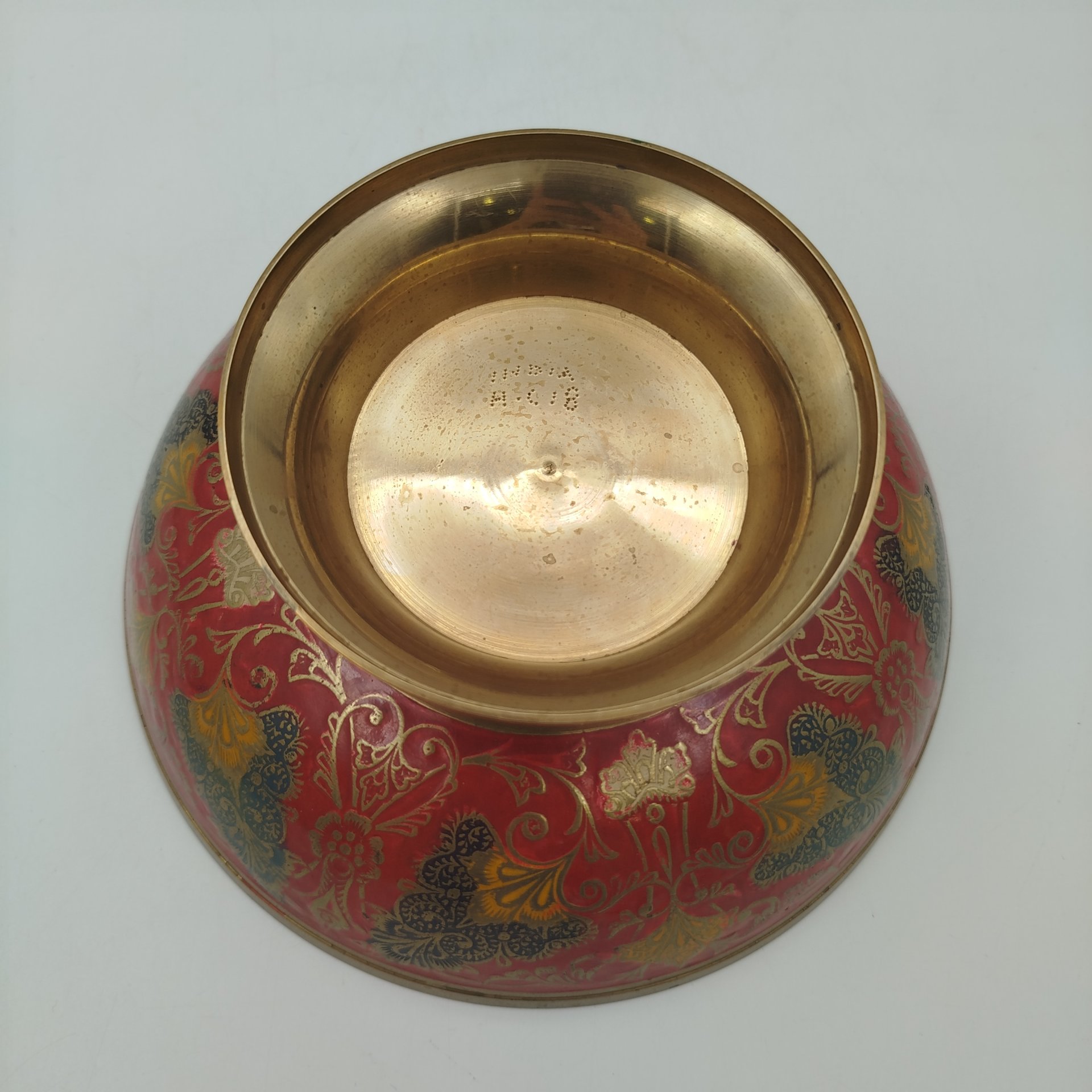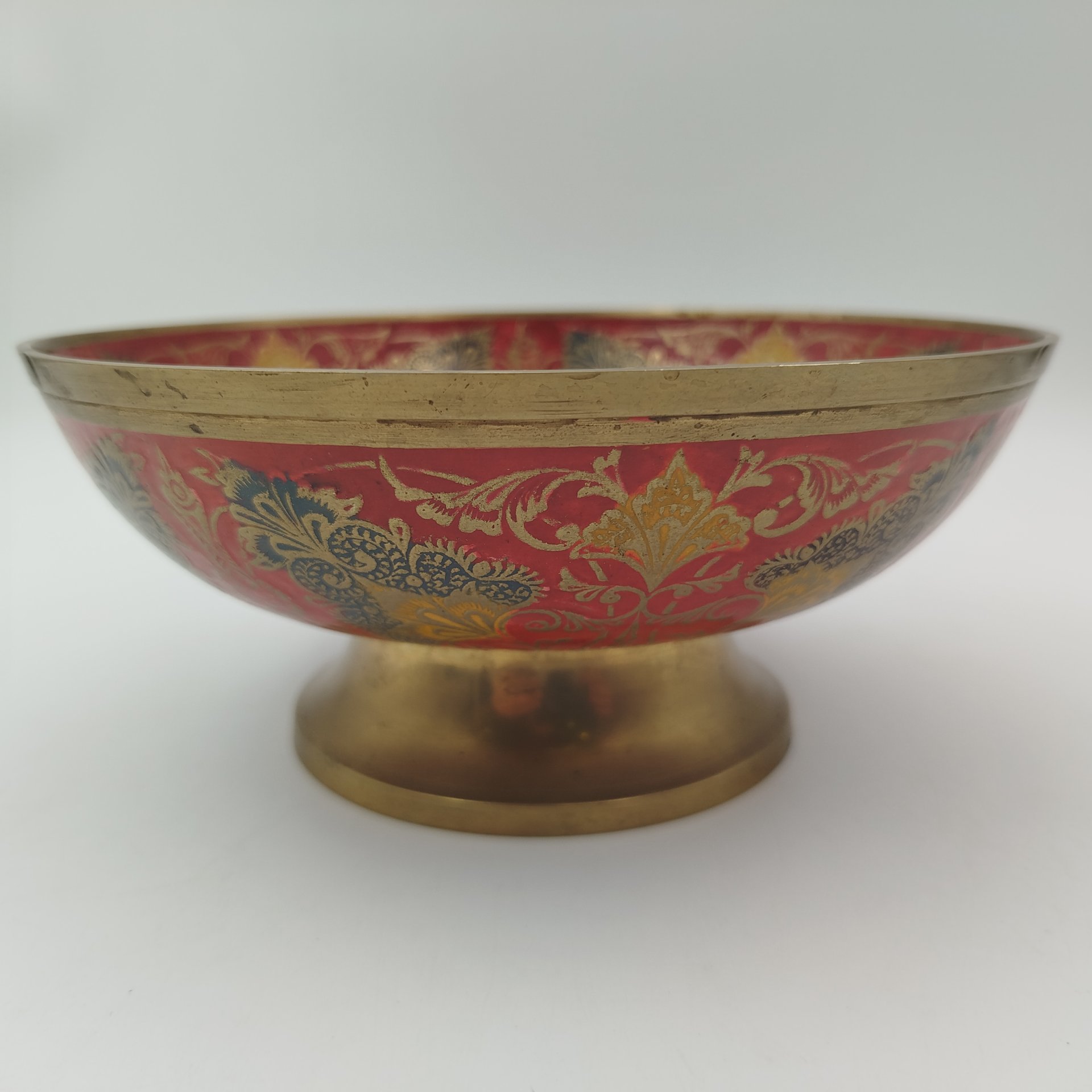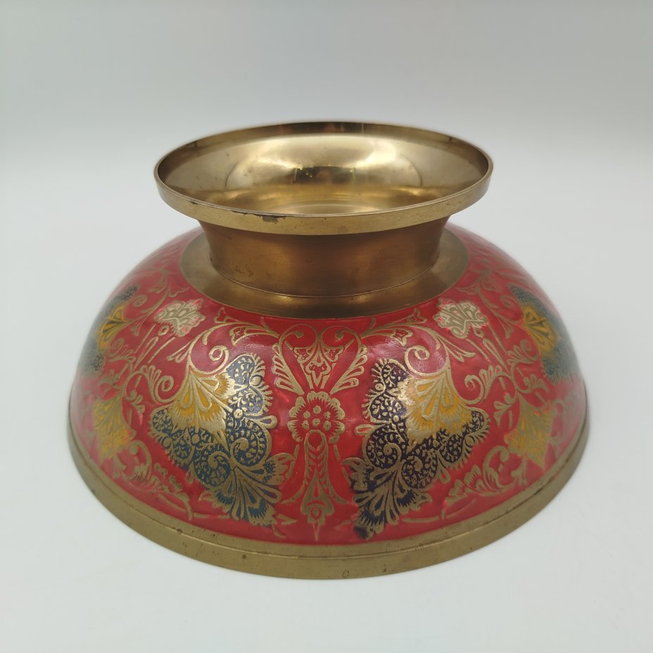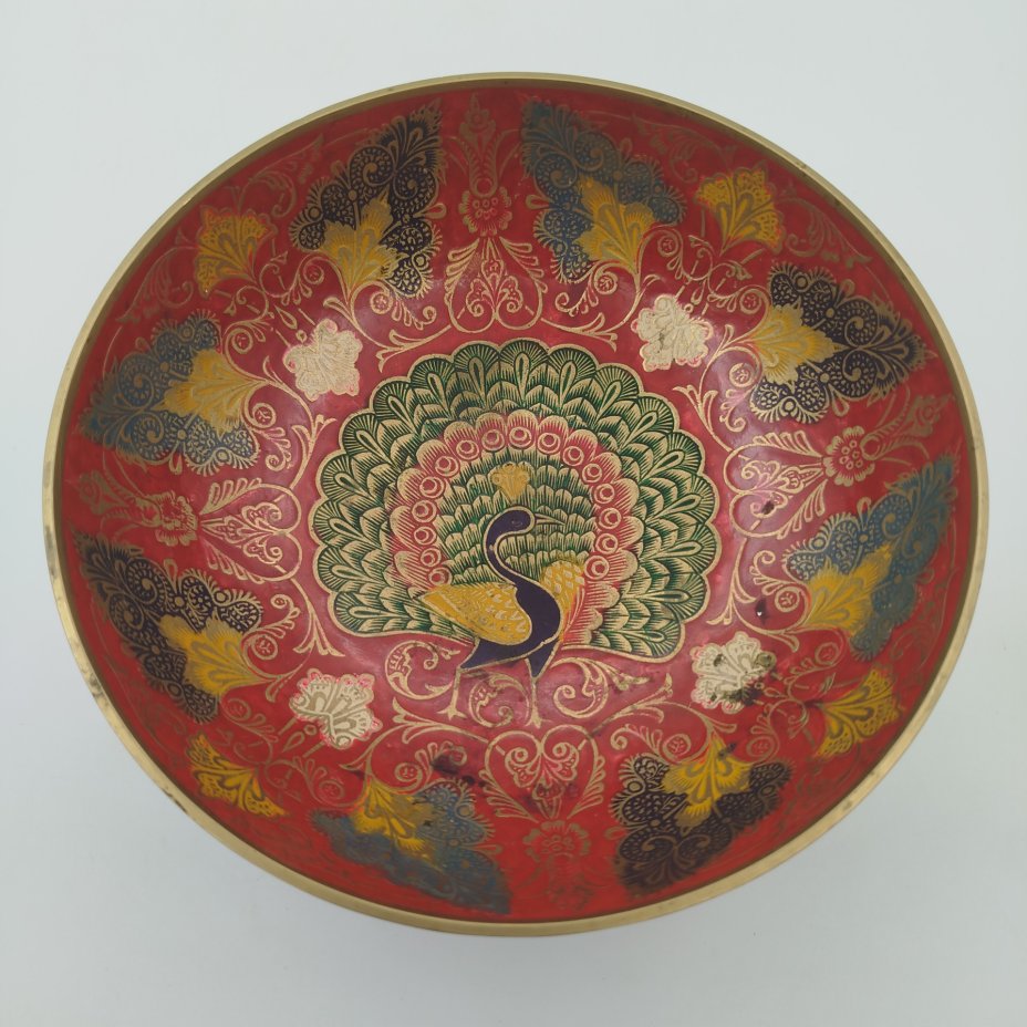 Фруктовница (конфетница), украшенная изображением павлина и восточным орнаментом на красном фоне, латунь, холодные эмали, Индия, 1970-1990 гг.