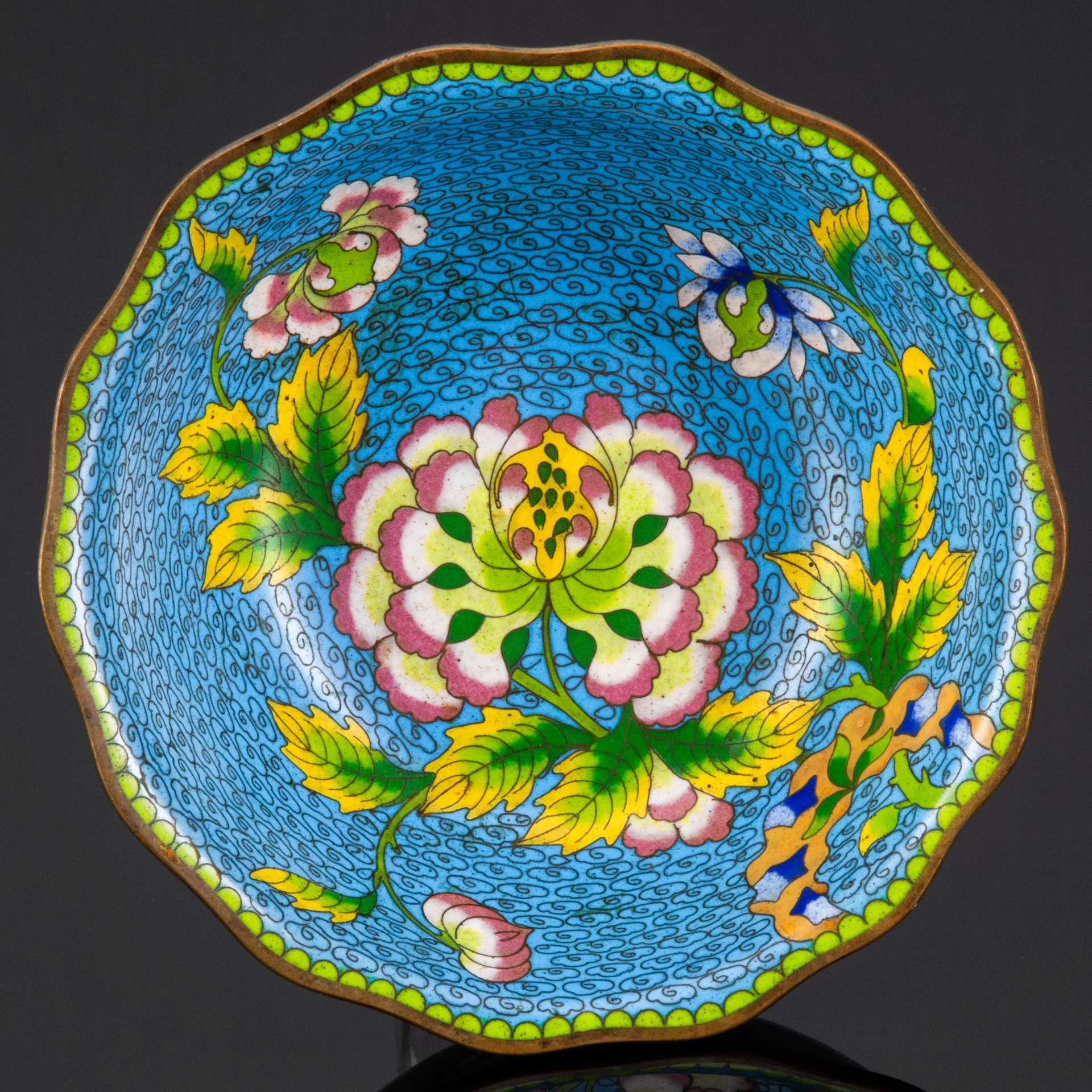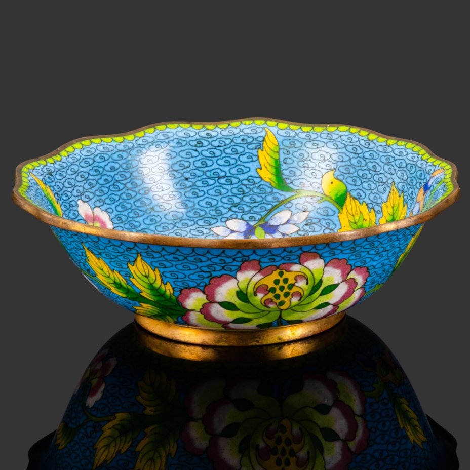 купить Ваза (конфетница), украшенная изображением цветов на синем облачном фоне, металл, клуазоне, эмали, Китай, 1960-1980 гг.
