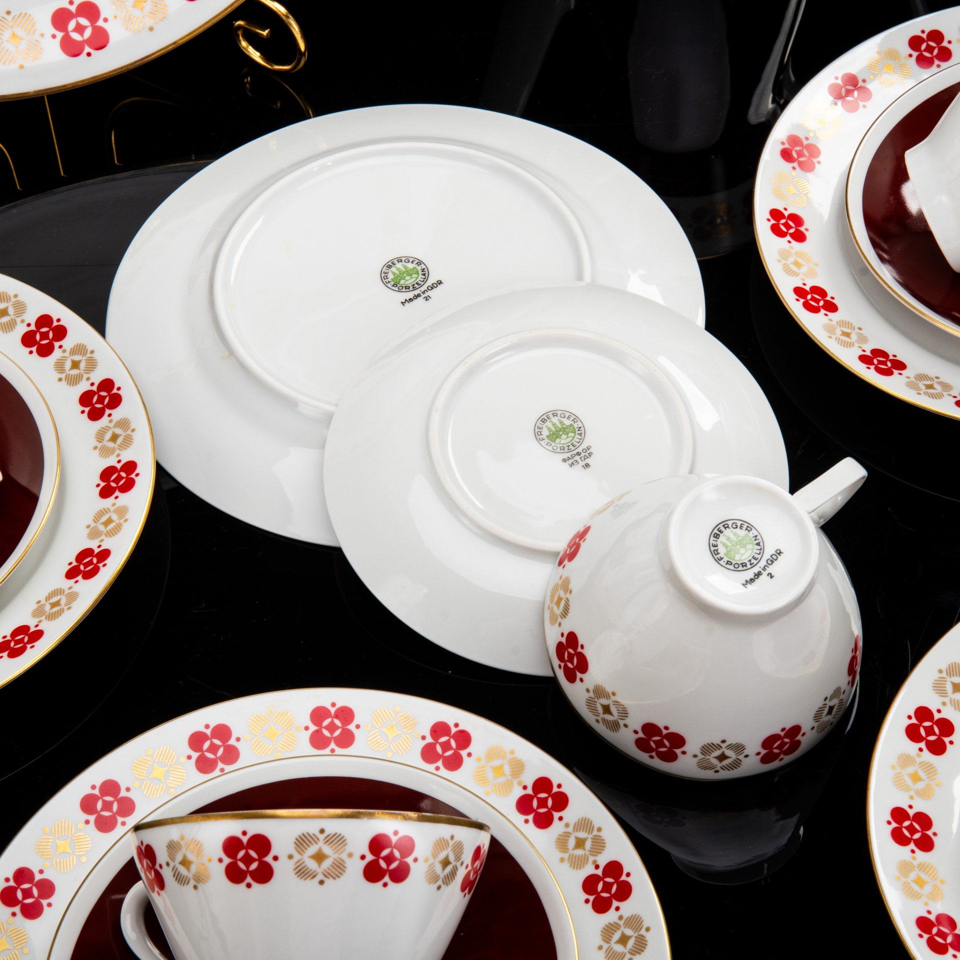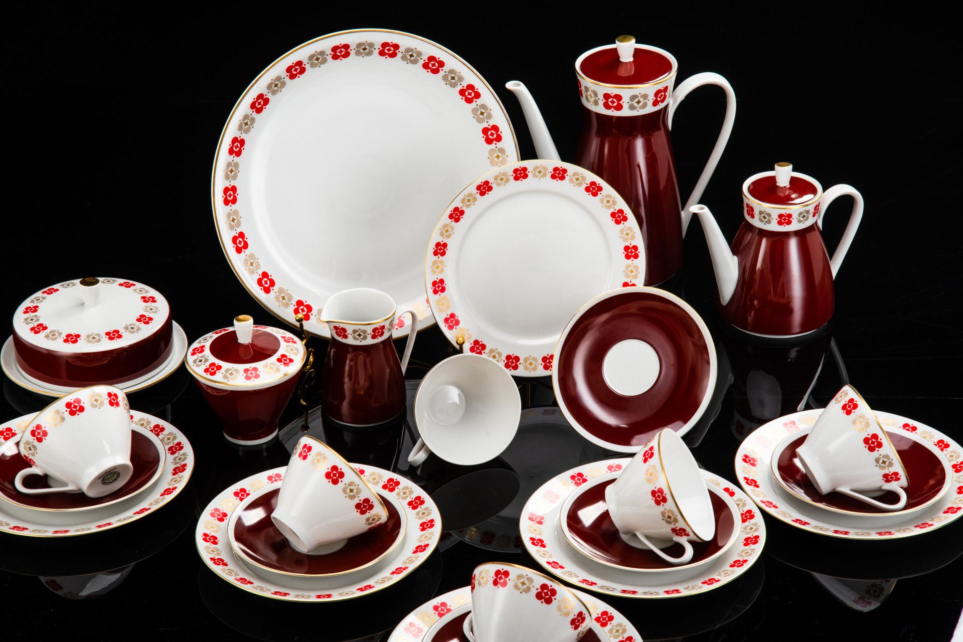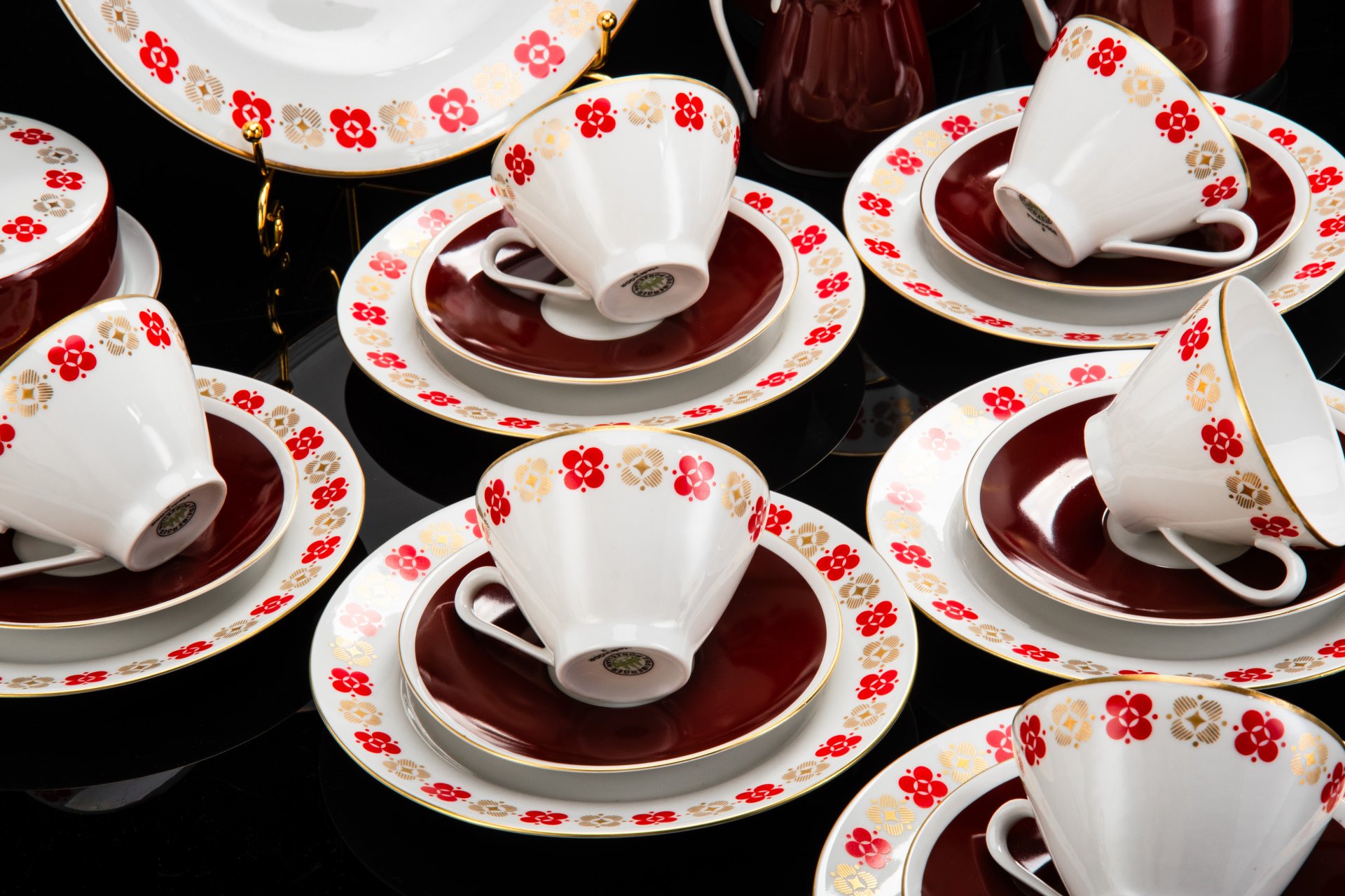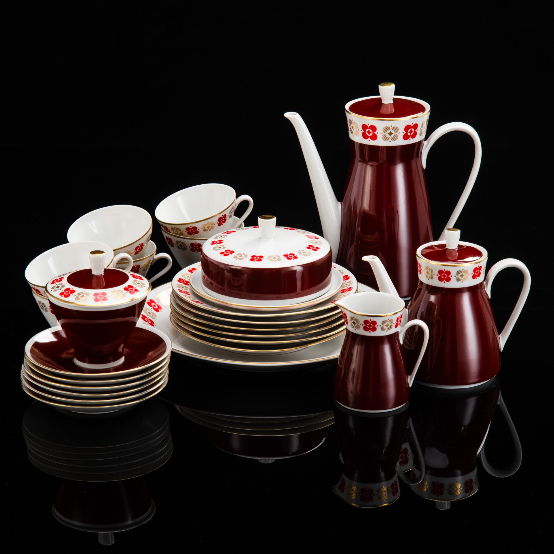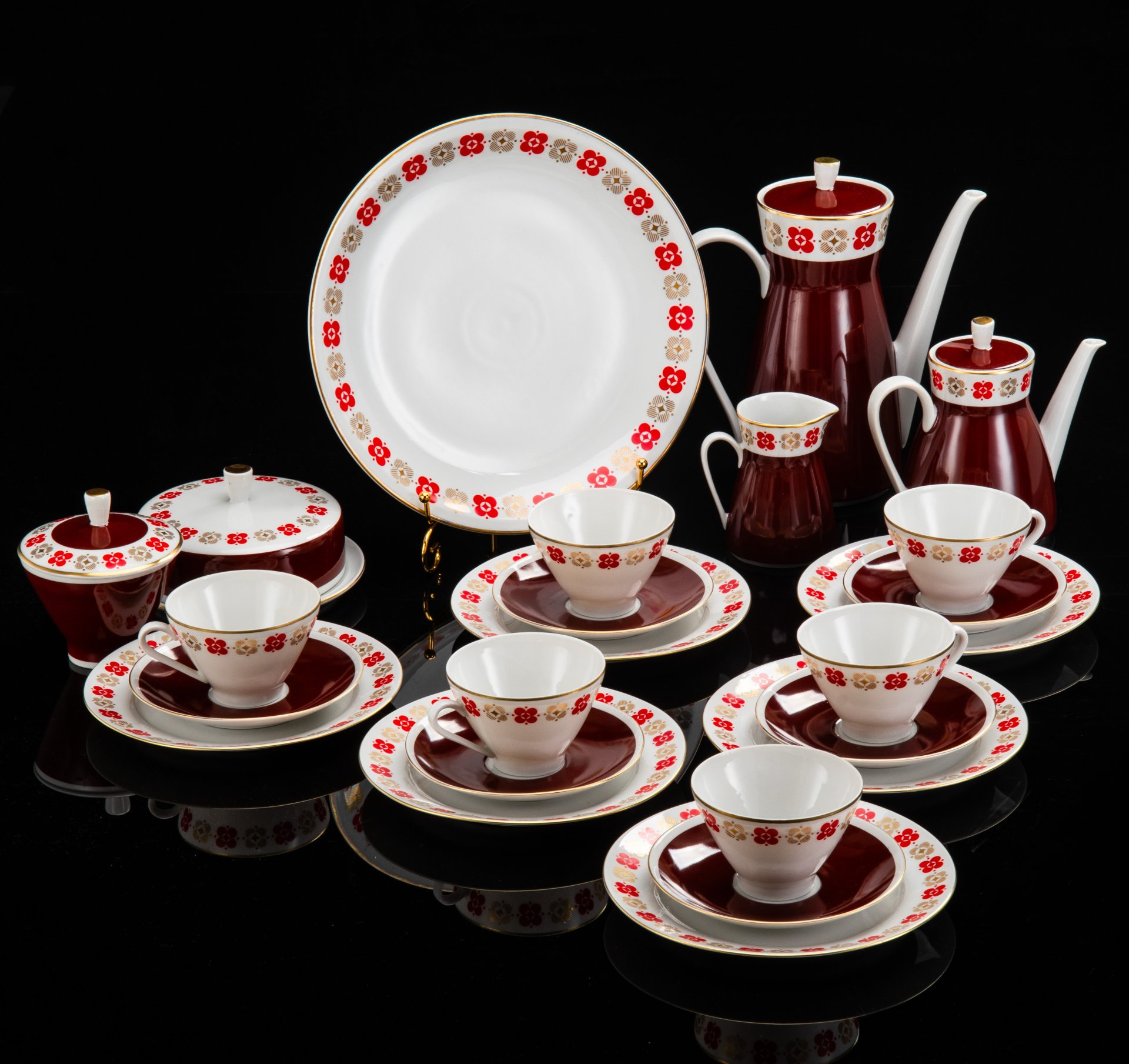 Сервиз чайно-кофейный на 5 персон, украшенный геометрическим орнаментом (19 предметов), фарфор, деколь, золочение, Рижский фарфорово-фаянсовый завод, СССР, 1970-1980 гг.