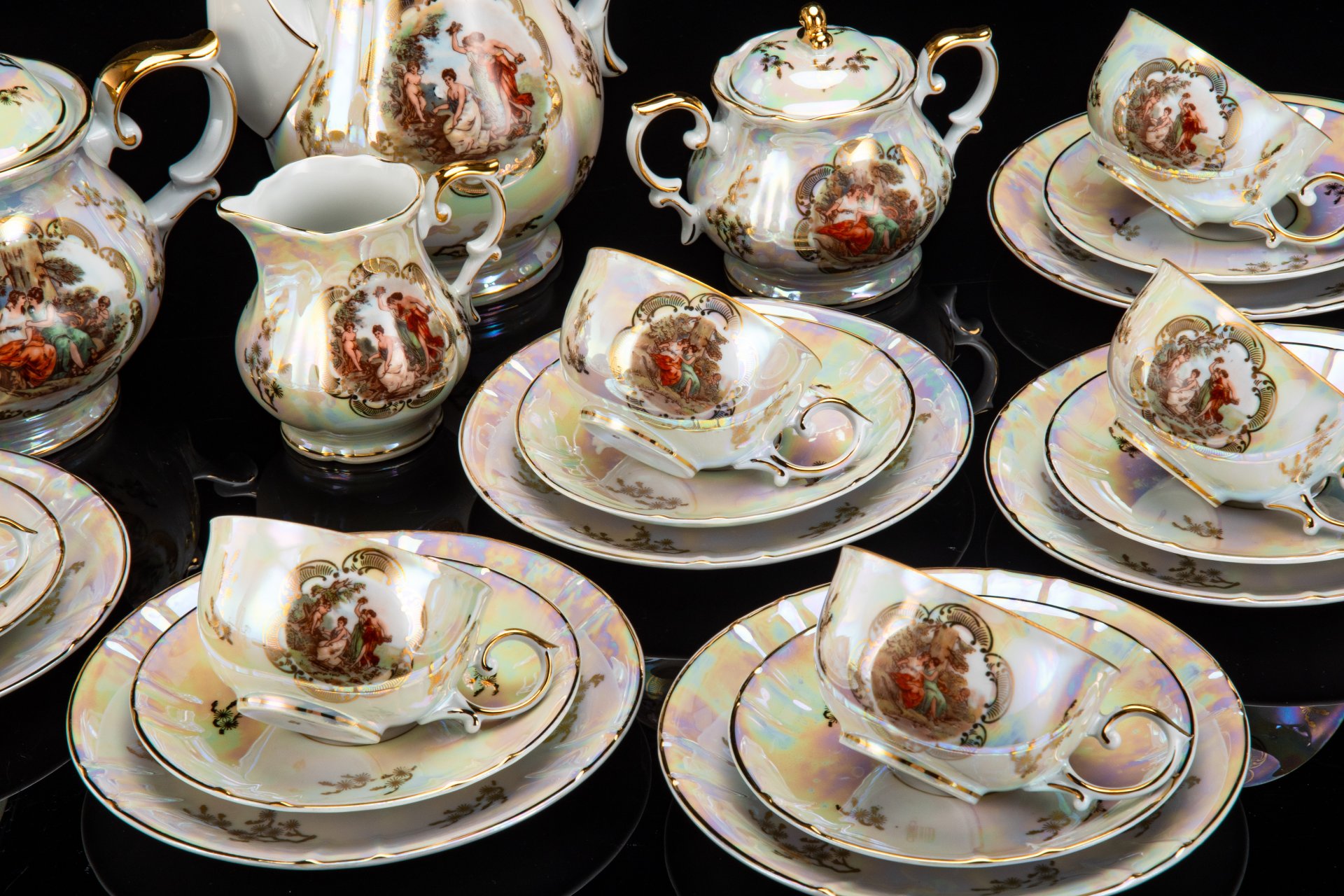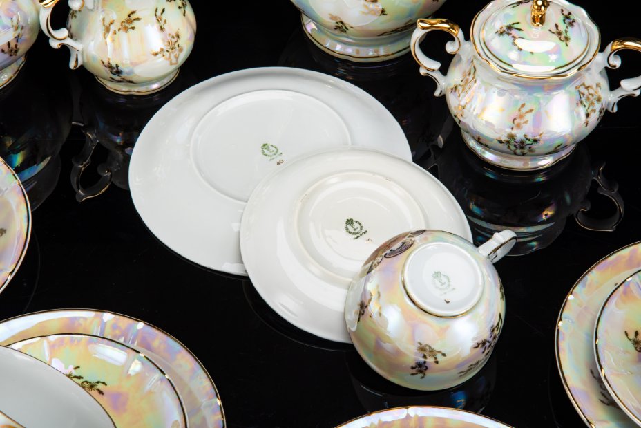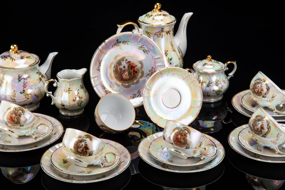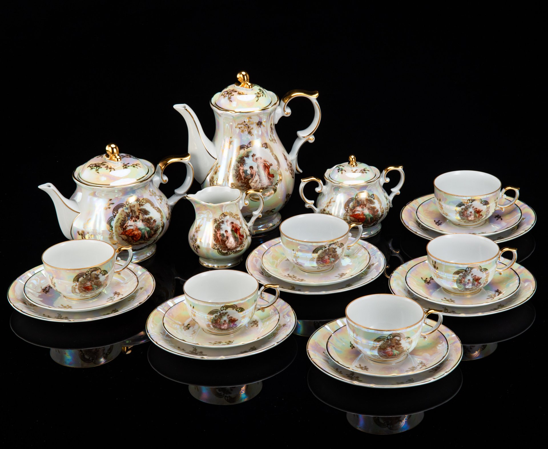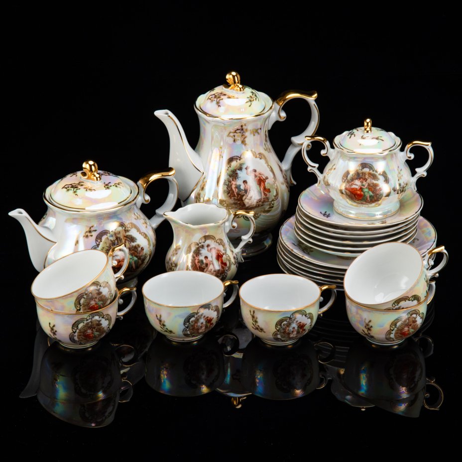 Сервиз чайный с декором в виде роз на 6 персон (28 предметов), фарфор, деколь, люстр, золочение, Colditz (Кольдиц), ГДР, 1970-1990 гг.