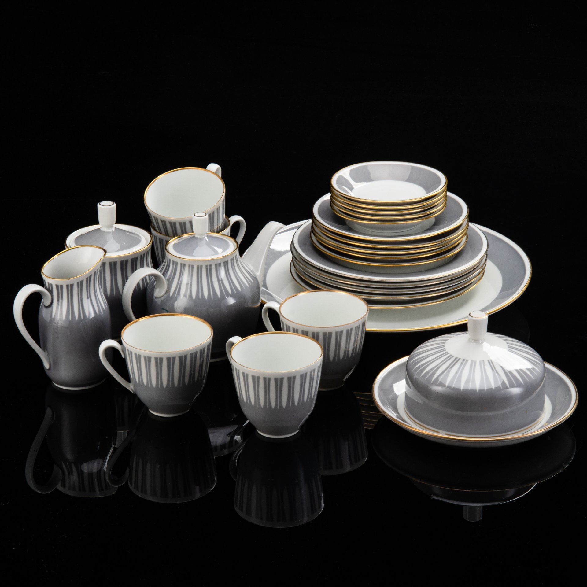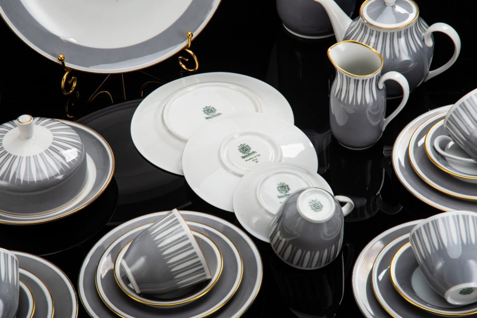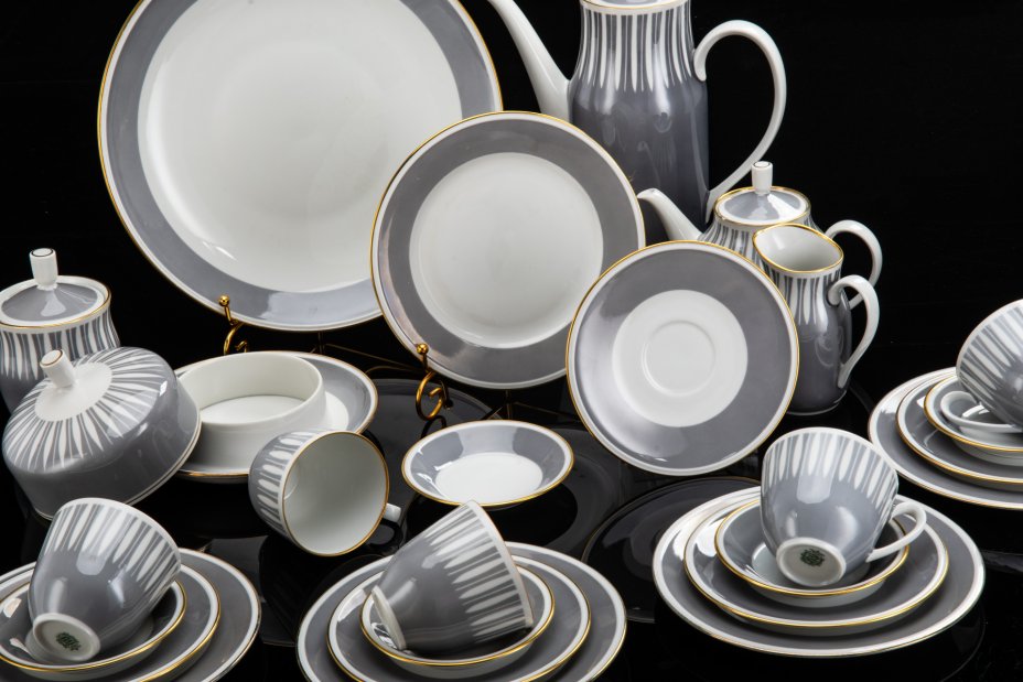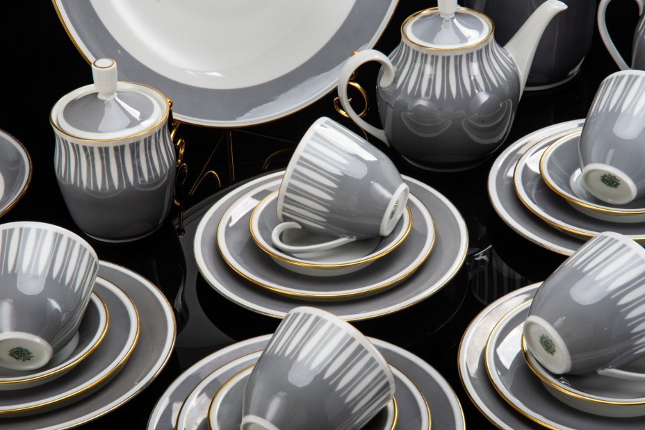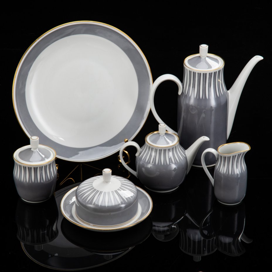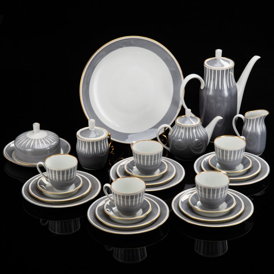 Сервиз чайно-кофейный на 6 персон, украшенный ленточным орнаментом (16 предметов), фарфор, золочение, Thun (Тун), Чехословакия, 1918-1945 гг.