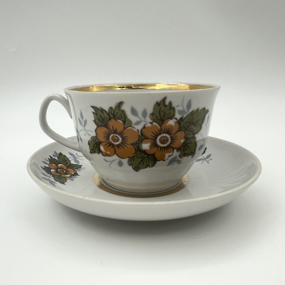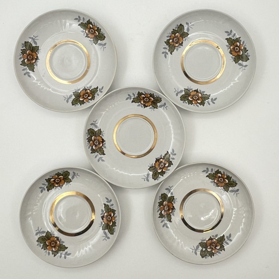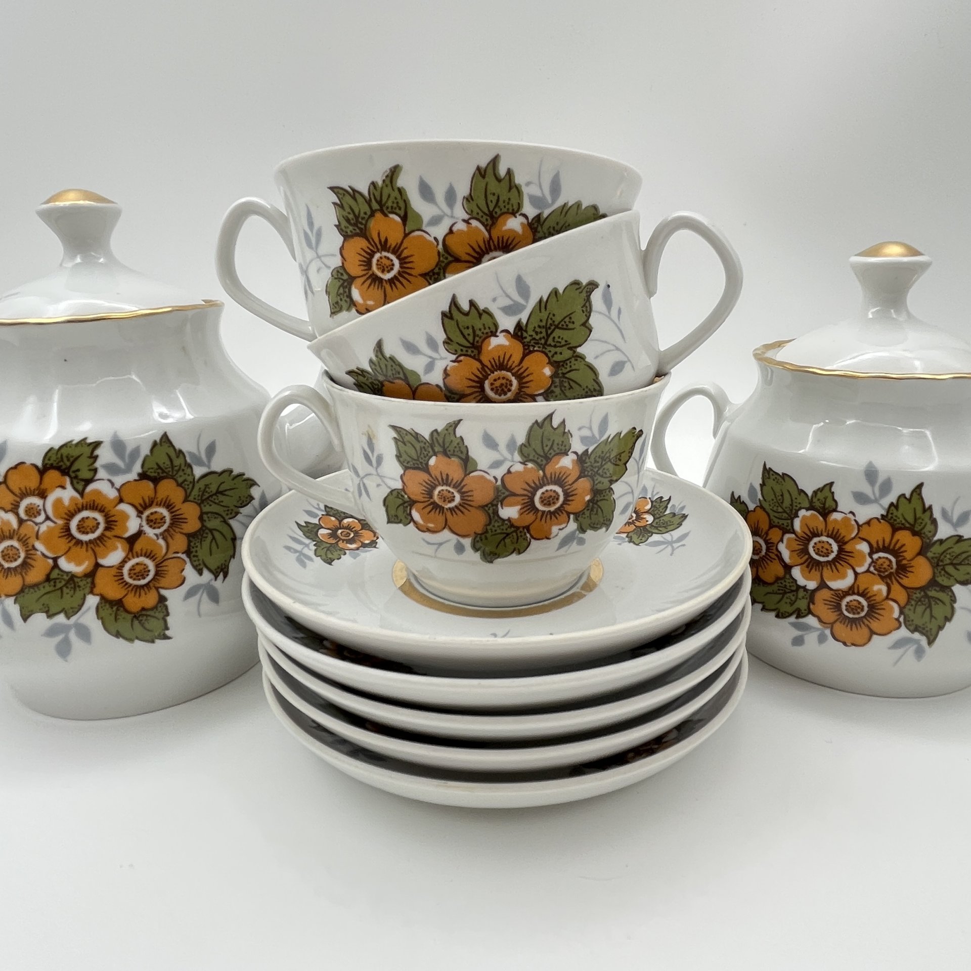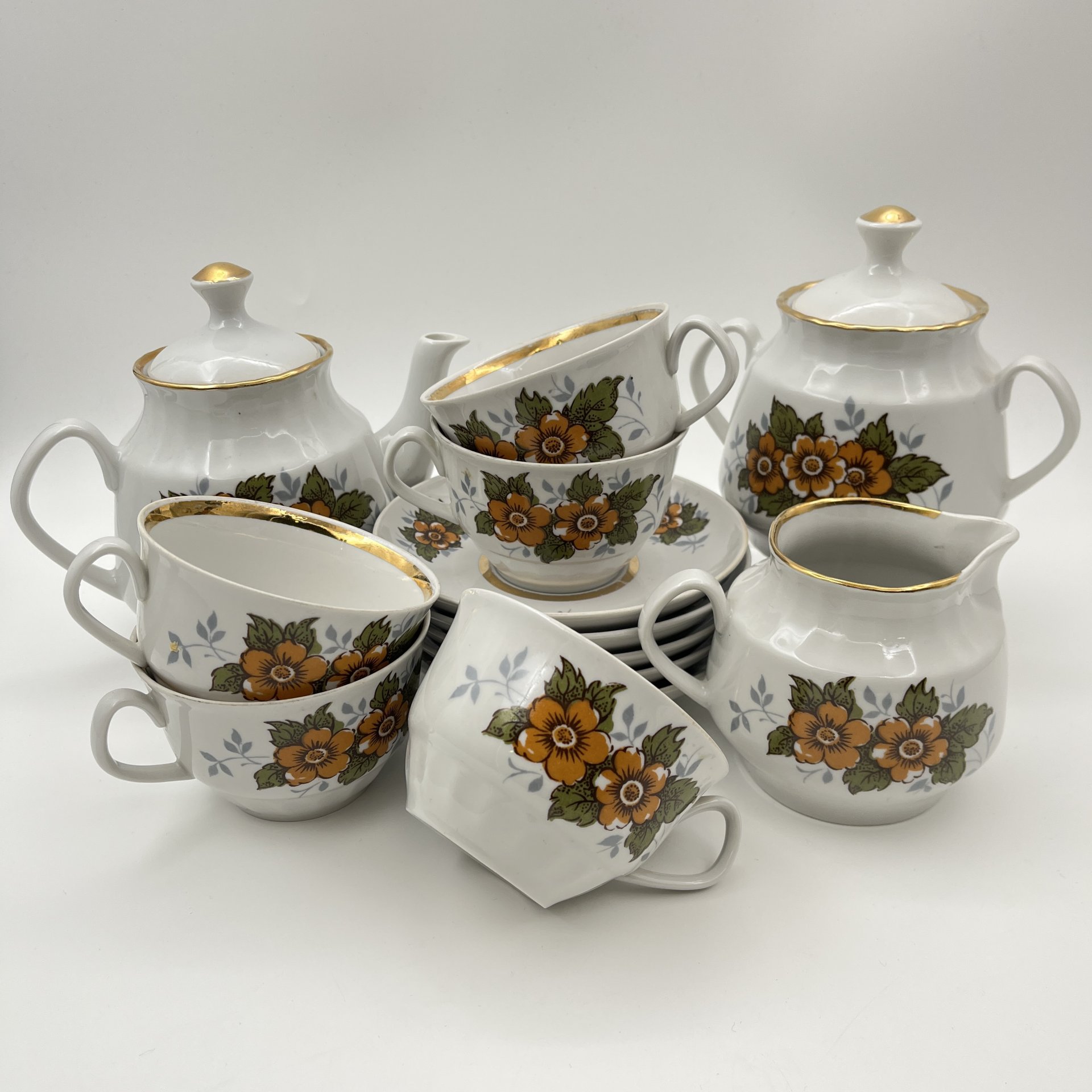 Сервиз чайно-кофейный на 6 персон, украшенный растительным декором, керамика, глазурь, роспись, СССР, 1970-1990 гг.