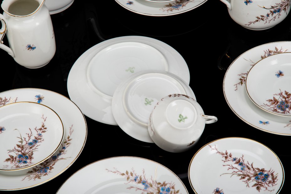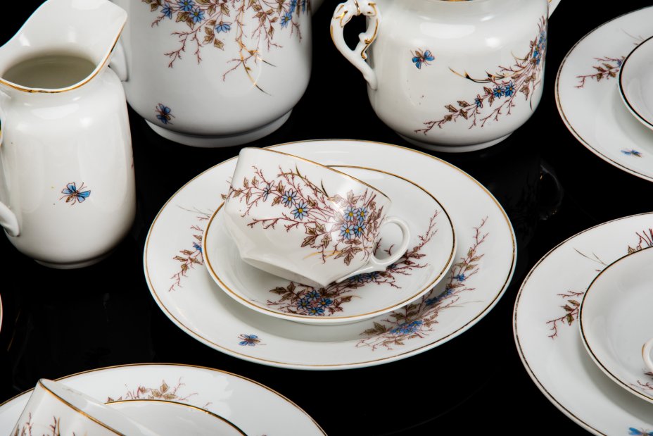 Сервиз чайно-кофейный на 5 персон, украшенный геометрическим орнаментом (19 предметов), фарфор, деколь, золочение, Рижский фарфорово-фаянсовый завод, СССР, 1970-1980 гг.