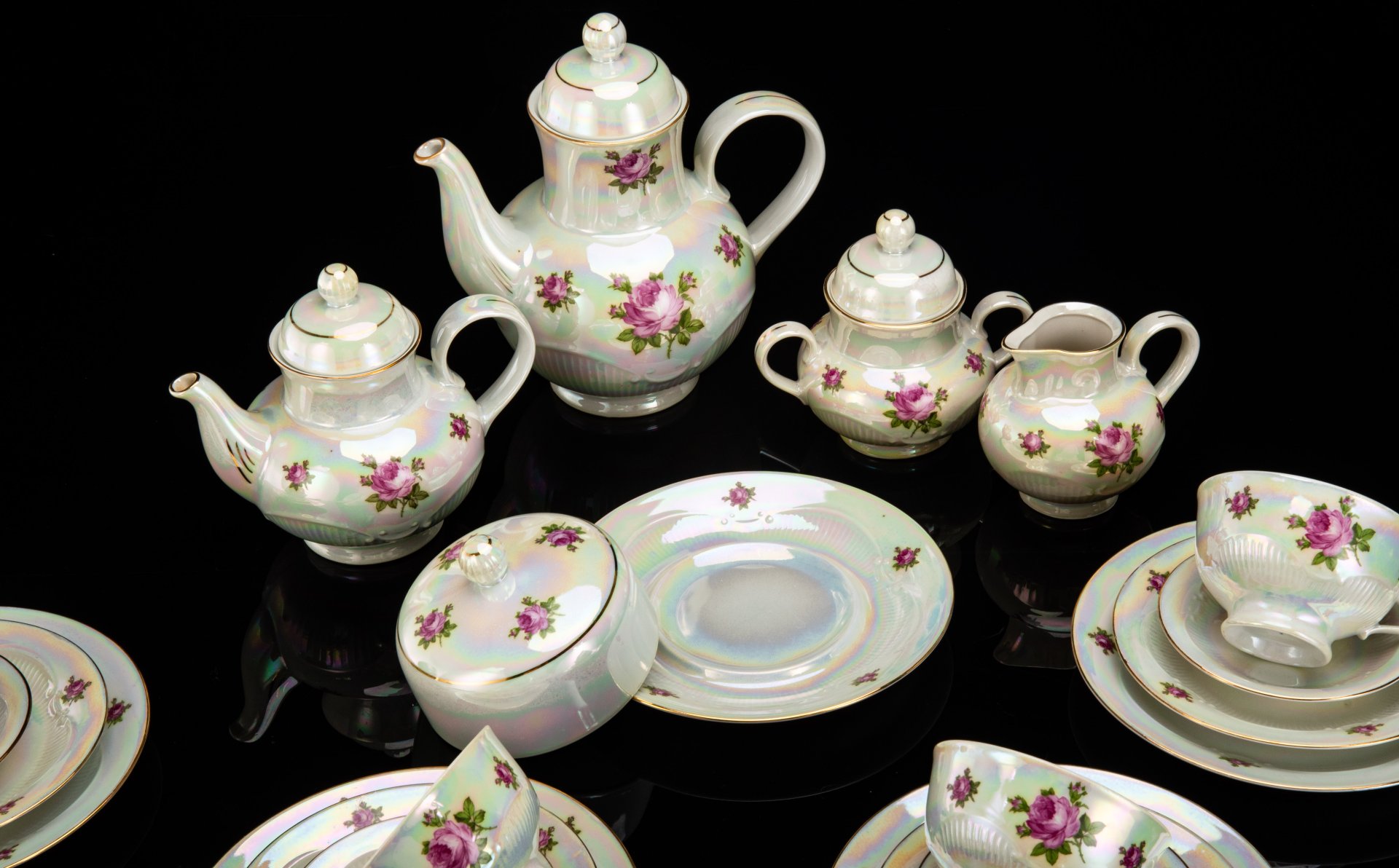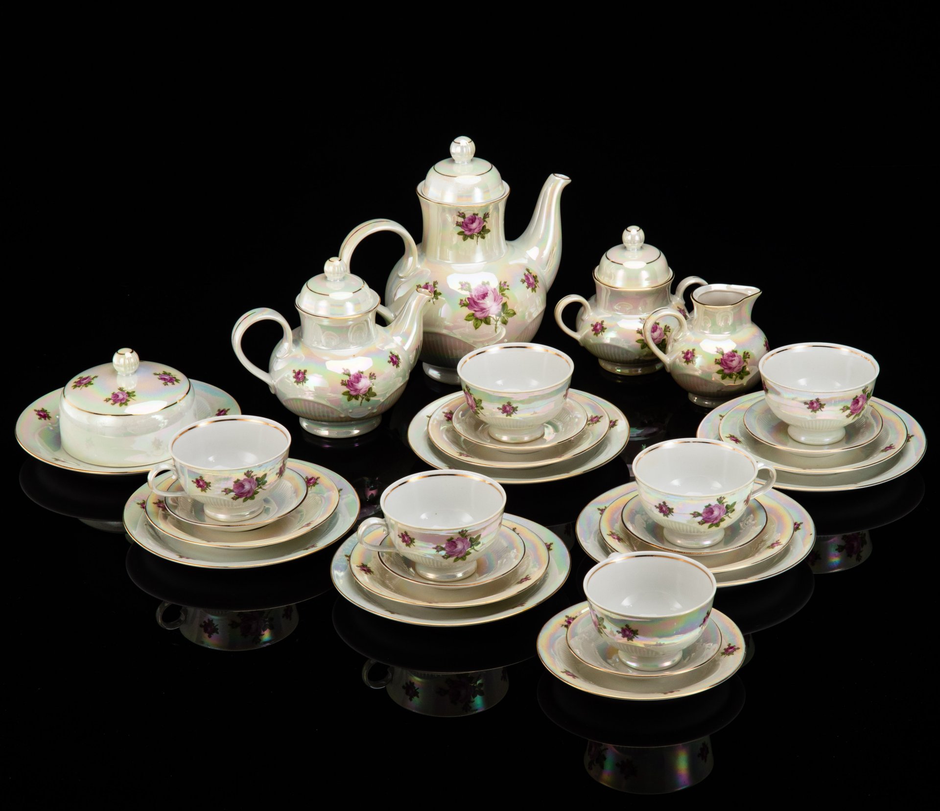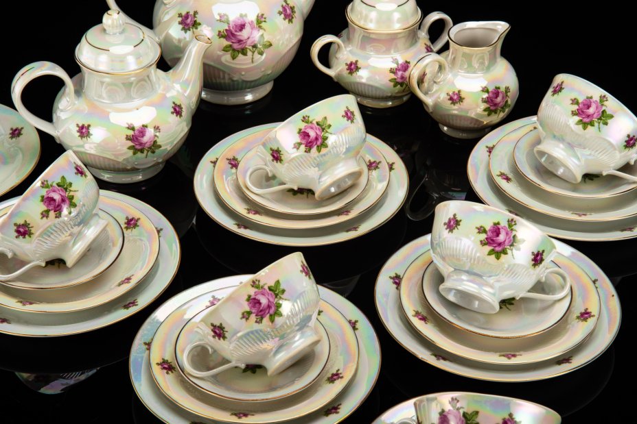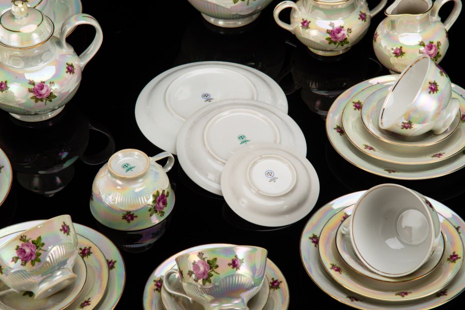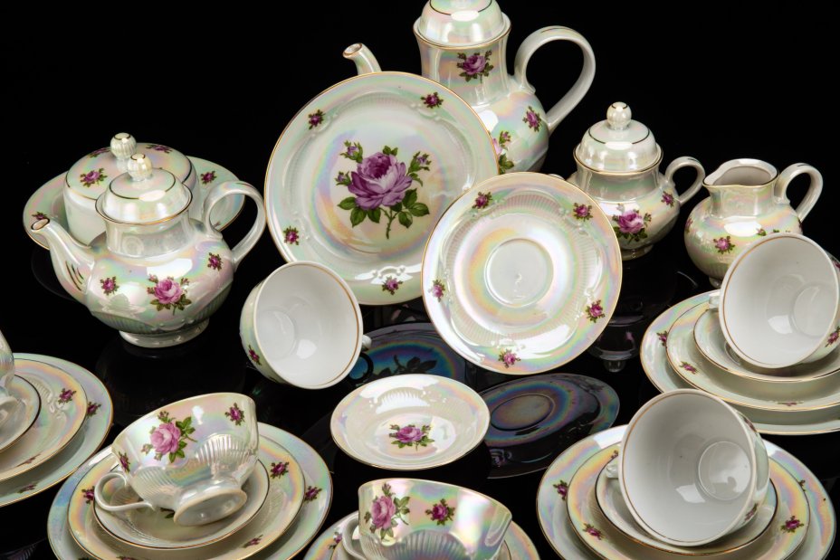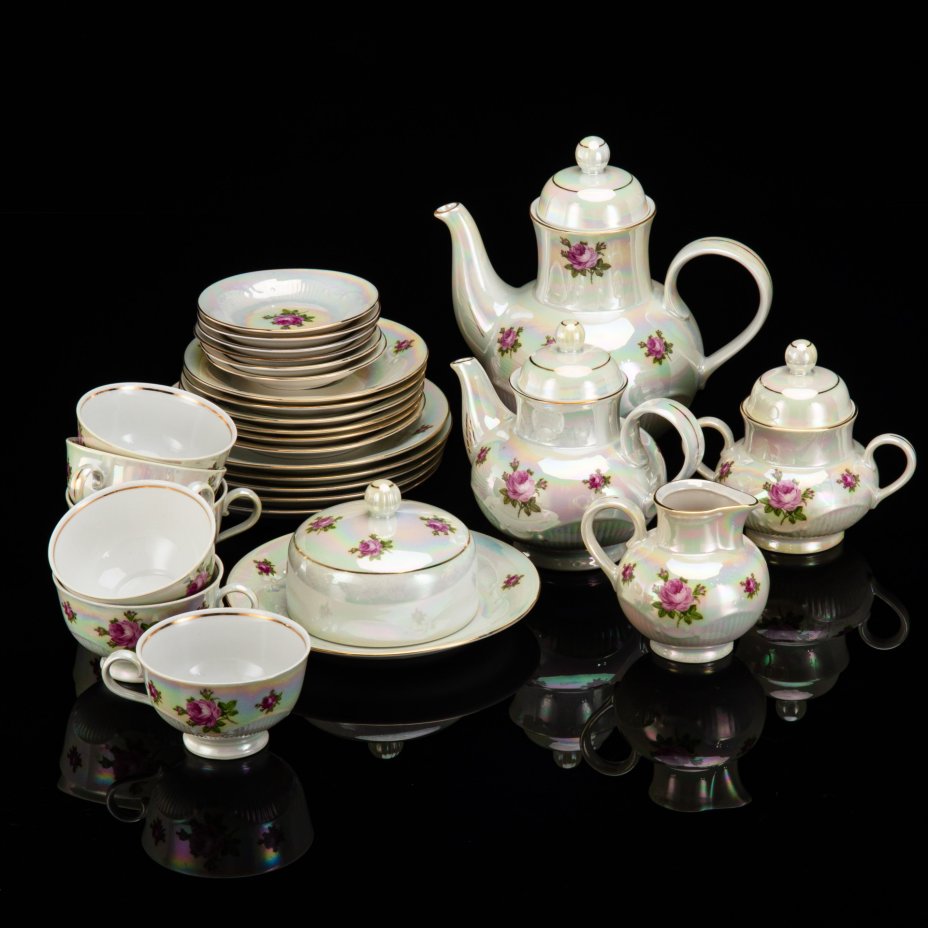 Сервиз чайно-кофейный , украшенный античными сценами ("Мадонна") на 6 персон (22 предмета), фарфор, люстр, деколь, золочение, Oscar Schlegelmilch, Германия, 1950-1972 гг.