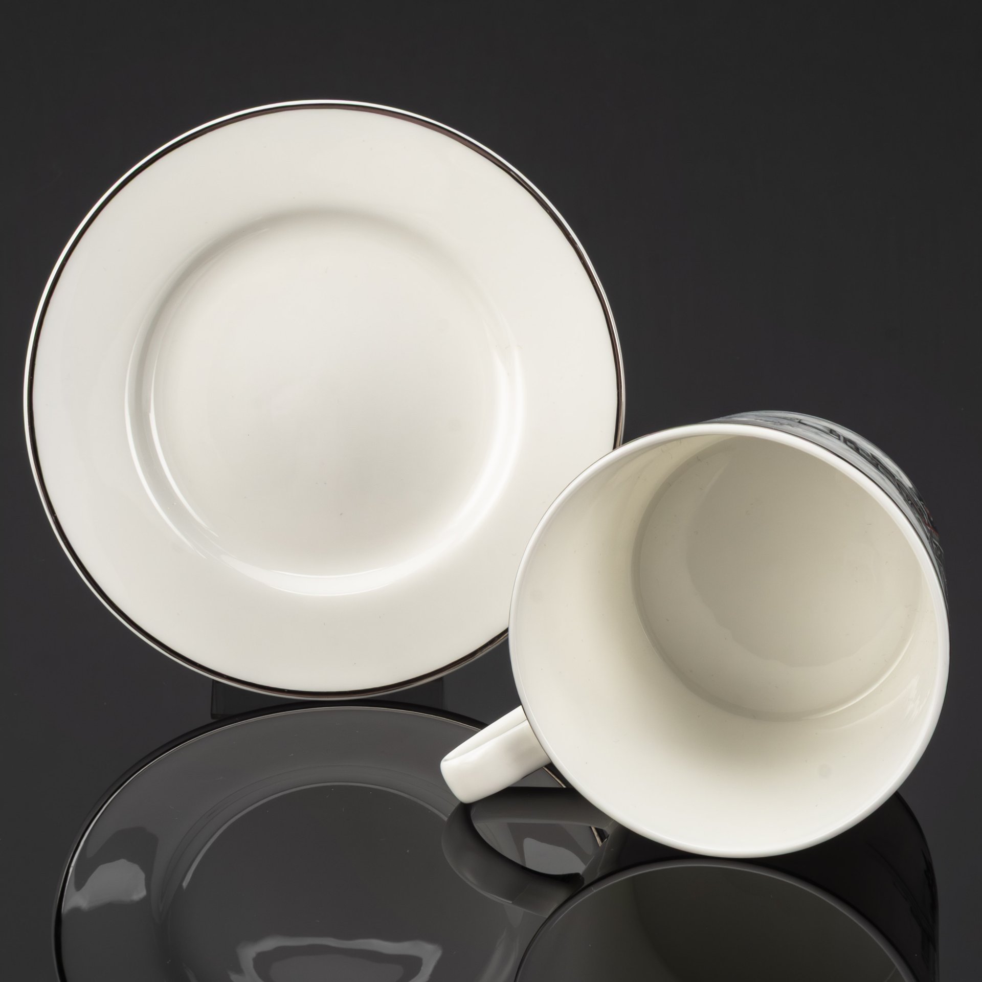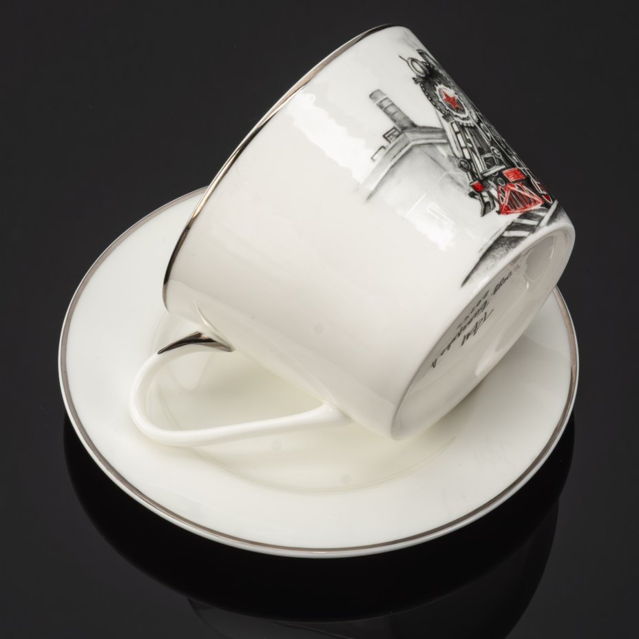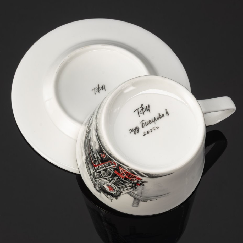 Чайная пара "Железная дорога", фарфор, роспись, серебрение, Российская Федерация, 2025 г.