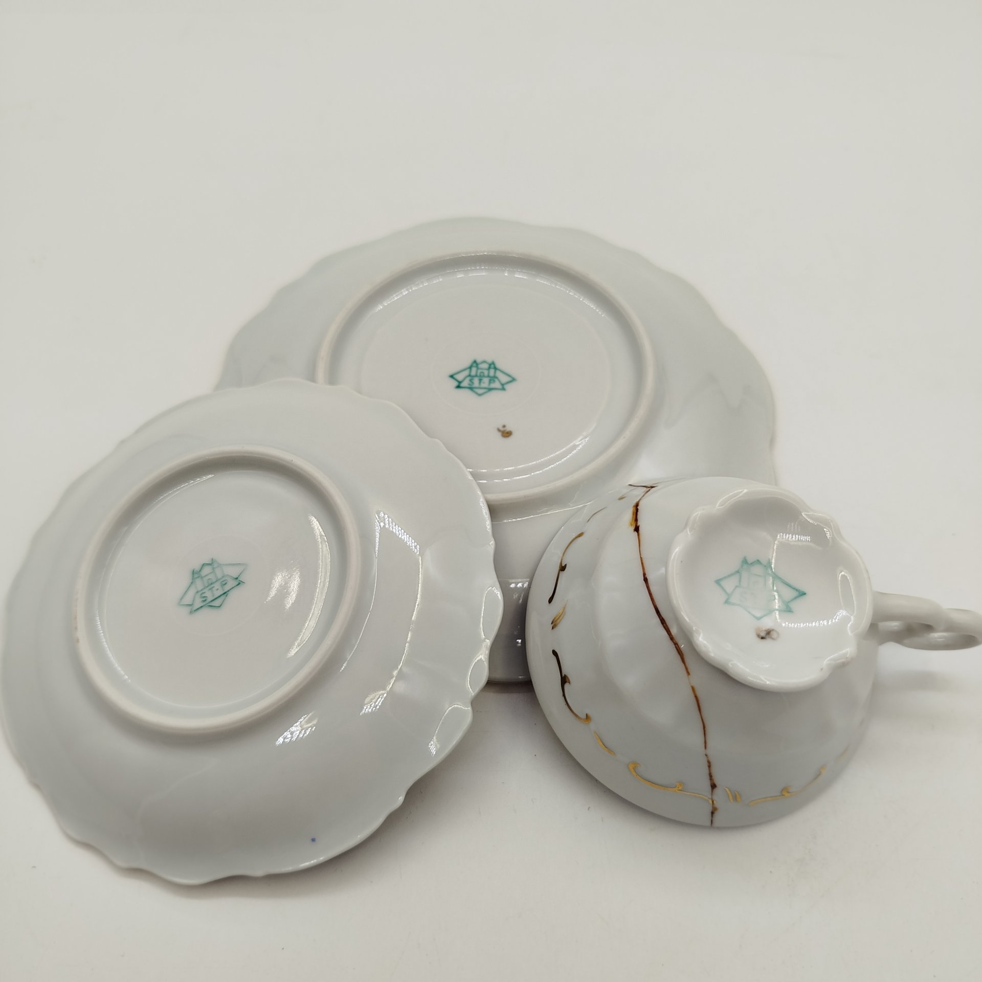 Сервиз чайный со стилизованным цветочным декором на 5 персон (19 предметов), завод "Lubiana", фарфор, деколь, золочение, Польша, 1966-1994 гг.