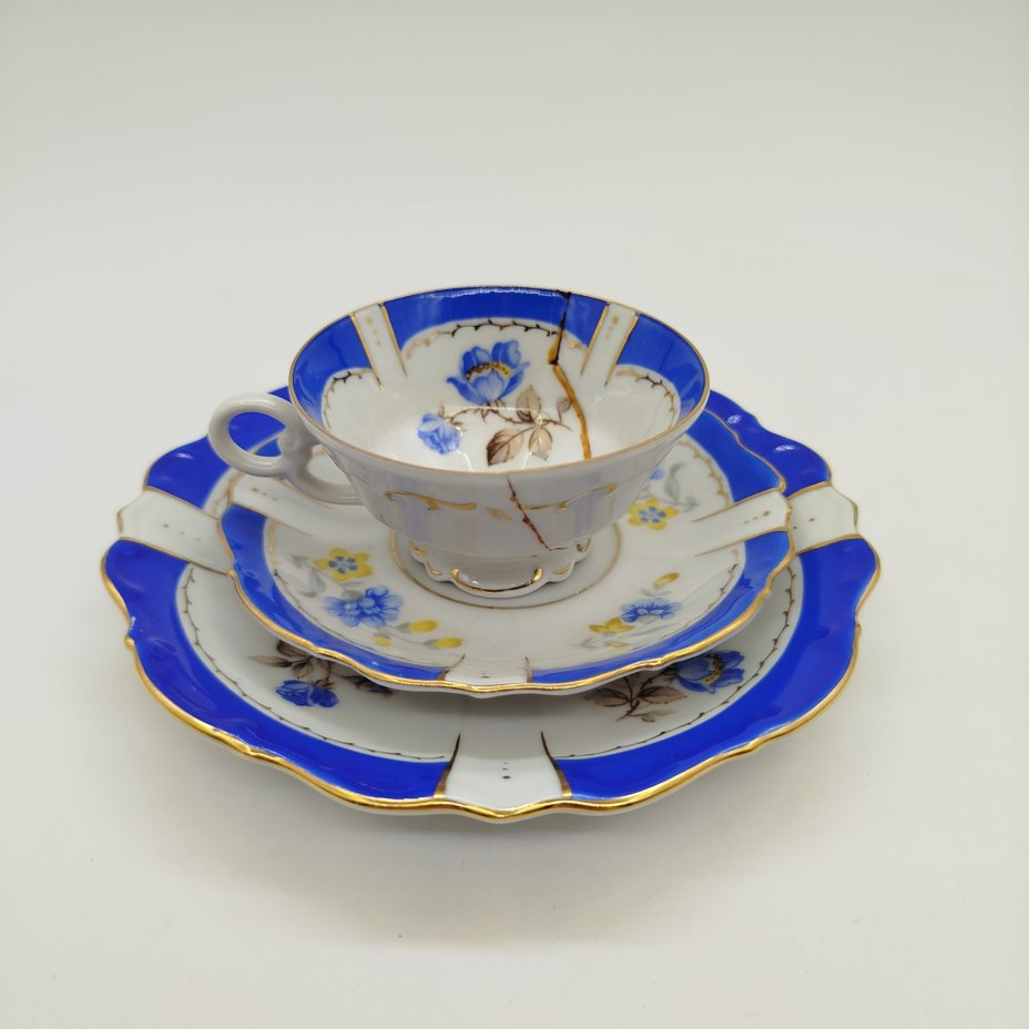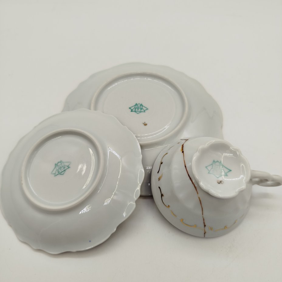 Чайная пара и десертное блюдце с абстрактным двухцветным декором, фарфор, роспись, золочение, Артёмовский опытно-экспериментальный фарфоровый завод, СССР, 1970-1980 гг.