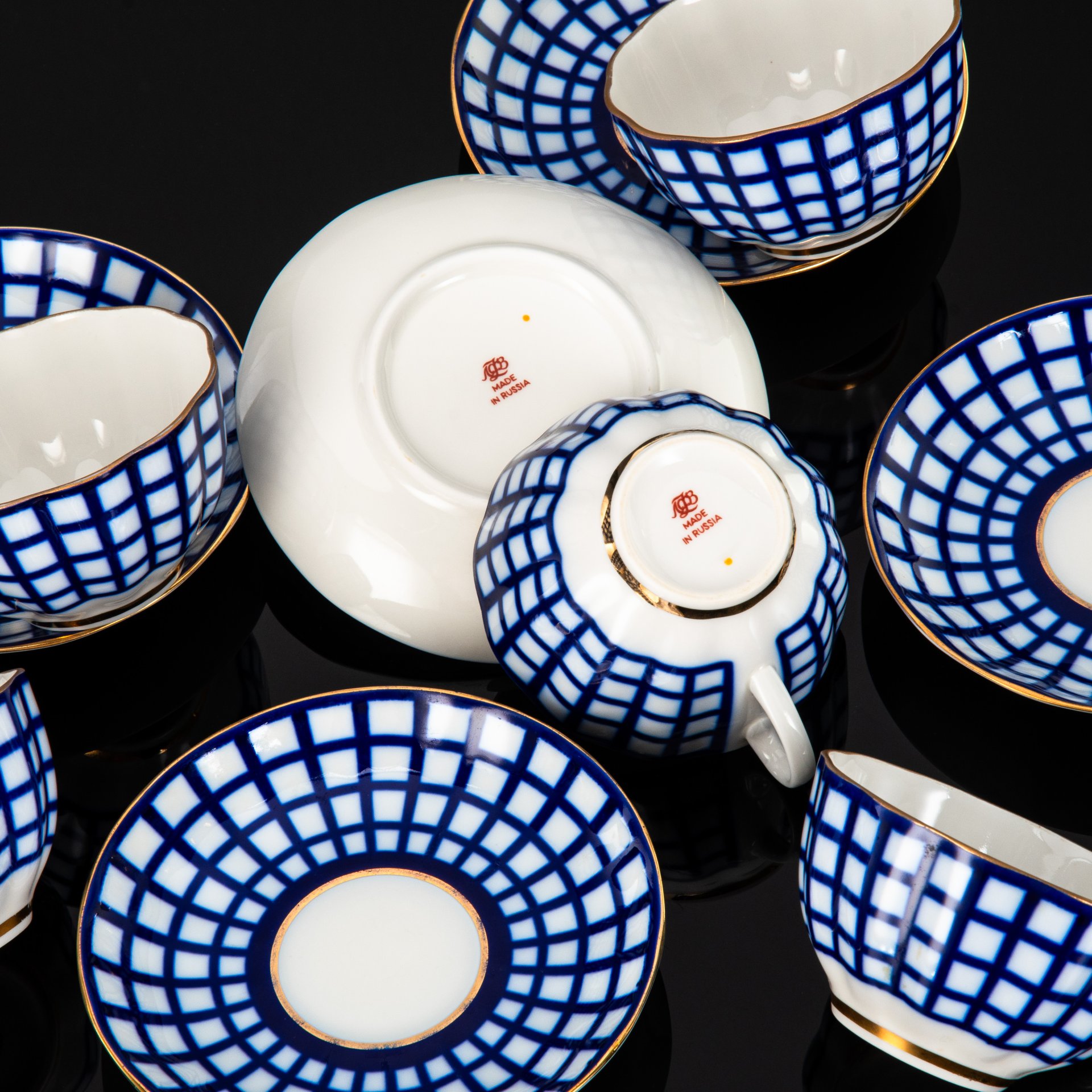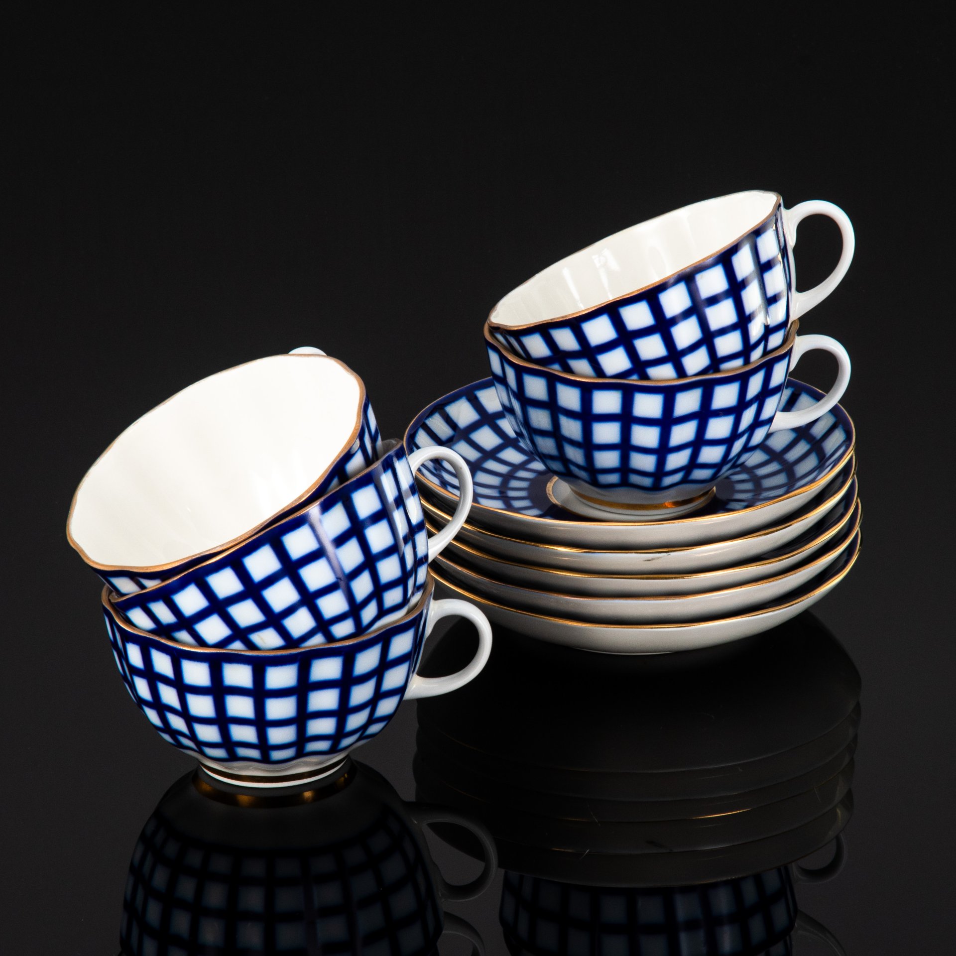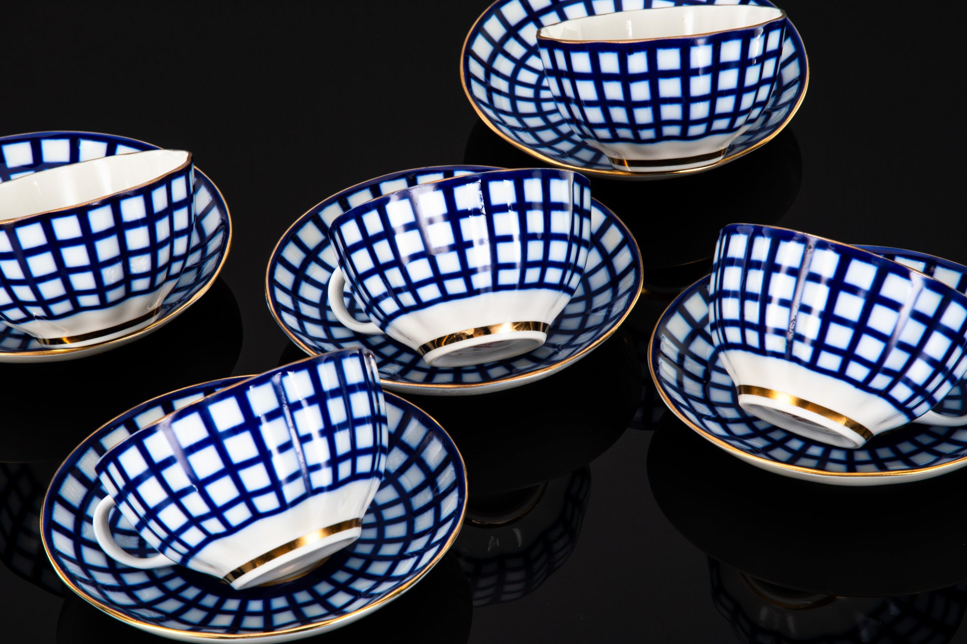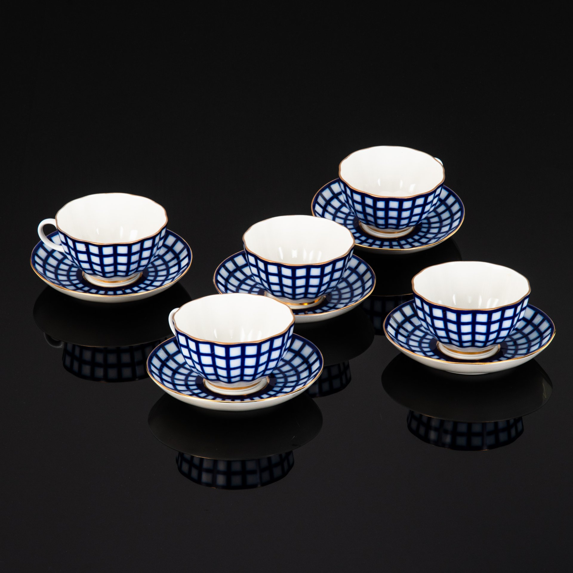 Чайная пара и десертное блюдце с абстрактным двухцветным декором, фарфор, роспись, золочение, Артёмовский опытно-экспериментальный фарфоровый завод, СССР, 1970-1980 гг.