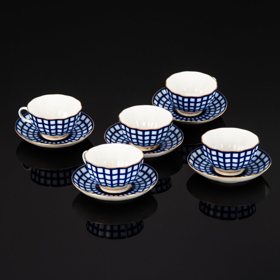 Набор из 5-ти чайных пар с цветочным декором, цветное стекло, деколь, золочение, Россия, 1980-2000 гг.