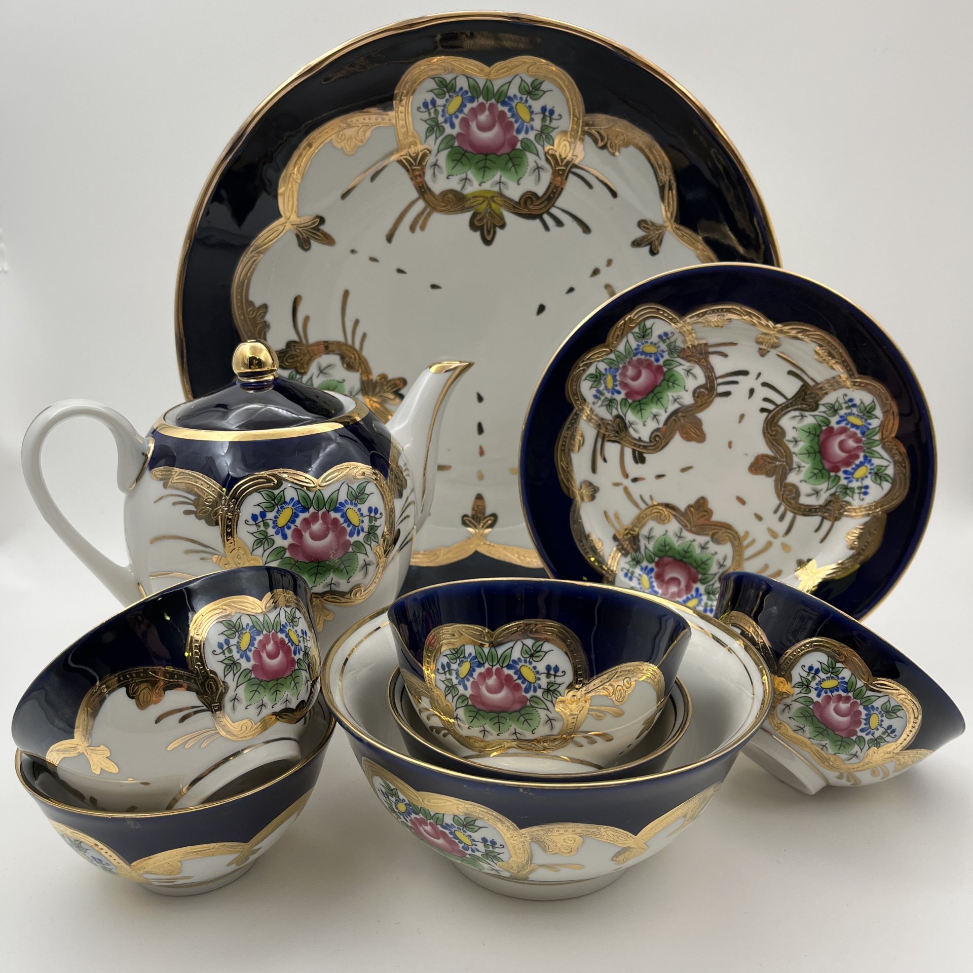 Сервиз чайный на 5 персон, украшенный цветочным декором, фарфор, деколь, золочение, Дулевский фарфоровый завод (Дулёво), СССР, 1958 г.