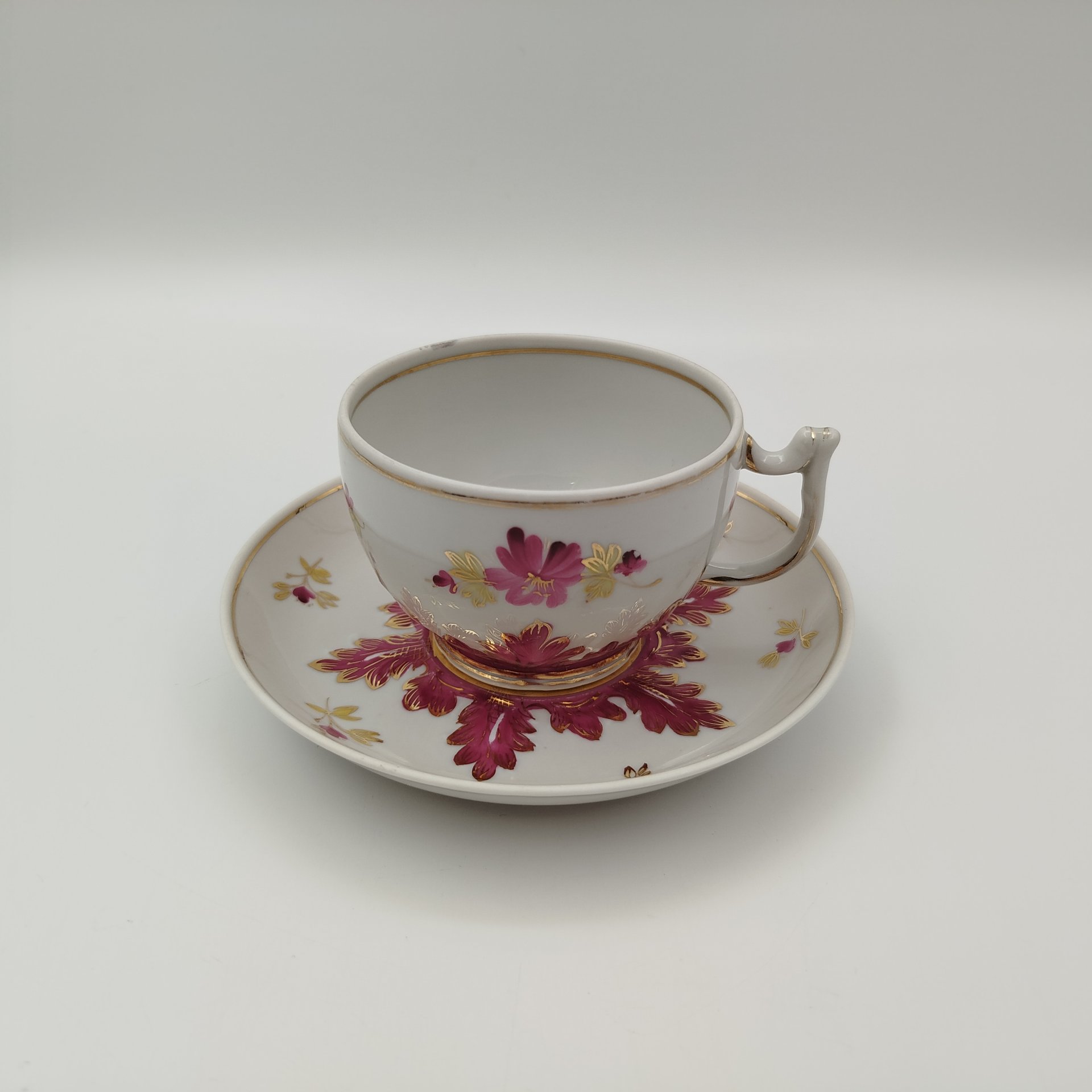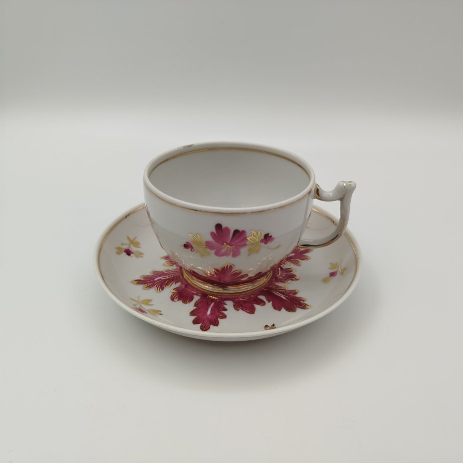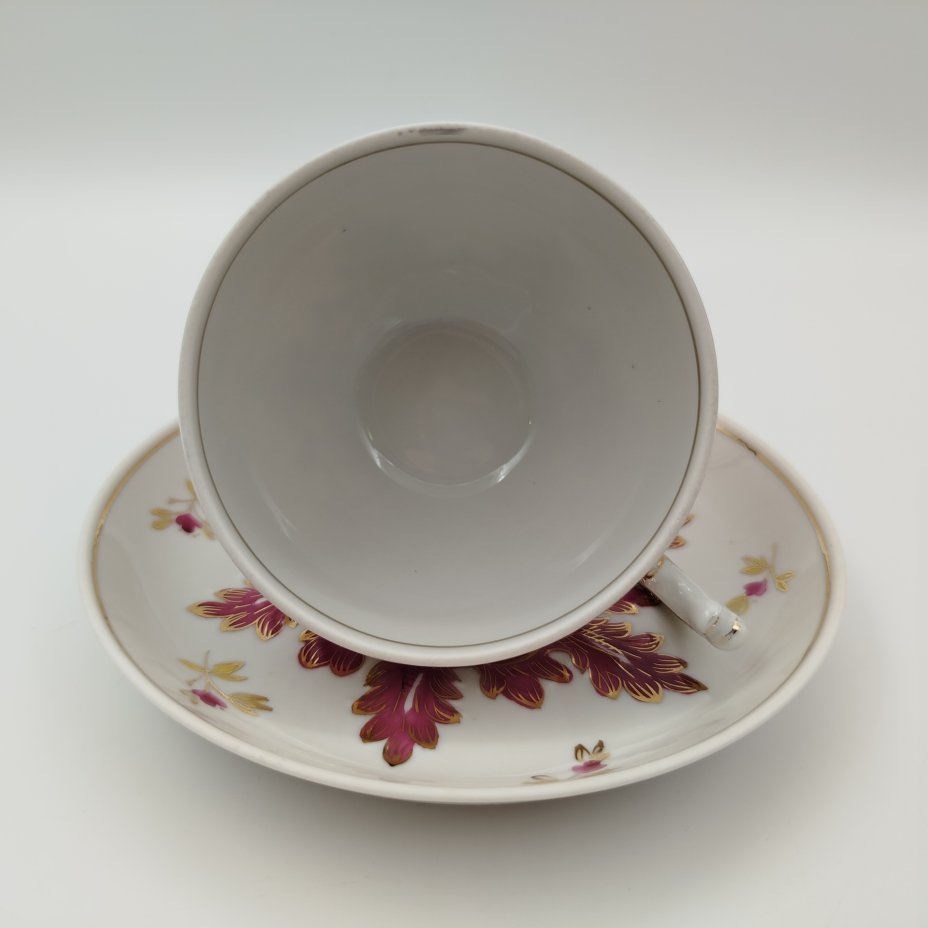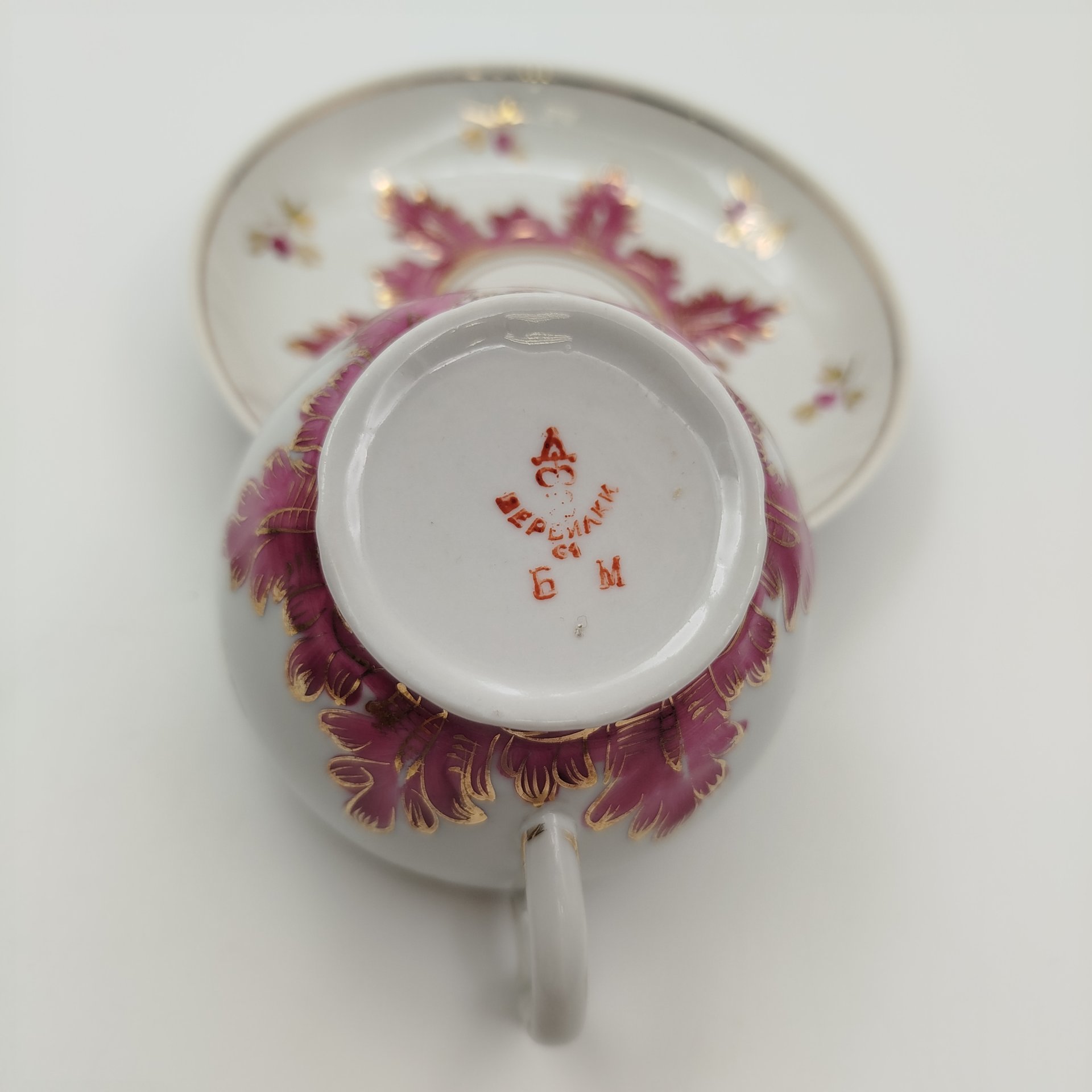 Пара чайная "Барбарис" в пурпурном оттенке, автор Е.П. Смирнов, фарфор, роспись, золочение, Дмитровский фарфоровый завод (ДФЗ Вербилки), СССР, 1954-1965 гг.