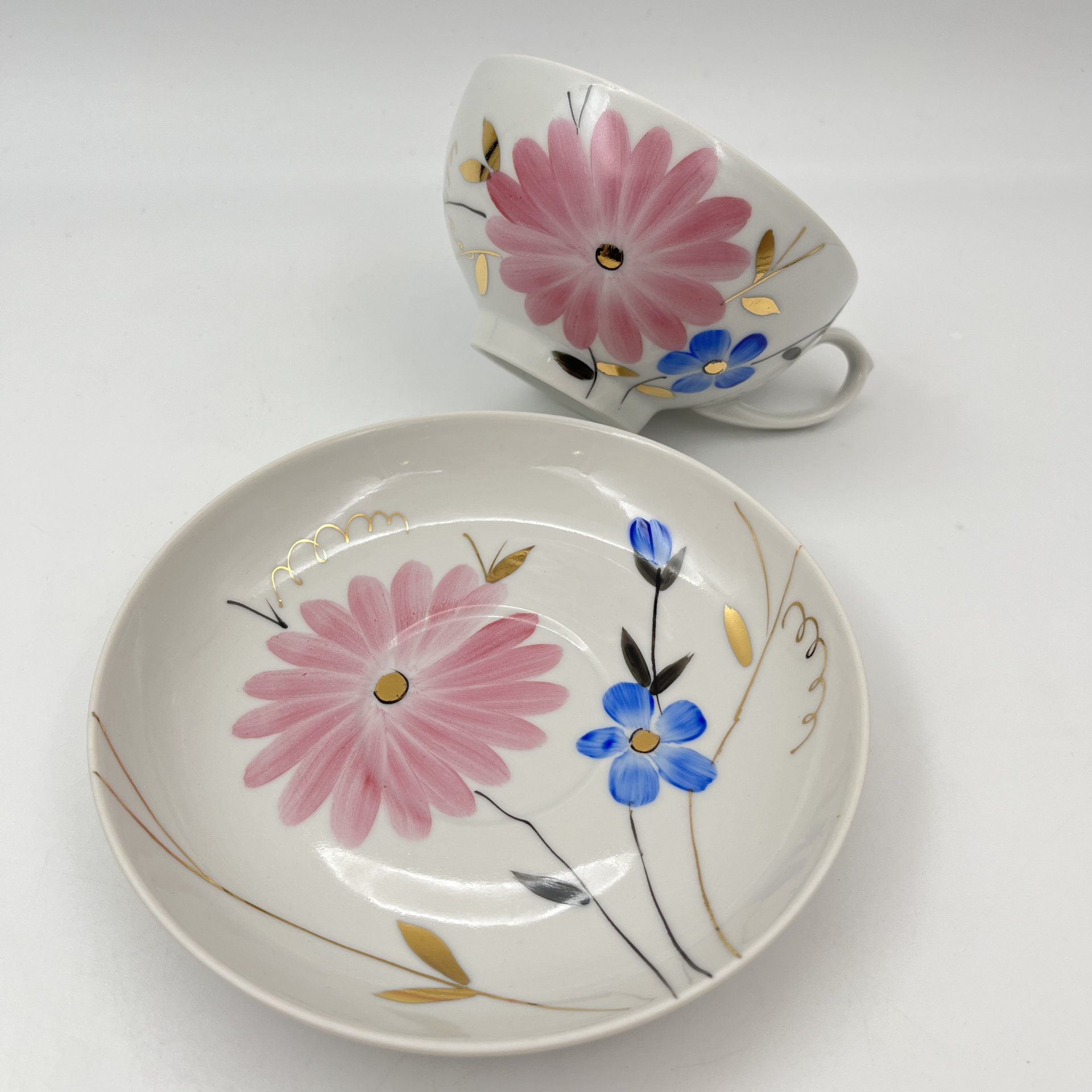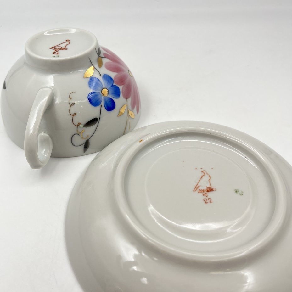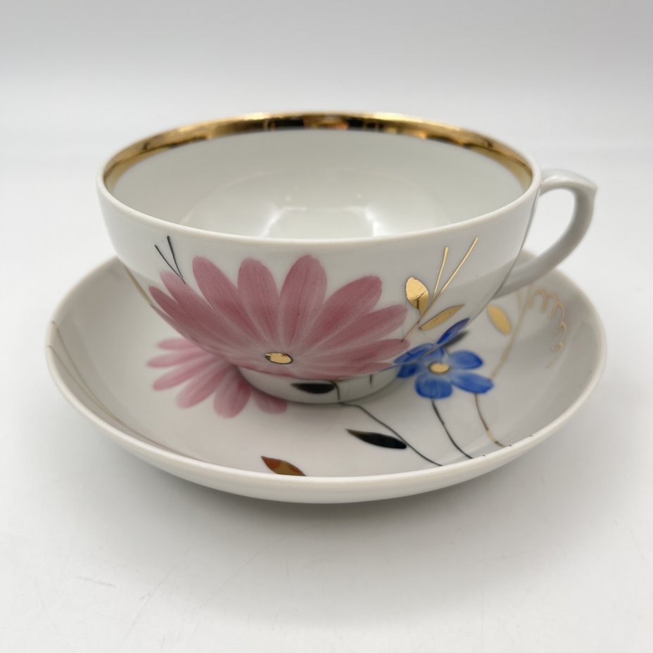 Пара чайная с цветочным декором в виде астр, фарфор, роспись, золочение, Дулевский фарфоровый завод (Дулёво), СССР, 1968-1991 гг.