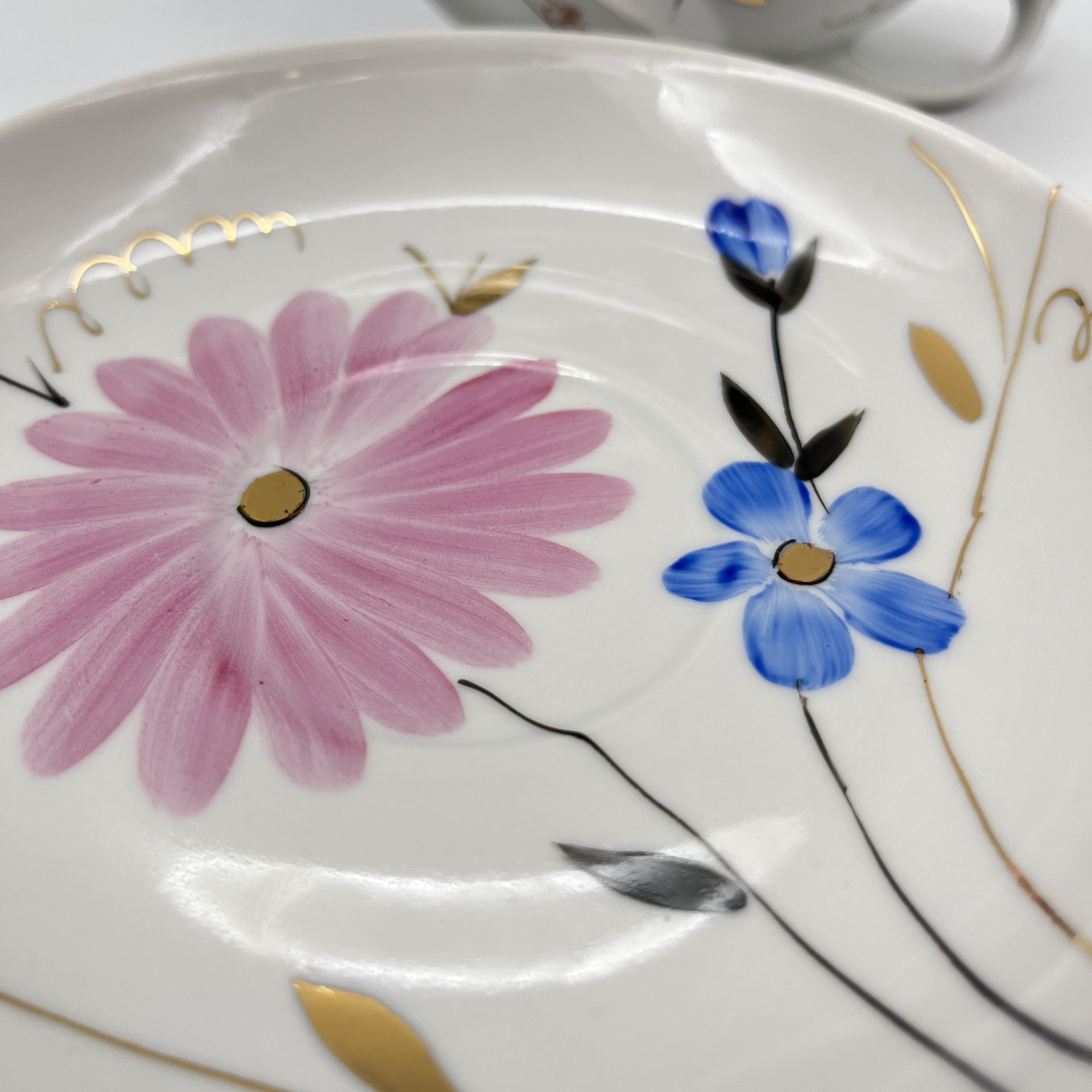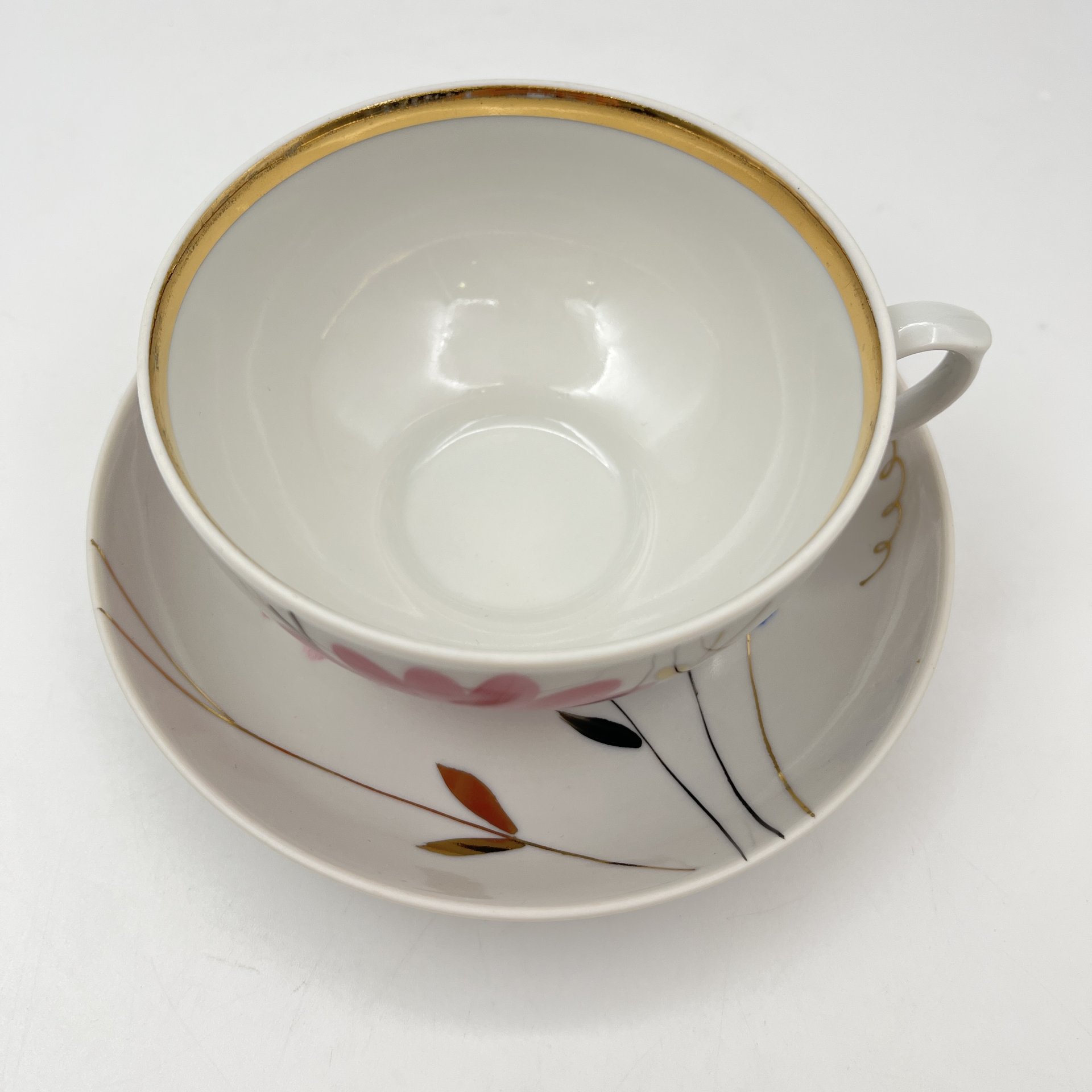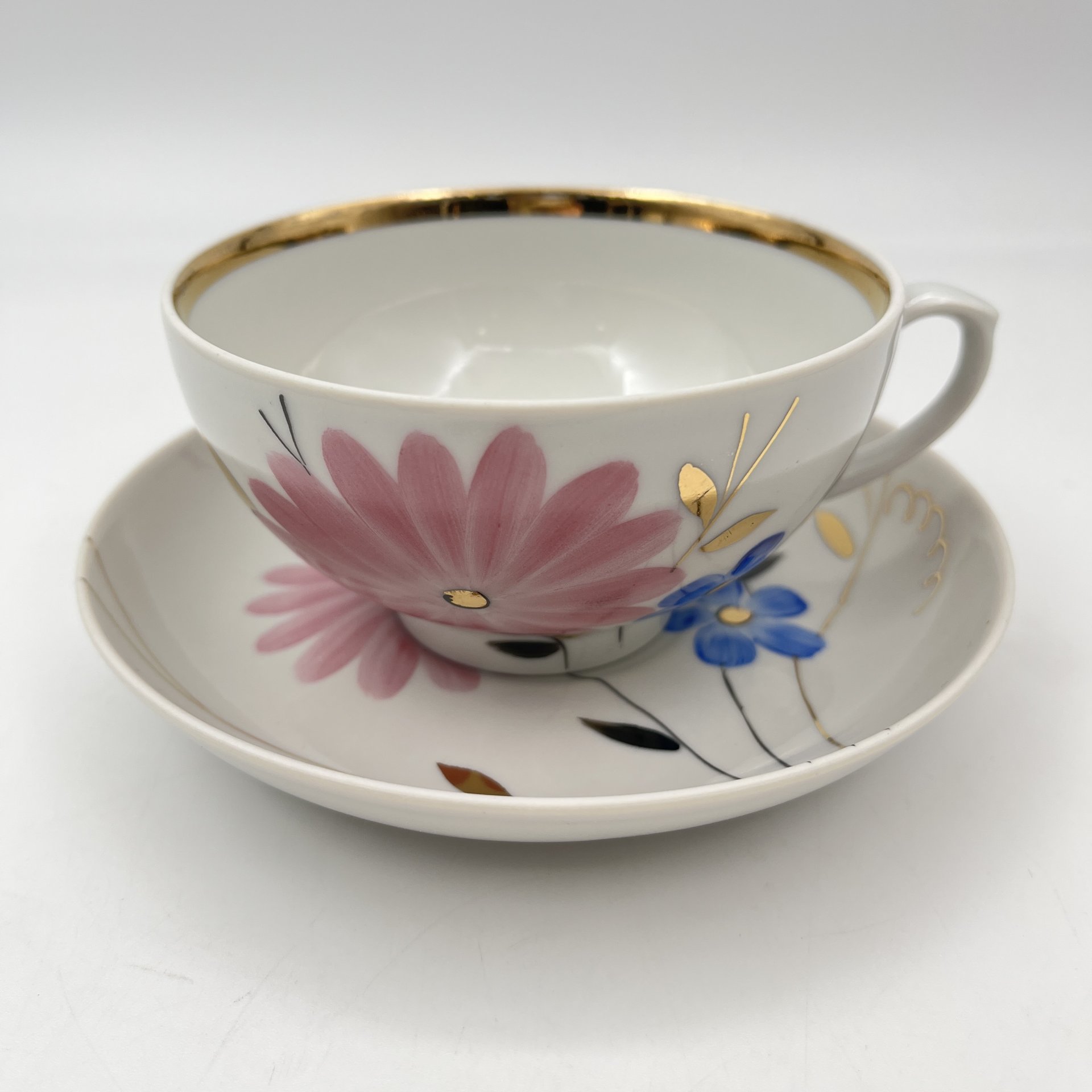 Пара чайная с цветочным декором в виде астр, фарфор, роспись, золочение, Дулевский фарфоровый завод (Дулёво), СССР, 1968-1991 гг.