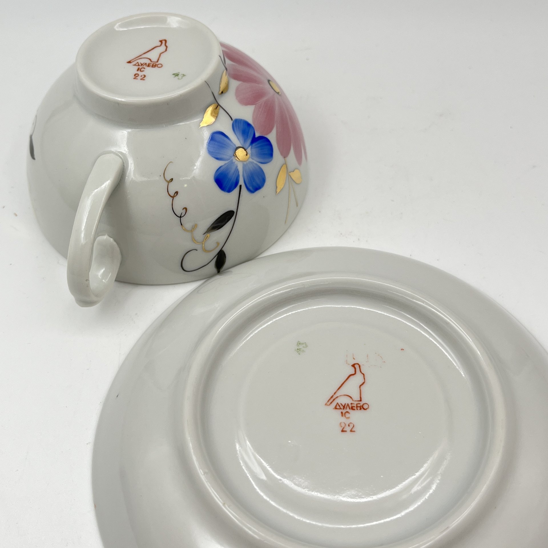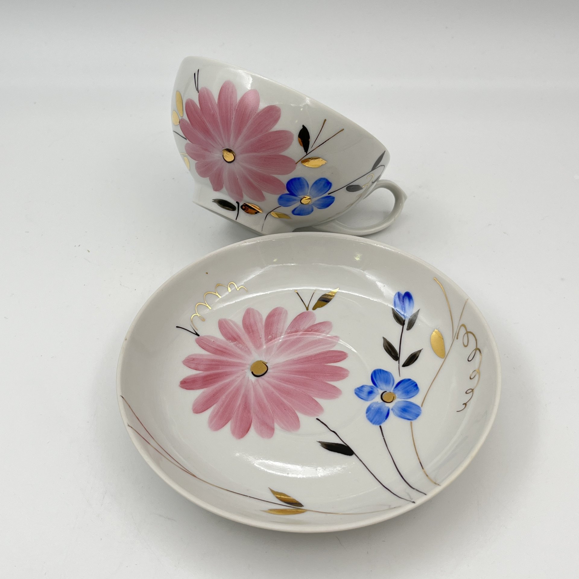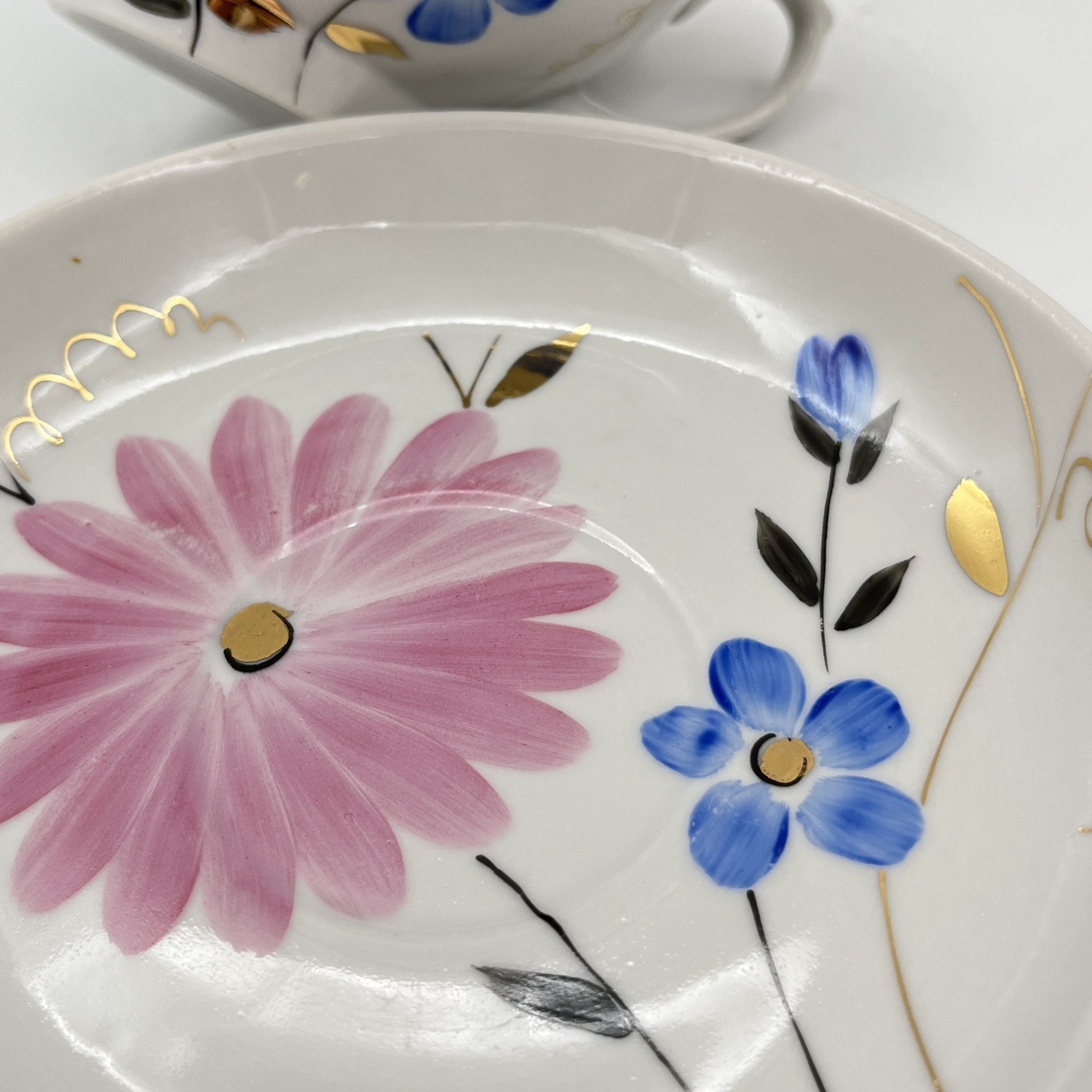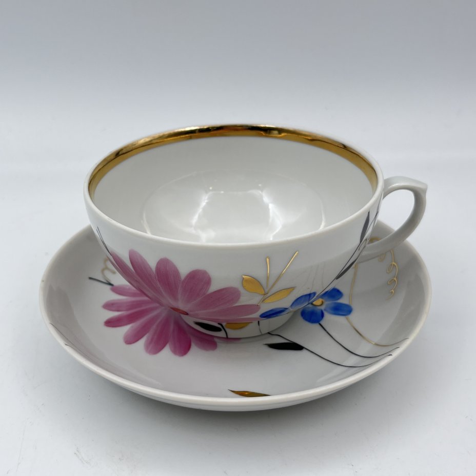Пара чайная с цветочным декором в виде астр, фарфор, роспись, золочение, Дулевский фарфоровый завод (Дулёво), СССР, 1968-1991 гг.