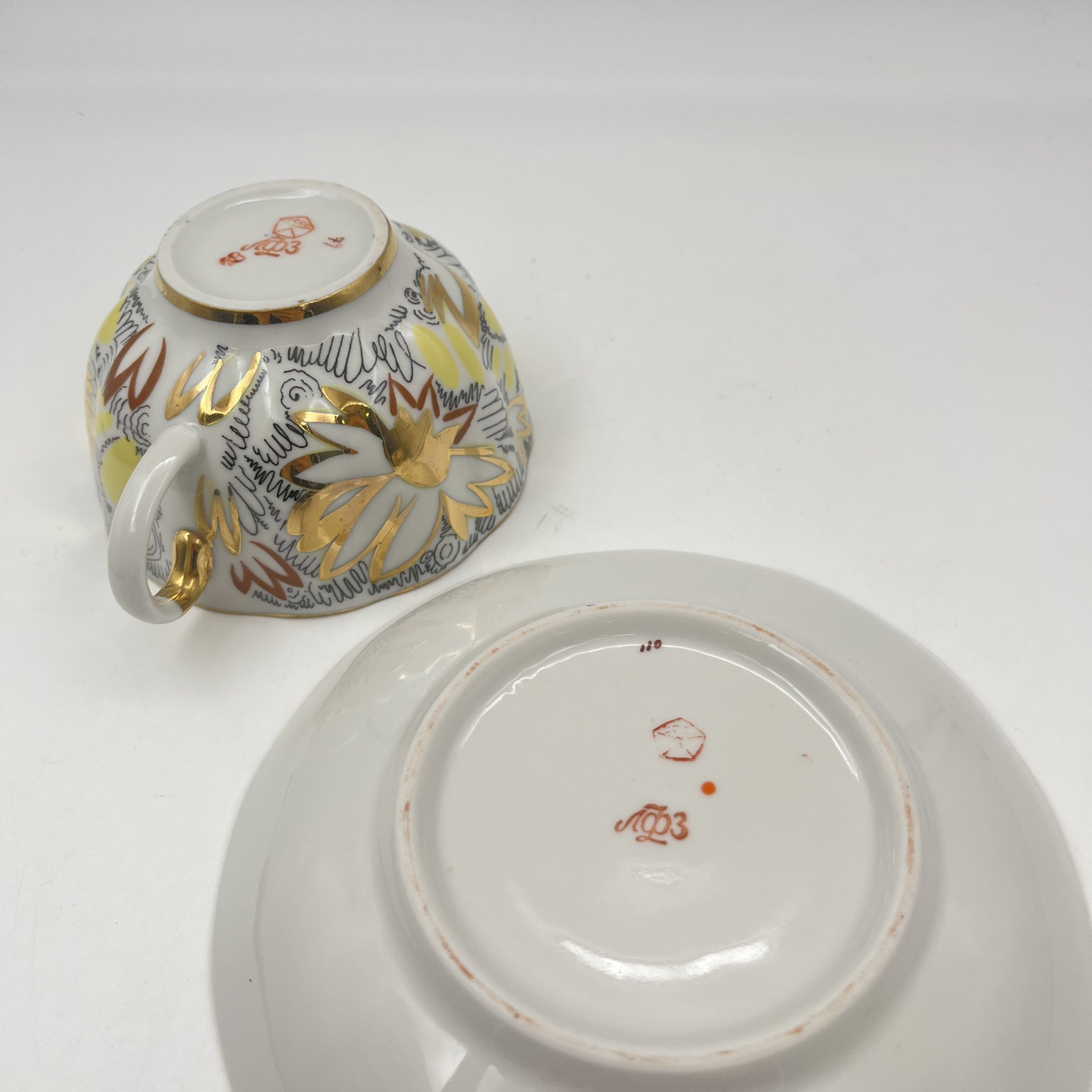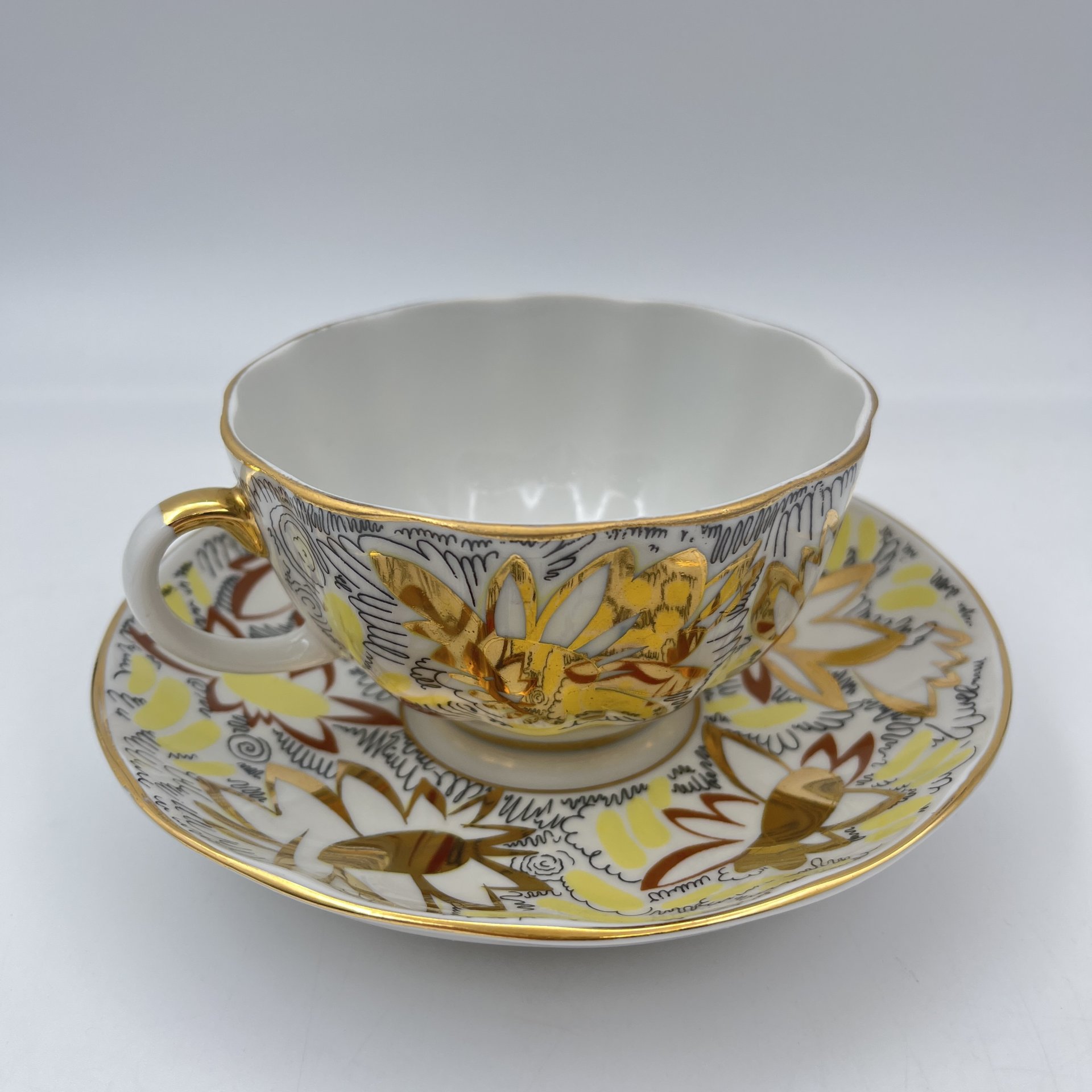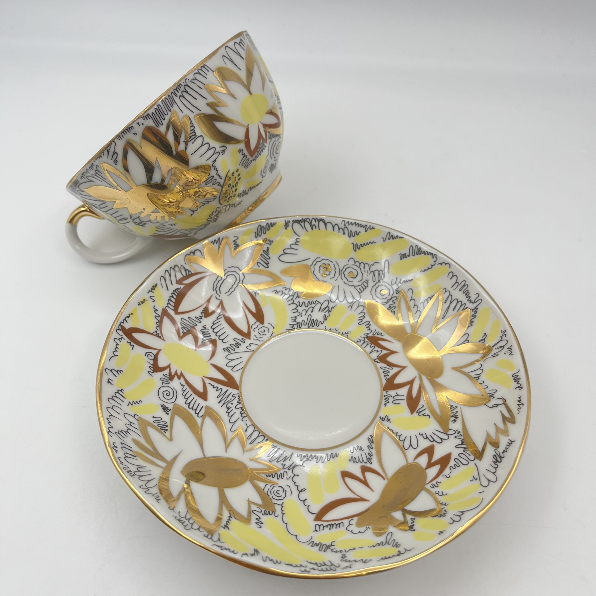Пара чайная "Золотые ромашки", автор росписи Л.И. Григорьева, форма "Тюльпан", фарфор, деколь, золочение, Ленинградский фарфоровый завод (ЛФЗ), СССР, 1970-1986 гг.