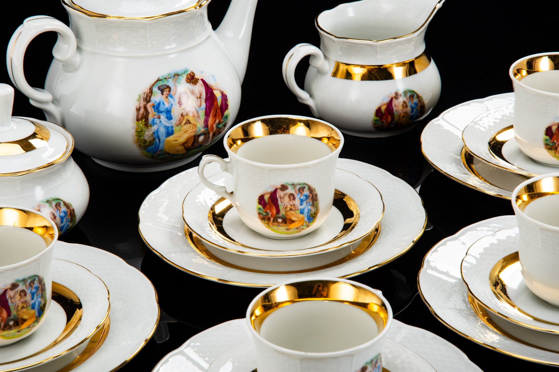Сервиз чайный со стилизованным цветочным декором на 5 персон (19 предметов), завод "Lubiana", фарфор, деколь, золочение, Польша, 1966-1994 гг.