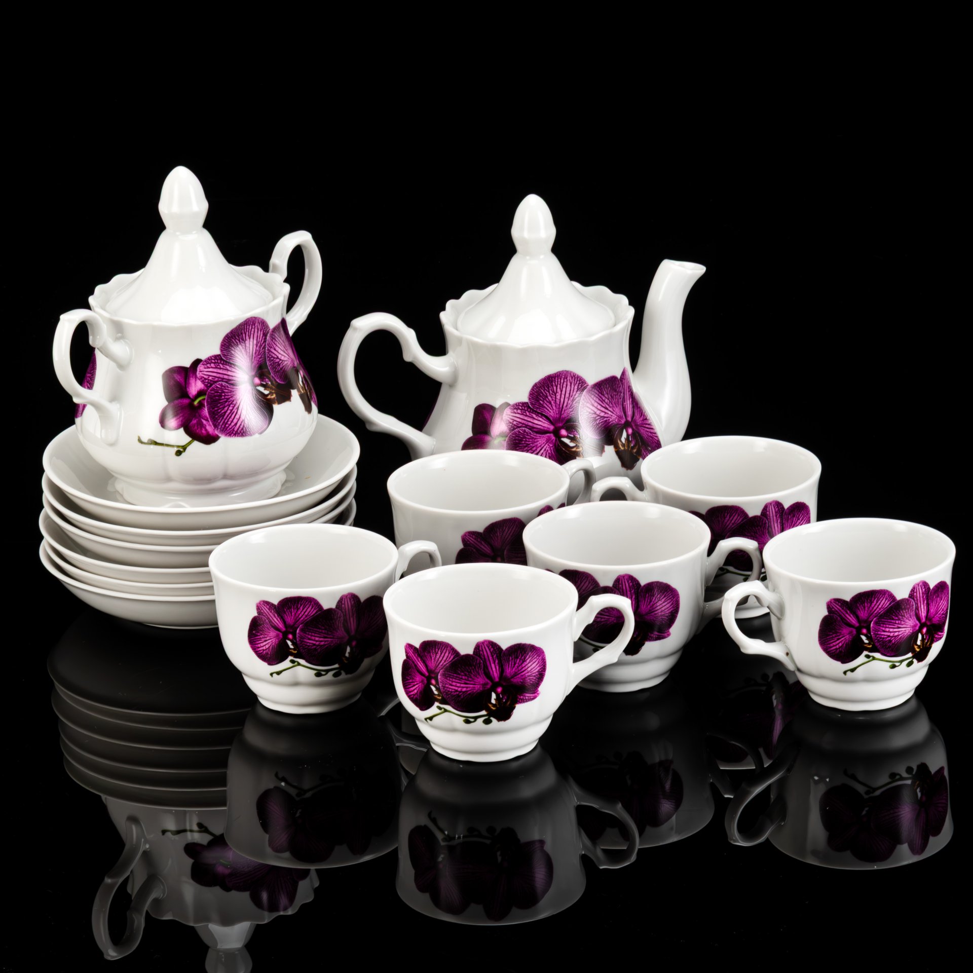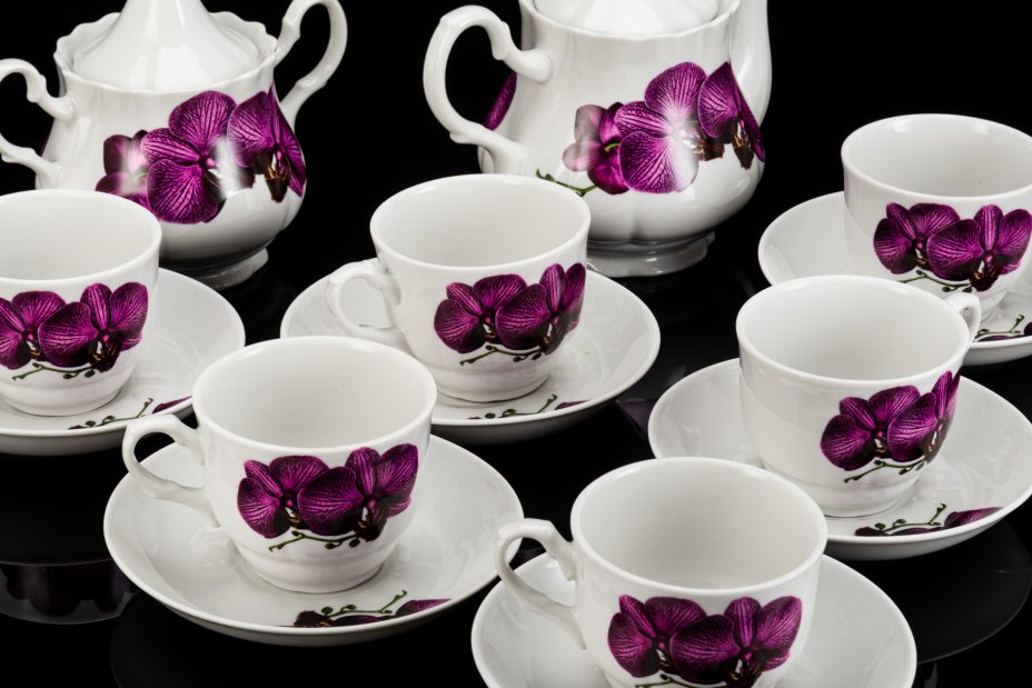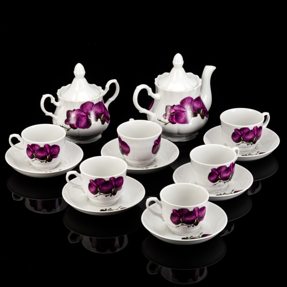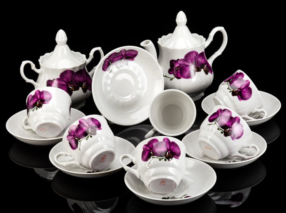 Сервиз чайный с цветочным декором на 6 персон (14 предметов), форма "Ампир", фарфор, роспись, золочение, Дмитровский фарфоровый завод (ДФЗ Вербилки), СССР, 1965-1991 гг.
