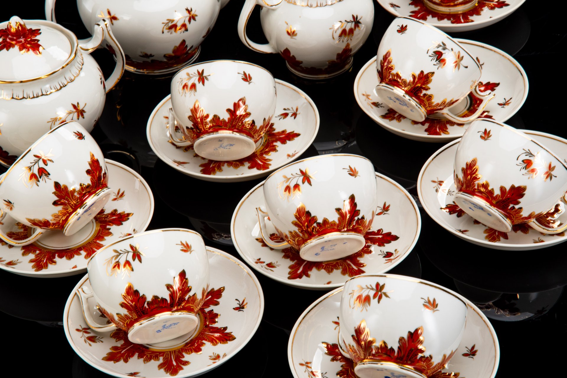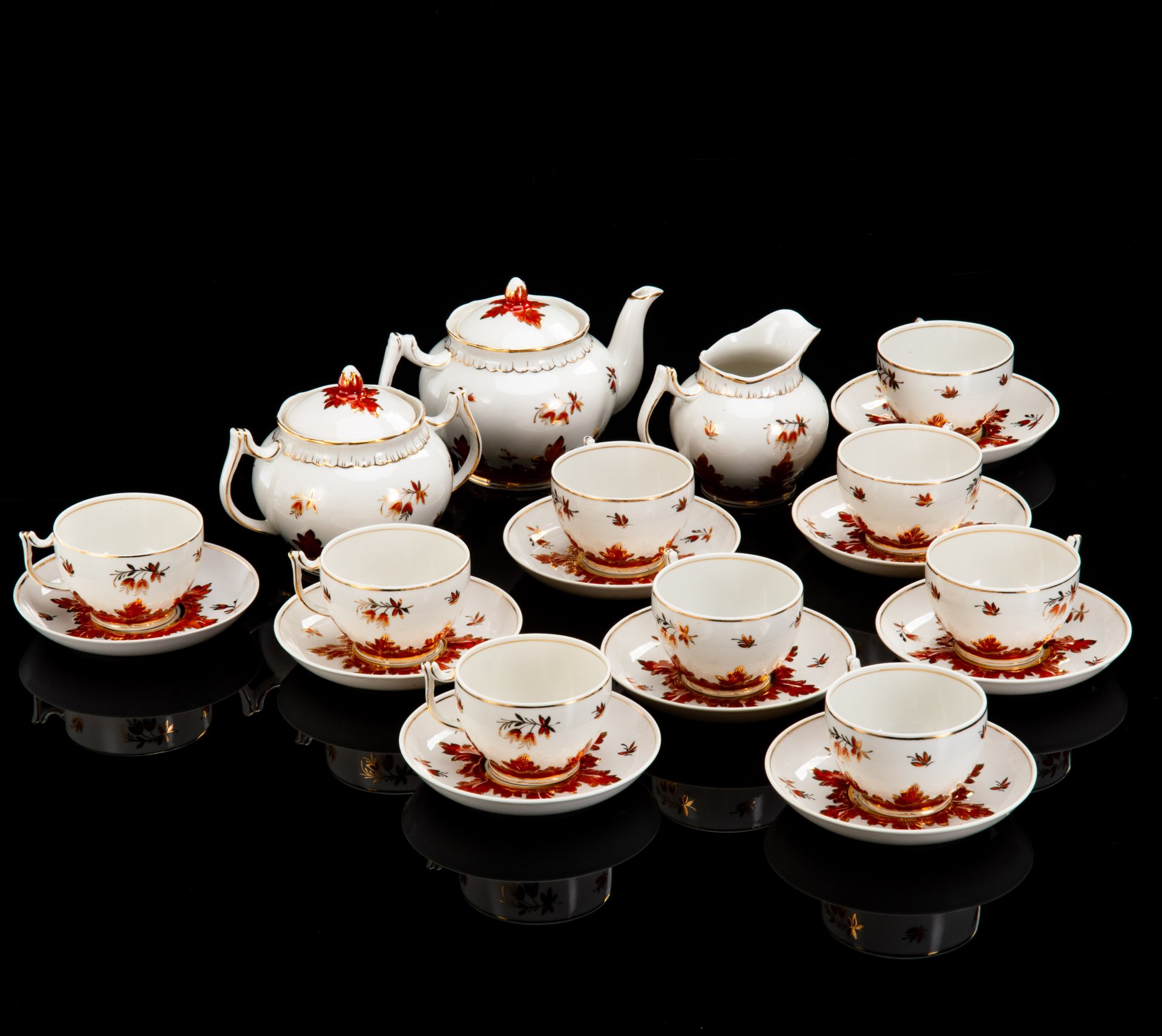 Сервиз чайный "Щедрая осень", на 3 персоны (12 предметов), автор рисунка Н.Б. Гусева, автор формы С.Е. Яковлева, фарфор, роспись, золочение, Ленинградский фарфоровый завод (ЛФЗ), СССР, 1960-1969 гг.