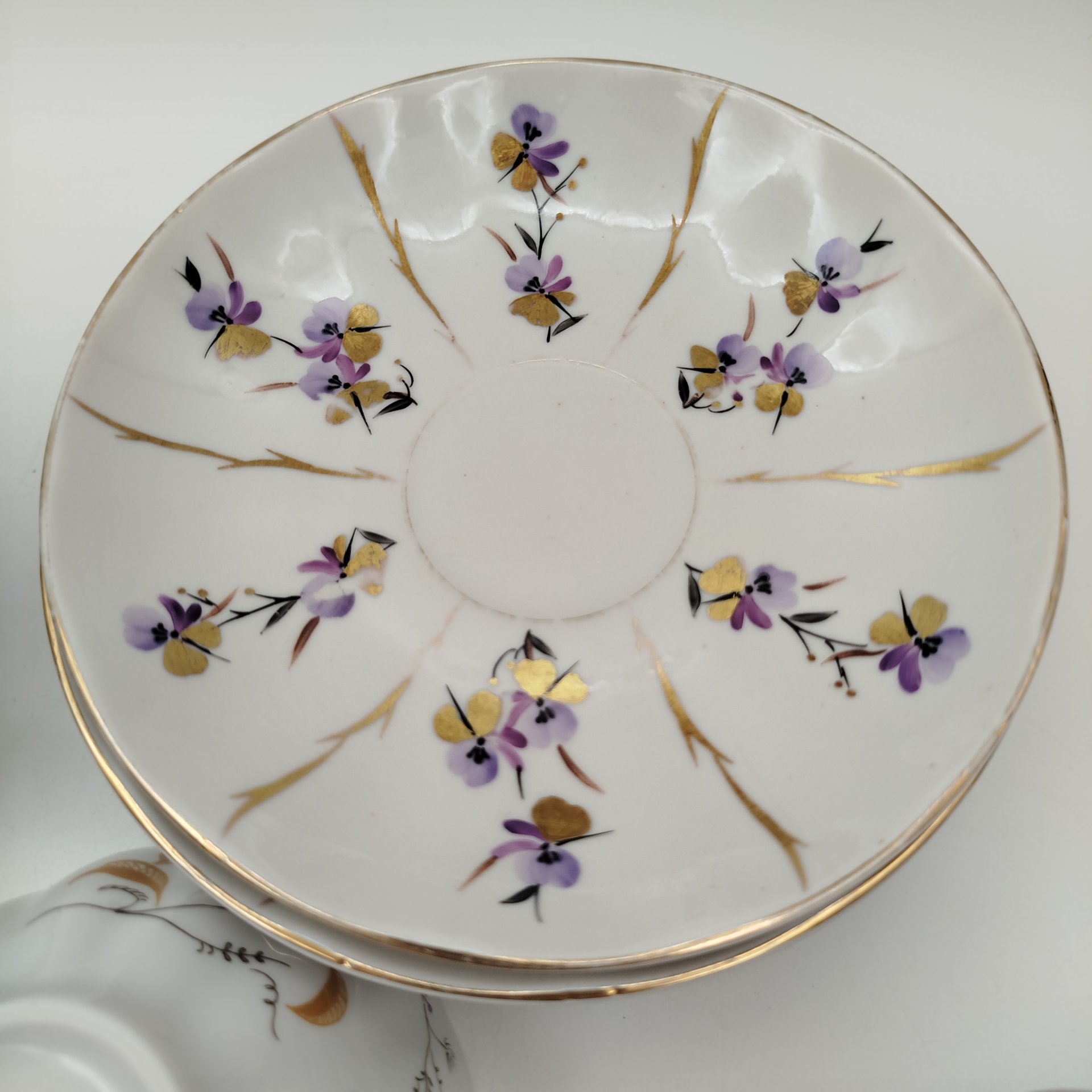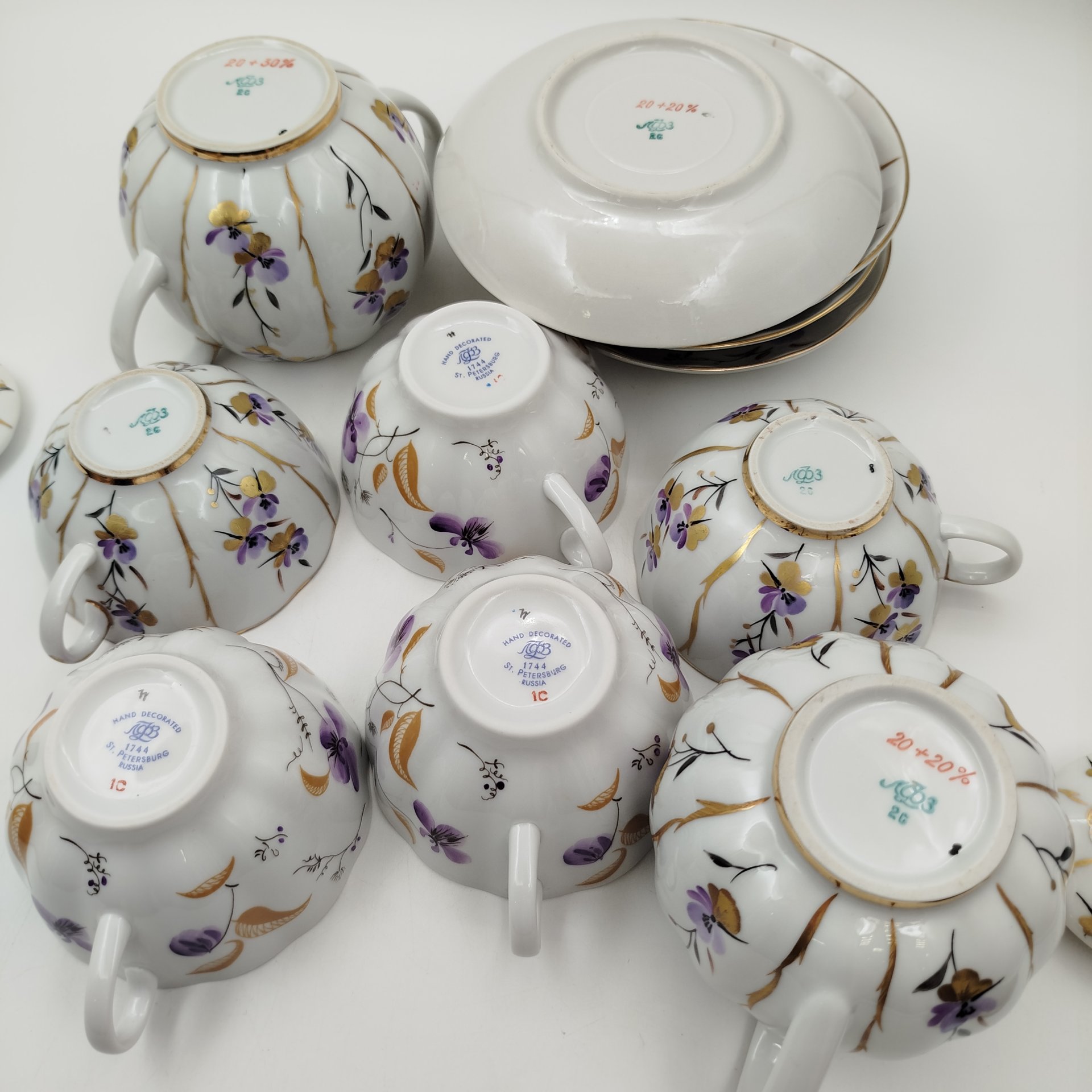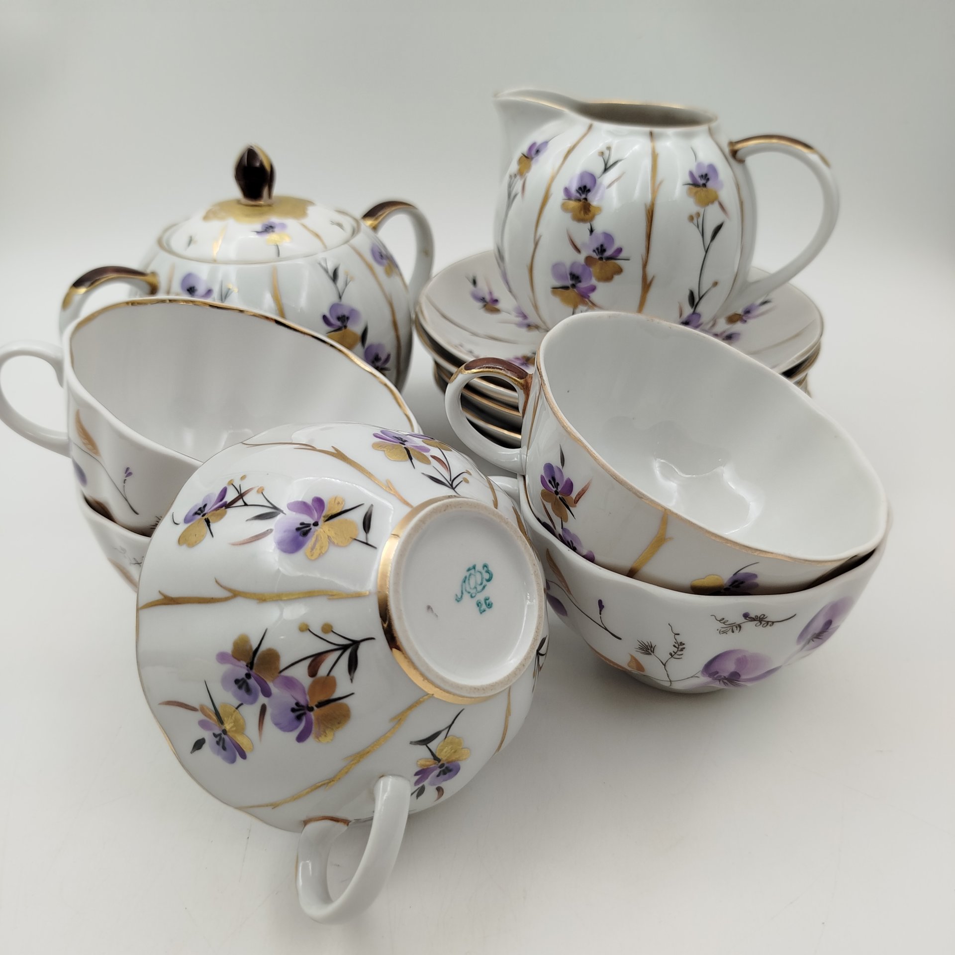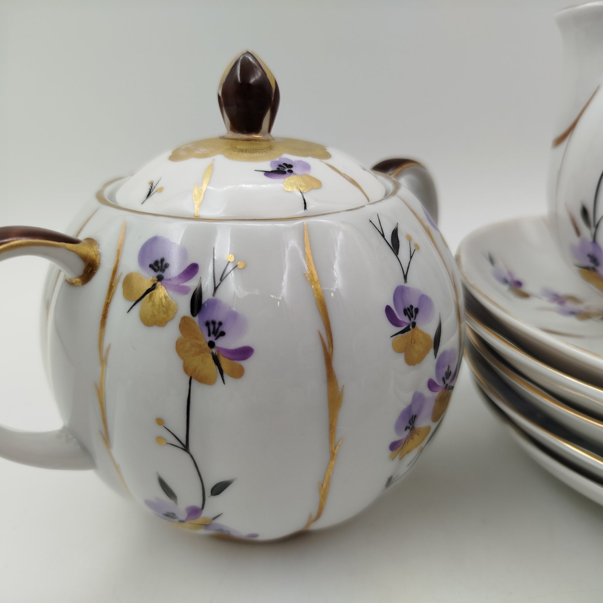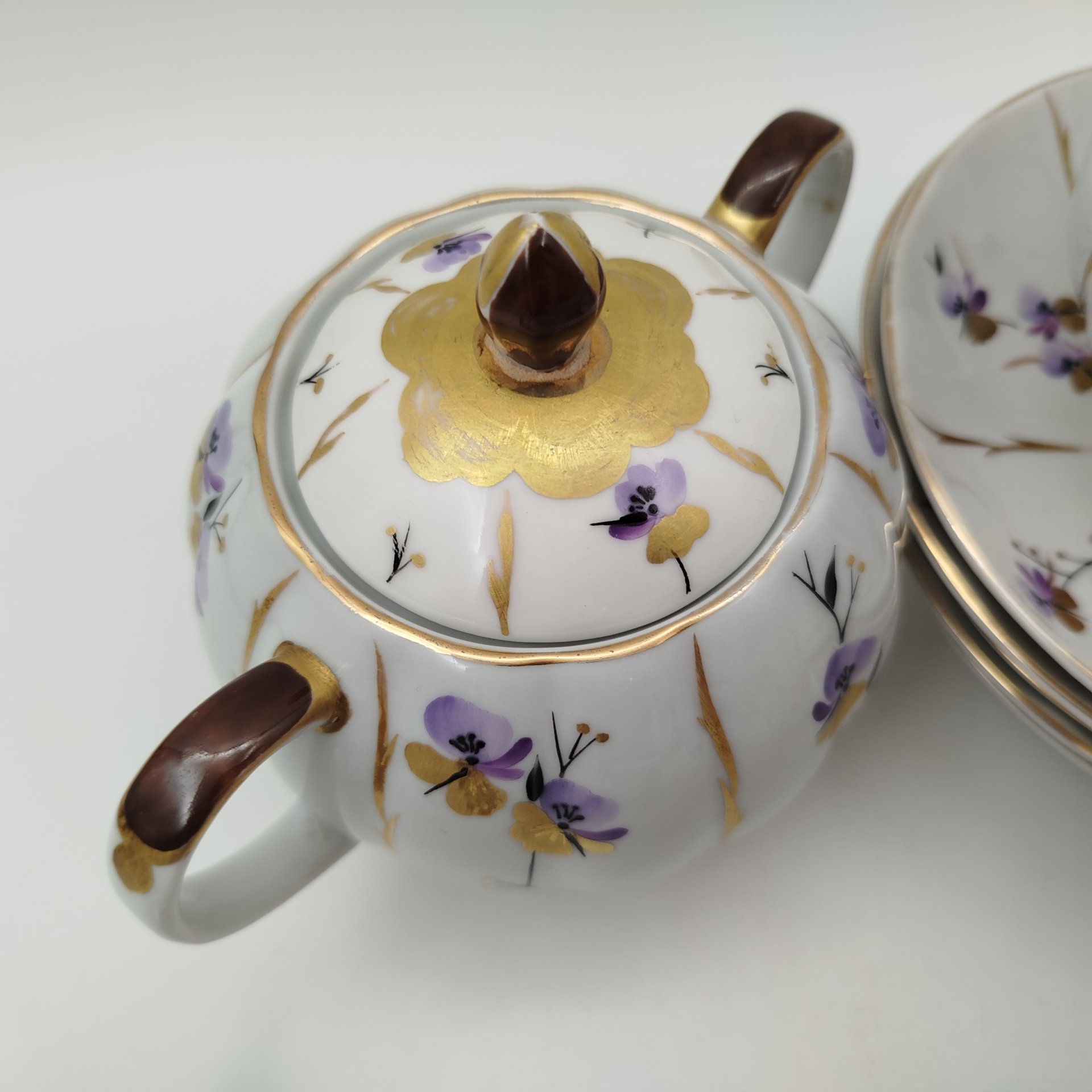 Сервиз чайный "Фиалки" на 5 персон (12 предметов) в подборе, форма "Тюльпан", фарфор, роспись, золочение, Ленинградский фарфоровый завод (ЛФЗ), СССР, 1970-1992 гг.